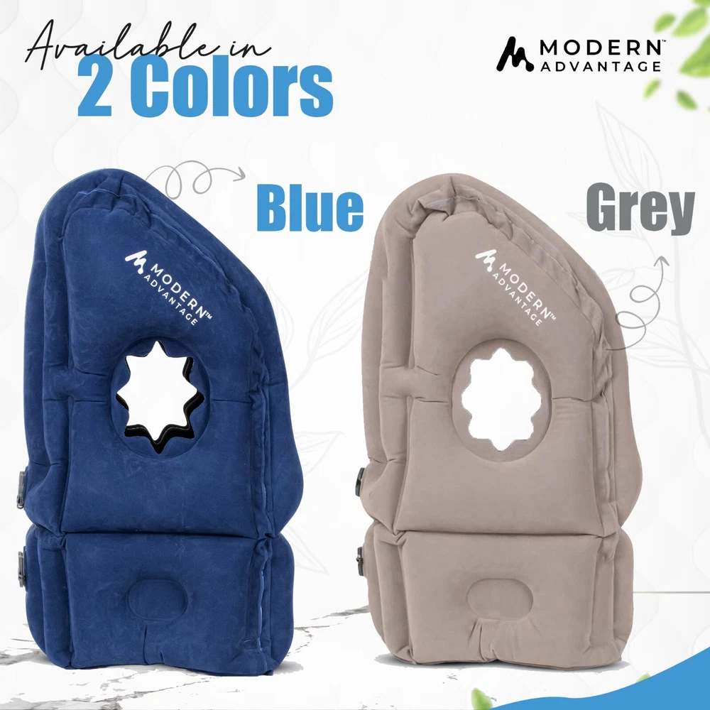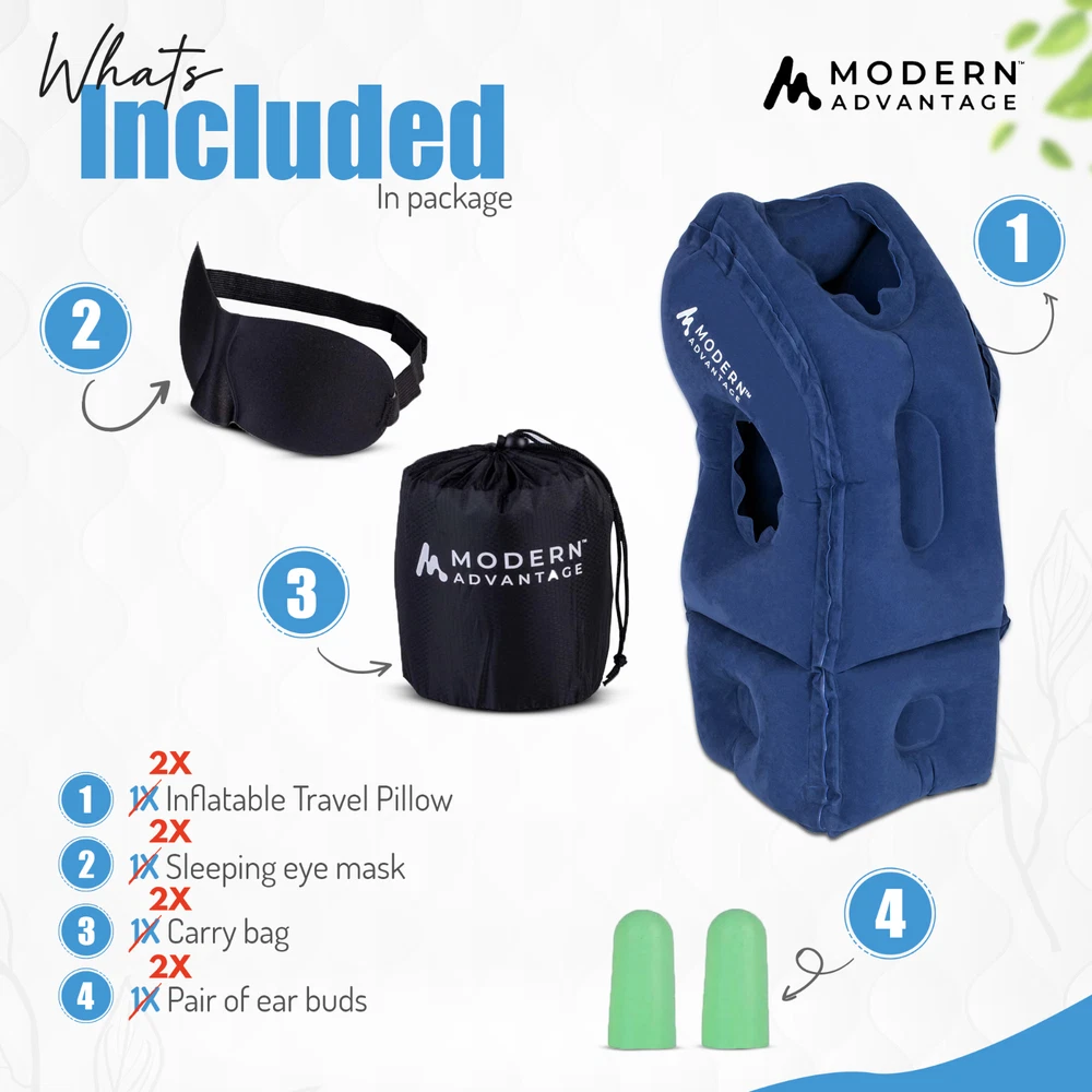 TRANQUILITY ANYWHERE: Experience serene comfort & support on the go with our inflatable travel pillow! Perfect for plane rides and camping trips, our portable pillow makes anywhere feel like home INNOVATIVE & ERGONOMIC: Say goodbye to travel-induced neck pain with our expertly engineered airline pillows with an 8-inch adjustable base for a personalized fit & optimal neck alignment on airplanes DREAMY COMFORT: Velvety smooth PVC flocking finish makes any space feel like first-class, while a star-shaped headrest cradles your head in any position & side hand inserts maximize space efficiency EASY TO USE: Inflate with just a few breaths for almost-instant comfort with air leakage protection to help you find and maintain optimal firmness; deflates in seconds thanks to a quick-release valve INSTANT BLISS KIT: Includes a portable drawstring carrying bag for compact storage on the go, earplugs & a personalizable sleep mask to block out noise and turn any scene into a calm, peaceful setting Package includes: Inflatable Travel Pillow set with 2 portable storage bag for easy carrying, 2 set earplugs for a tranquil environment, 2 sleep mask, and 2 folding instruction booklets for ultimate convenience. Versatile and portable, suitable for various settings including family outings, camping, train or bus rides, car journeys, airplane travel, and office naps. Enhance your sleep experience wherever you are. Note: Wrinkles and initial odor may occur due to PVC materials; inflating and airing out resolves these issues.