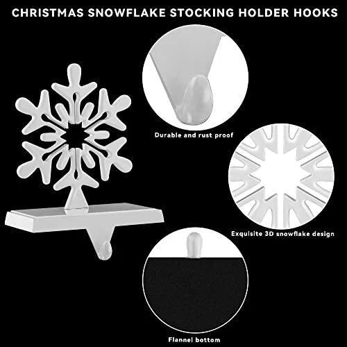 Return Policy Fast Delivery Trusted seller Pack of 4 Christmas Stocking Holders Snowflake Stocking Hangers Mantel Stocking Hooks for Christmas Decoration, White Product Description The set includes: you will receive 4 different styles of Christmas snowflake stocking holder hooks, 1 for each style, and the color is white; various styles and exquisite designs can meet your Christmas decoration needs Christmas stocking holder hooks: during Christmas, you can put your Christmas stockings on the snowflake stocking holder hooks, which is not only practical but also decorative and adds a more festive atmosp Material and size: heavyweight Christmas snowflake stocking clips are made of high-quality metal; counterweight blocks are added on the back, with strong load-bearing capacity; they are placed on the plane very smoothly; t is no need to worry that they will fall down, and they can fully bear the weight of stockings and items in stockings; the size of each snowflake stocking clips is different; please refer to the size drawing for the specific size Applicable places: these Christmas snowflake hanging hooks can be placed on any plane, such as fireplaces, stairs, bookshelves, tables, etc., and then hang your favorite Christmas stockings to play a different decorative effect for these places Ideal gift: these exquisite Christmas snowflake stocking holder hooks are also suitable as a beautiful gift to your friends and family so that they can enjoy this wonderful Christmas with you and leave good memories Shipping Returns Payment Shipping Shipping is FREE to all addresses other than APO/PO boxes in the lower 48 states. All our stock ships from US-based warehouses. Shipped via USPS or UPS (depending on location and package weight) Unless stated otherwise, all orders will ship within 24-72 hours of your payment being processed. Check our feedback to see the great reviews of FAST shipping we offer. Returns Seller does not accept returns Payment We currently accept payment via eBay managed payments only. Once payment is cleared, we will dispatch your shipment within 1-3 business days. Please refer to the "Shipping" tab for more information regarding shipping speed to your destination.