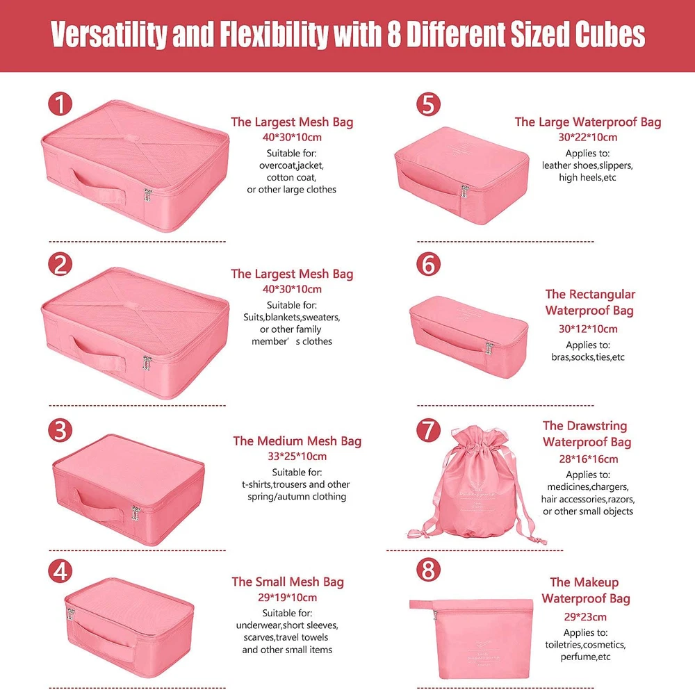 Number of Sets: 8 Number of Items: 8 gtin13: 7445043124185 Additional Features: Durable,Waterproof Recommended Uses For Product: Clothing, Footwear, Cosmetics, Toilet Item Length: Does not apply UPC: 7445043124185 Material Type: Polyester Special Feature: Durable,Waterproof Closure Type: Drawstring, Zipper Brand: Does not apply Item Dimensions L x W x H: 15.75"L x 11.81"W x 3.94"H Shape: Rectangular Item Width: Does not apply Size: One_Size Product Dimensions: 15.75"L x 11.81"W x 3.94"H Type: Does not apply Material: Polyester Color: Peach pink Item Height: Does not apply