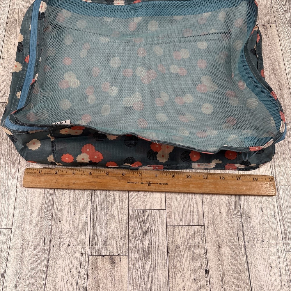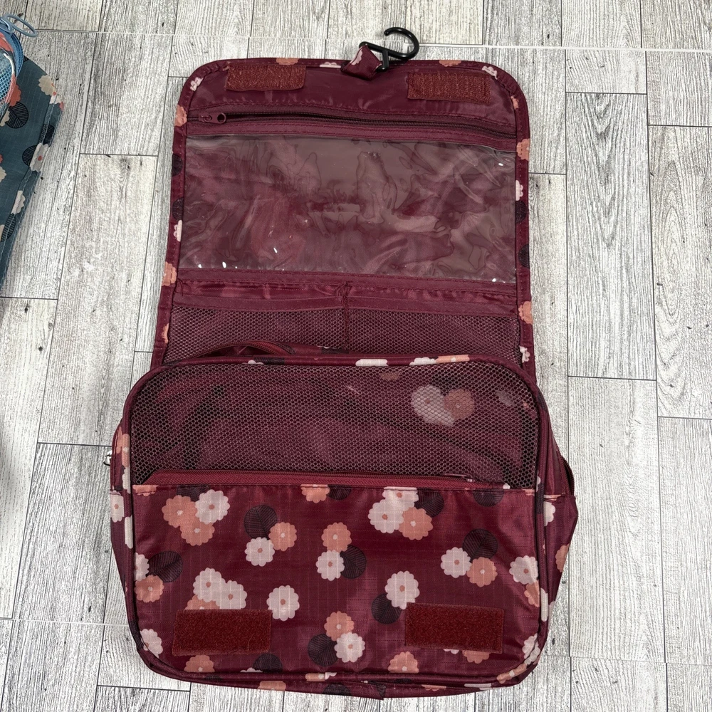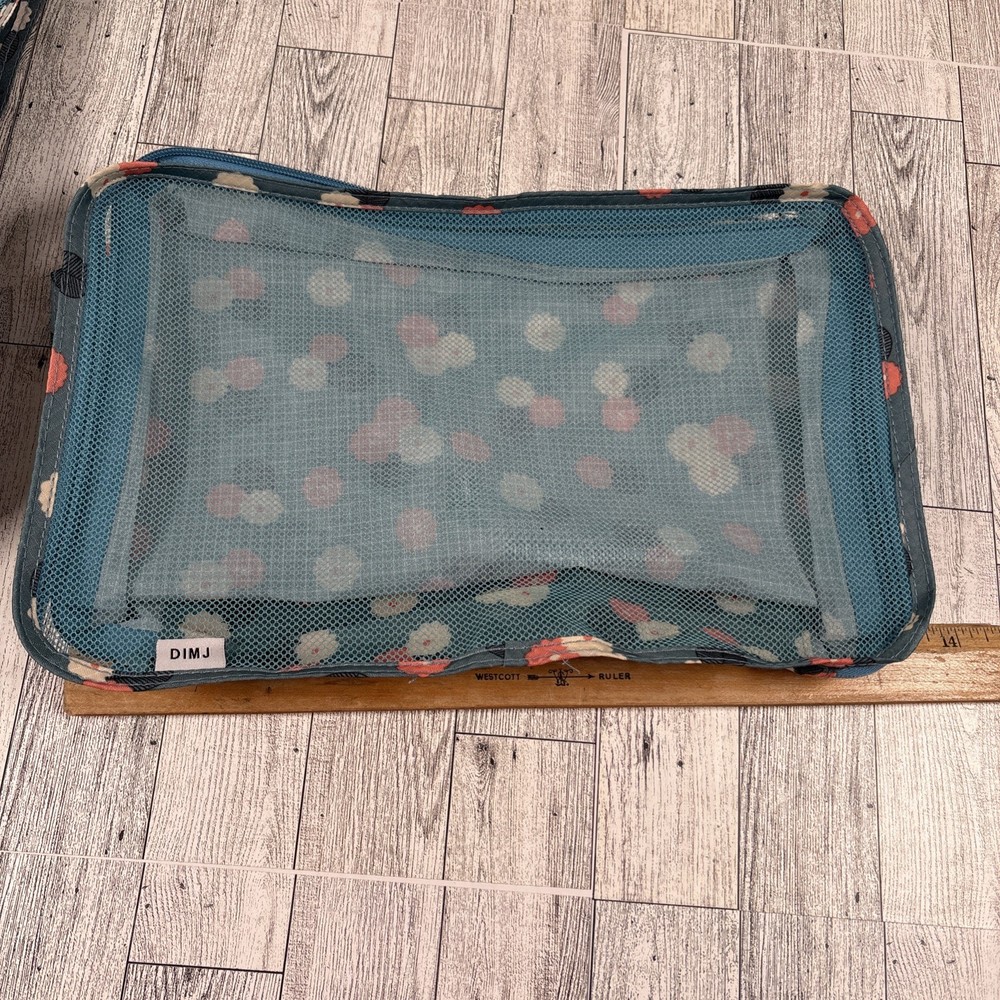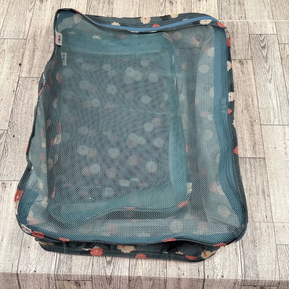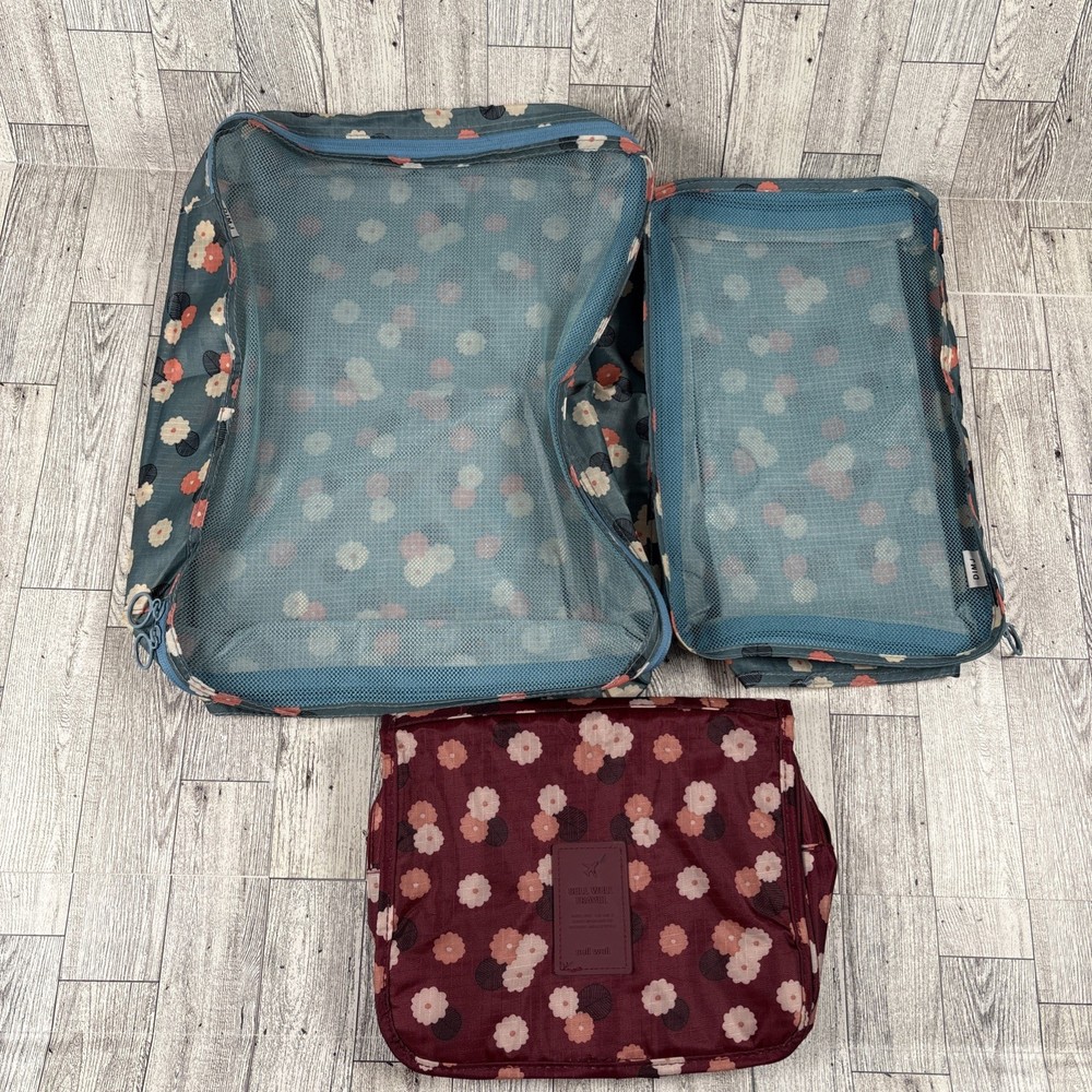 See photos for condition and measurements. This Packing Cubes Set of 2 in blue floral with a Toiletry Bag in maroon floral. The perfect travel organization solution for your next adventure. Made of lightweight nylon material with a mesh pattern, these rectangular-shaped storage bags come in assorted sizes . The colorful design is both functional and stylish, featuring a zipper closure for secure storage. The set includes a toiletry bag, making it easy to keep all your essentials in one place while on the go.