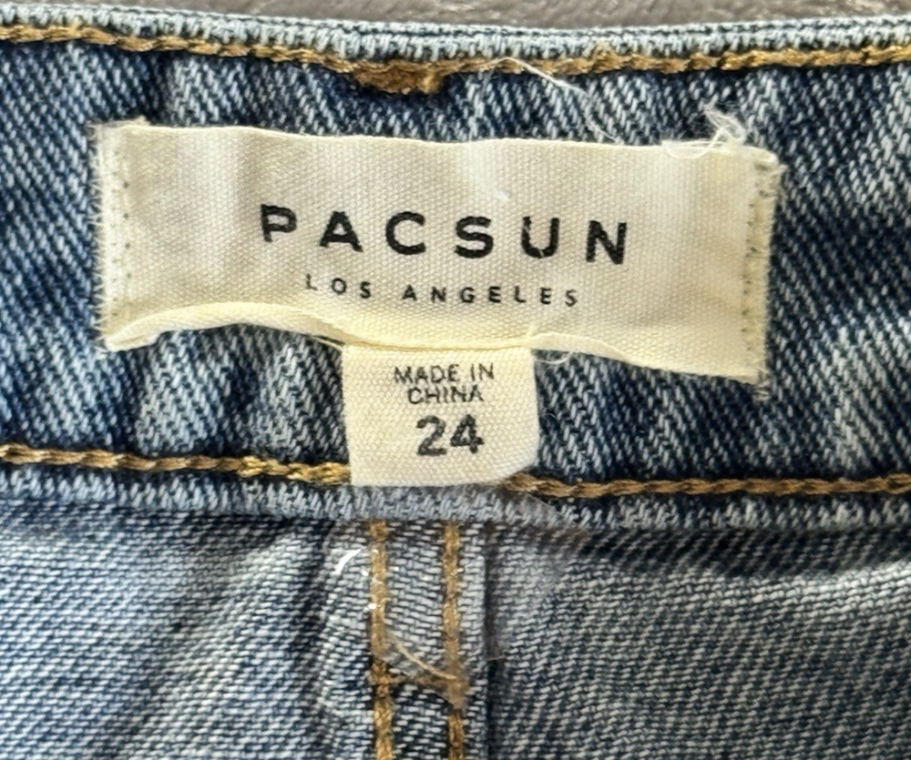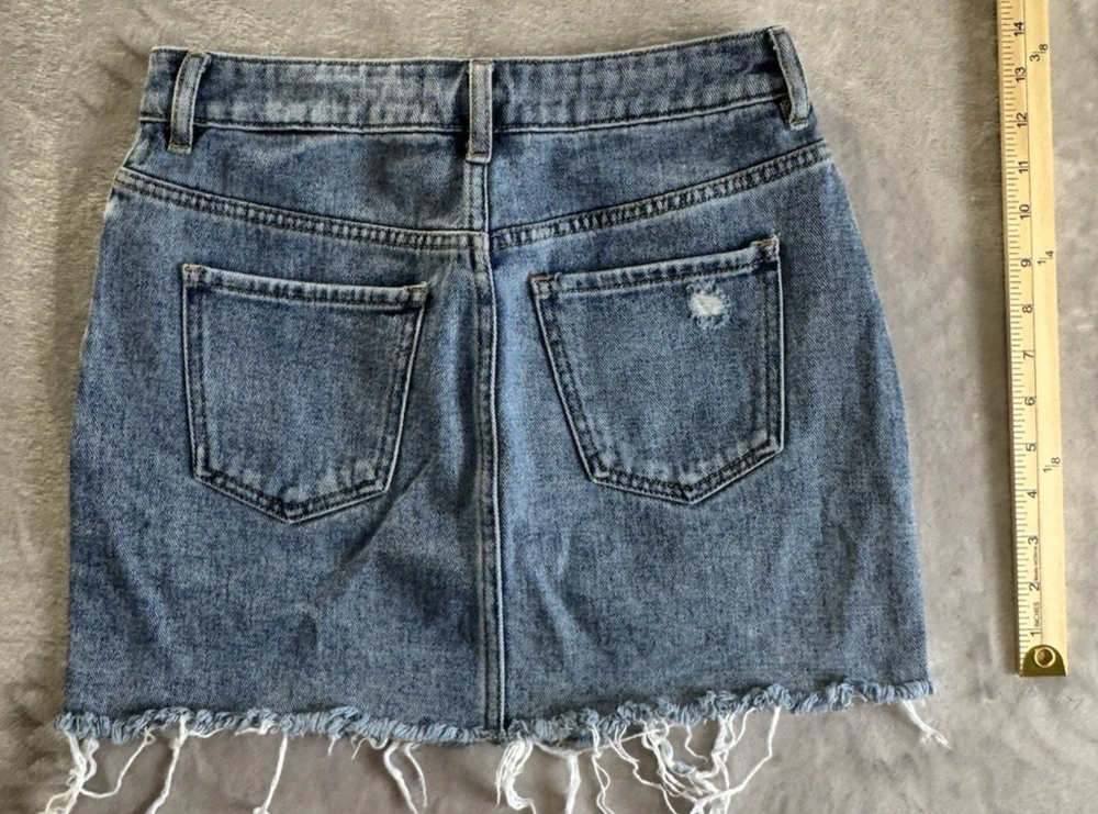 Elevate your casual denim look with this chic PacSun denim mini skirt. The frayed raw hem adds a trendy touch to the classic blue denim skirt. Perfect for a day out, this skirt features a zip closure, pockets and button accents for added style. Made of high-quality cotton, this denim mini skirt is a must-have for your wardrobe. The skirt is available in size 24 and is suitable for regular size types.