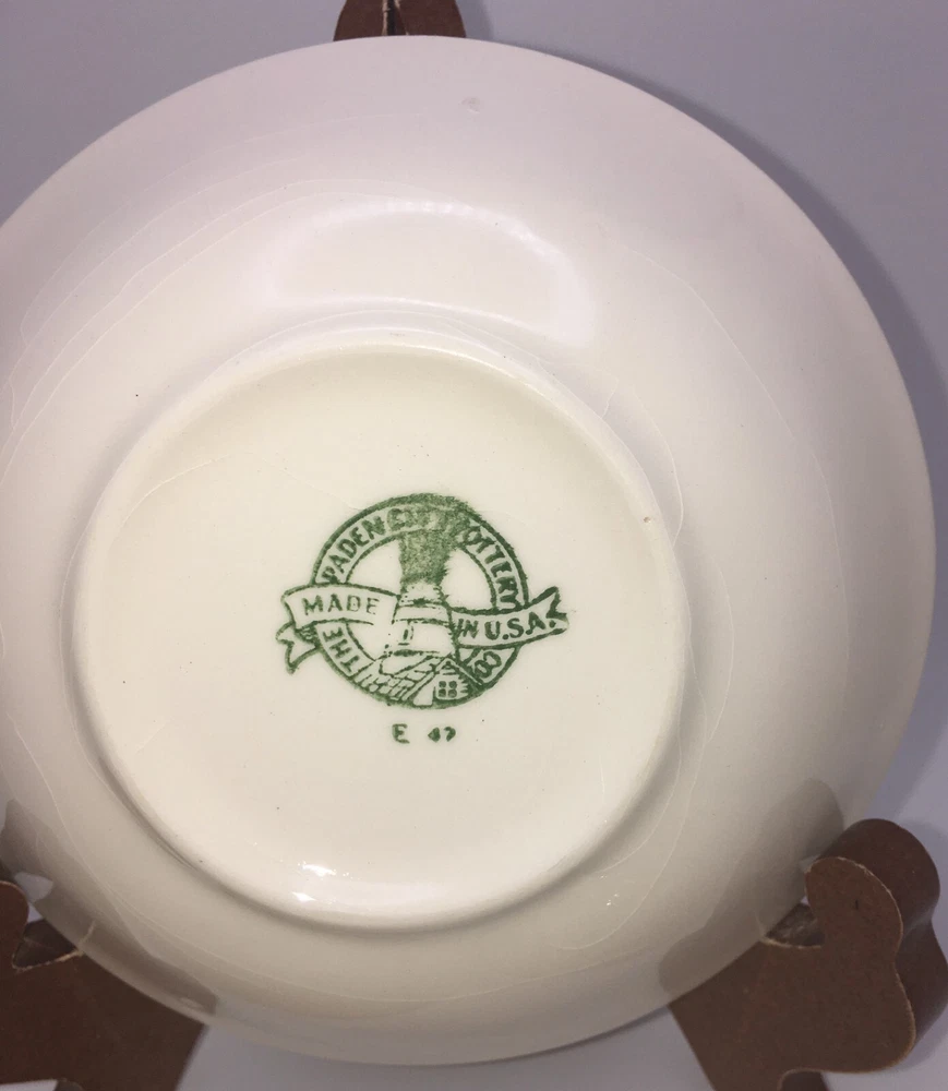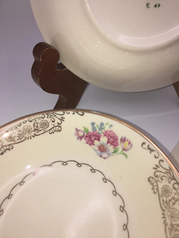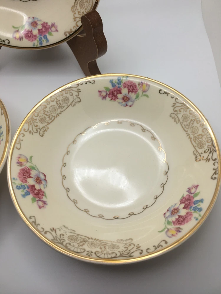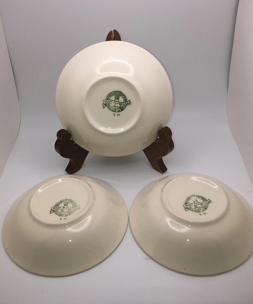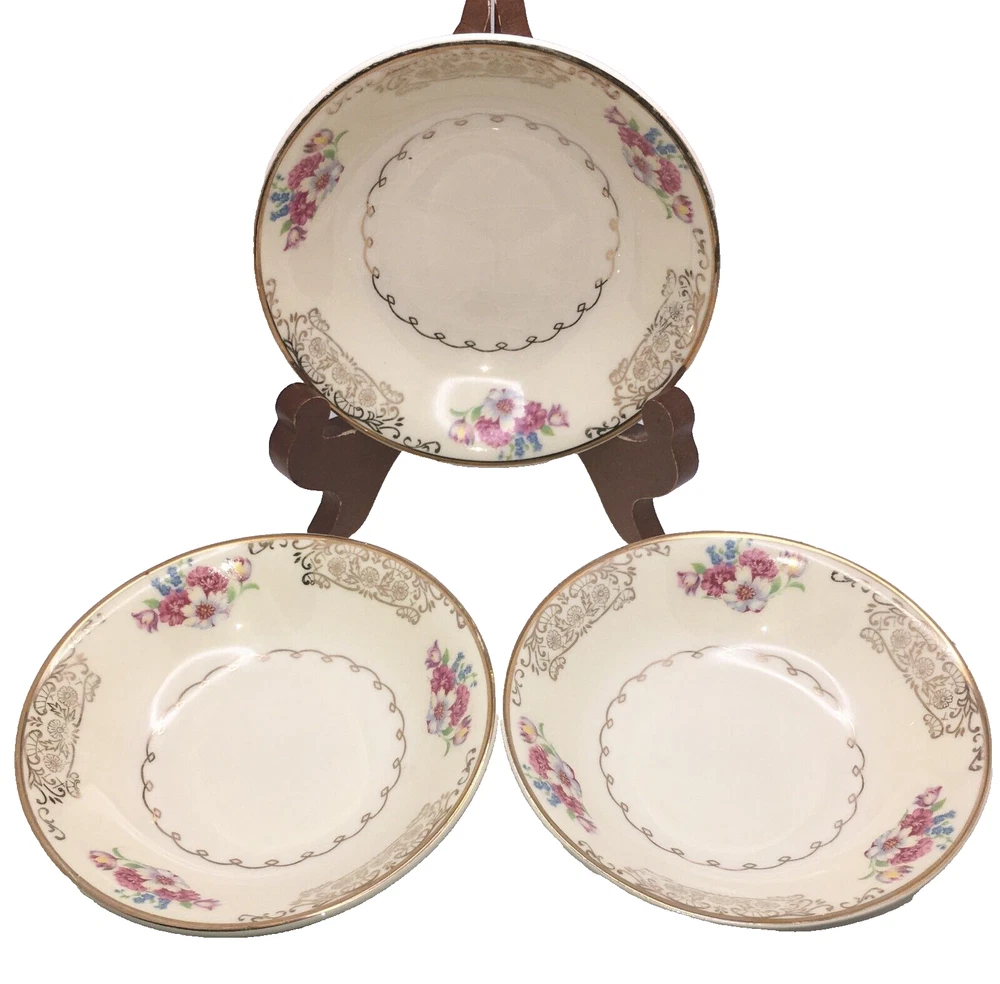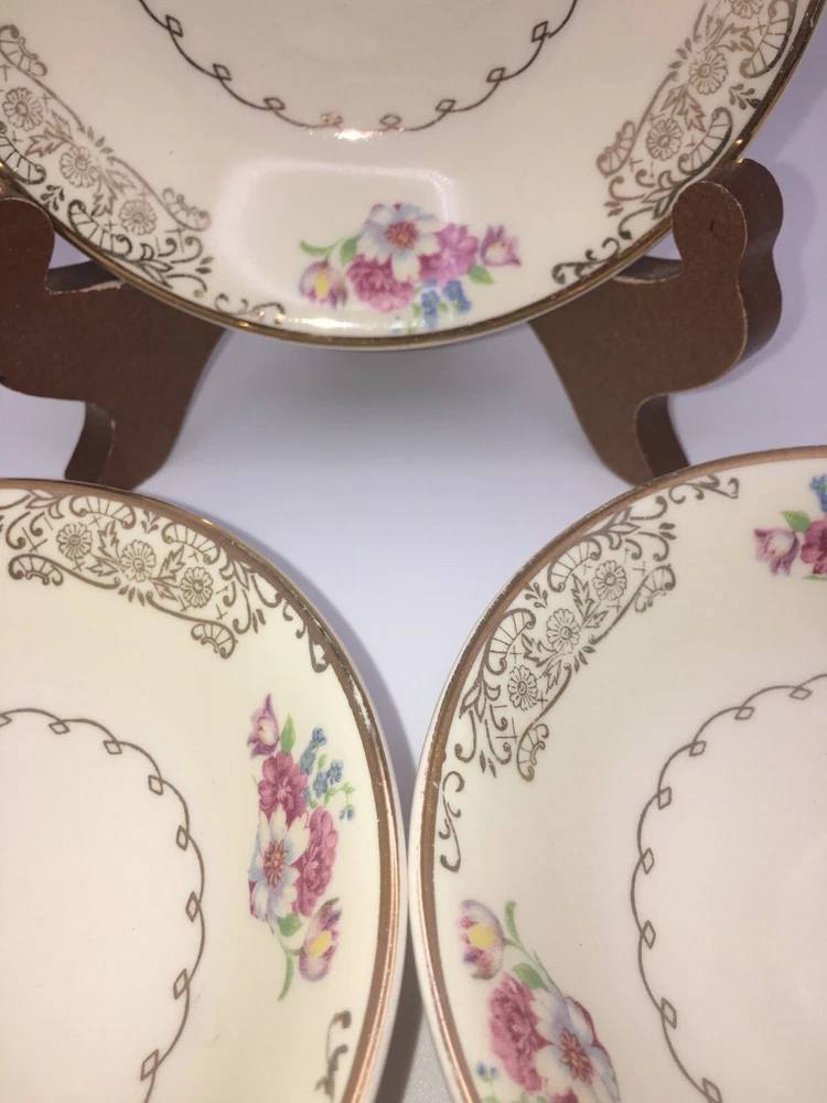 Lot of THREE Berry/Fruit/Sauce Bowls by Paden City Pottery Co Made in U.S.A. "Gold Lynn" pattern Lovely Gold trim and inlay pattern Measure 5" diameter Gold trim and inner ring ~ Floral bouquet design with gold inlay pattern in between Ivory background - Pink, white, blue, yellow flowers Marked "Paden City Pottery Co. Made in U.S.A. and numbered E47 Thank you for shopping with Daisy! Great condition. No chips or cracks. There is some crazing. Please examine pictures and zoom in for clarity. My pics are part of my description. Message me if you have questions. Carefully packed and shipped.