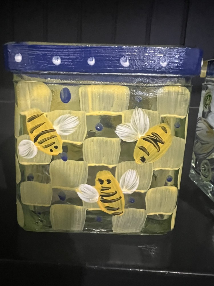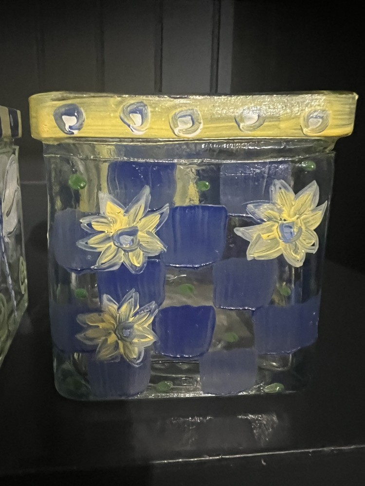 These painted glass candle votive holders feature a square shape and a floral pattern, bee and Dragon fly making them suitable for all occasions and any room decor. They come in a set of three small-sized holders, hand-painted with multicolor flowers and bees and dragon flys on a glass material. The holders can be used with votive candles to create a warm ambiance, but candles and flowers are not included with the product. Perfect for adding a touch of floral charm to your home decor. 3” X 3” x3” size Preowned Tea light candles not included.