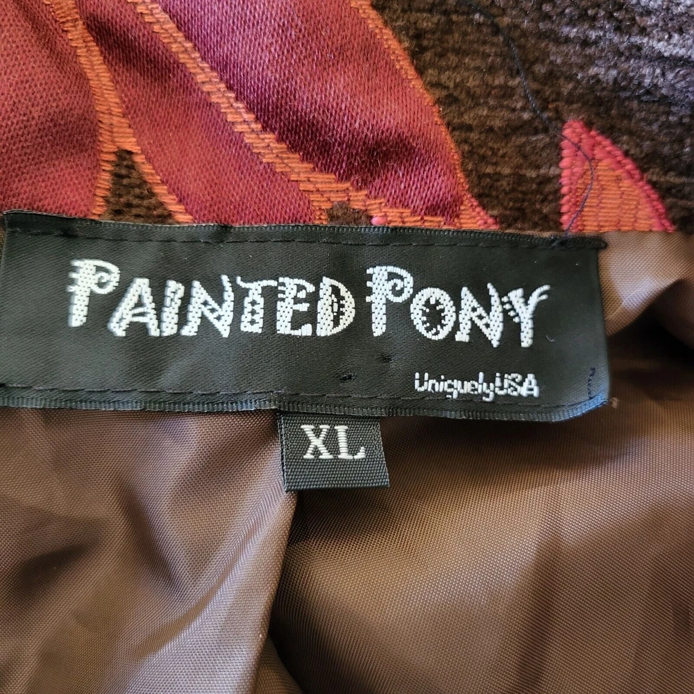 Size XL. Length 22". Pit to pit 23". Arm length from shoulder 30". In good preowned condition. Painted Pony Women's Tapestry Jacket is a must-have for any bohemian-inspired wardrobe. The multicolor brown, red, and orange floral pattern and quilted accents make it a unique piece that will make any outfit stand out. The jacket is made from a rayon blend knit fabric and features a collared neckline and shoulder pads for a comfortable fit. It is perfect for any occasion, whether for travel, casual wear, or work. The jacket is short and has long sleeves, making it suitable for any season. The lining is made from polyester.