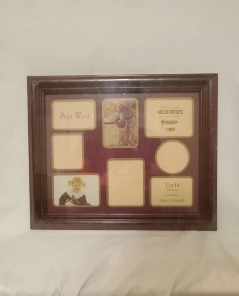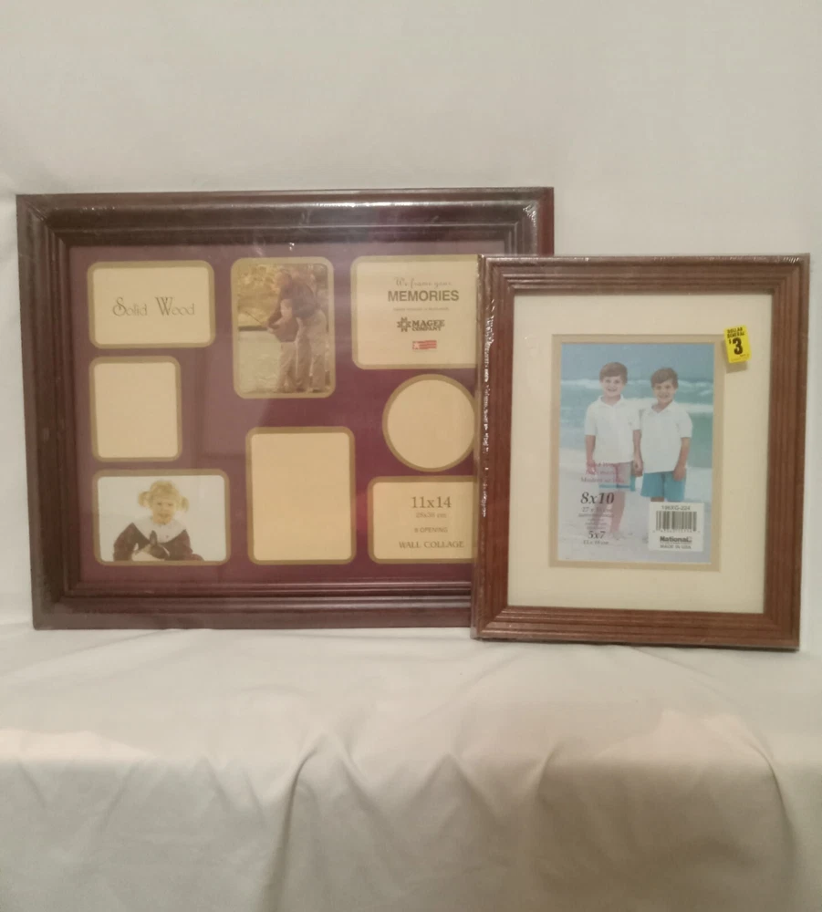 Display your cherished memories with this lot of 2 modern various sizes photo frames. The frames feature a solid wooden frame and a plain design with a glass front, perfect for all occasions and suitable for portrait orientation. 1 frame can hold from one to 8 photos the other is for single photo and is made with high-quality materials, including a sturdy wooden edging and a spacious interior. These frames are perfect for adults and can be easily mounted on a surface or placed on a shelf. The rectangular shape and size of them make them a versatile addition to any home decor. Remember to personalize your photos before displaying them in these frames. 1 11x14" family album. holds 8 photos 1 8x10 portrait frame. 1 photo