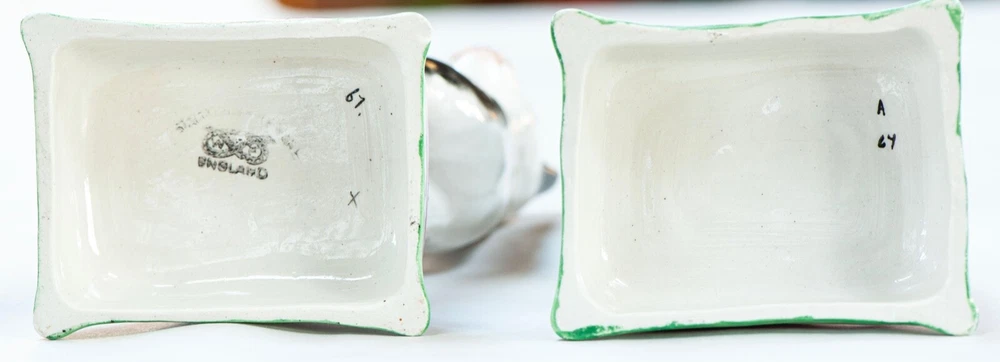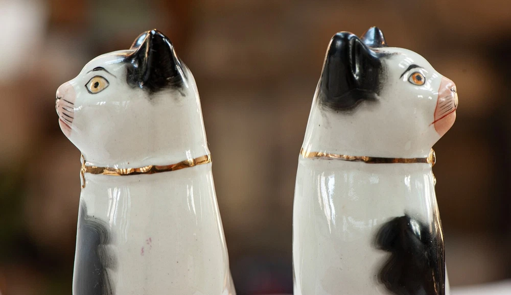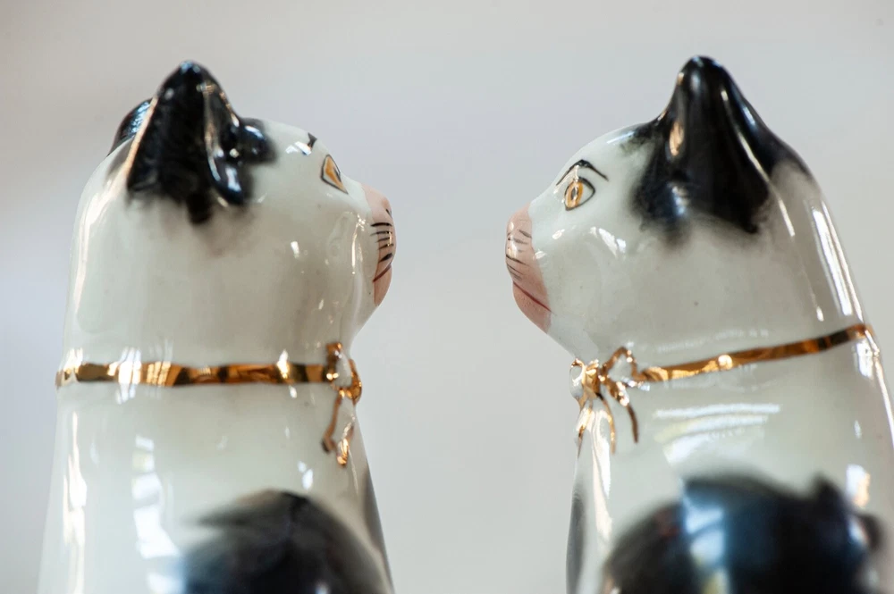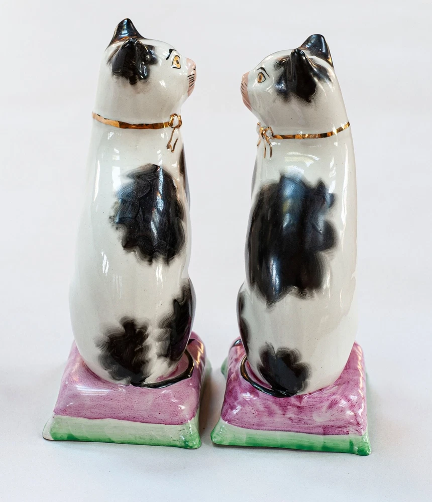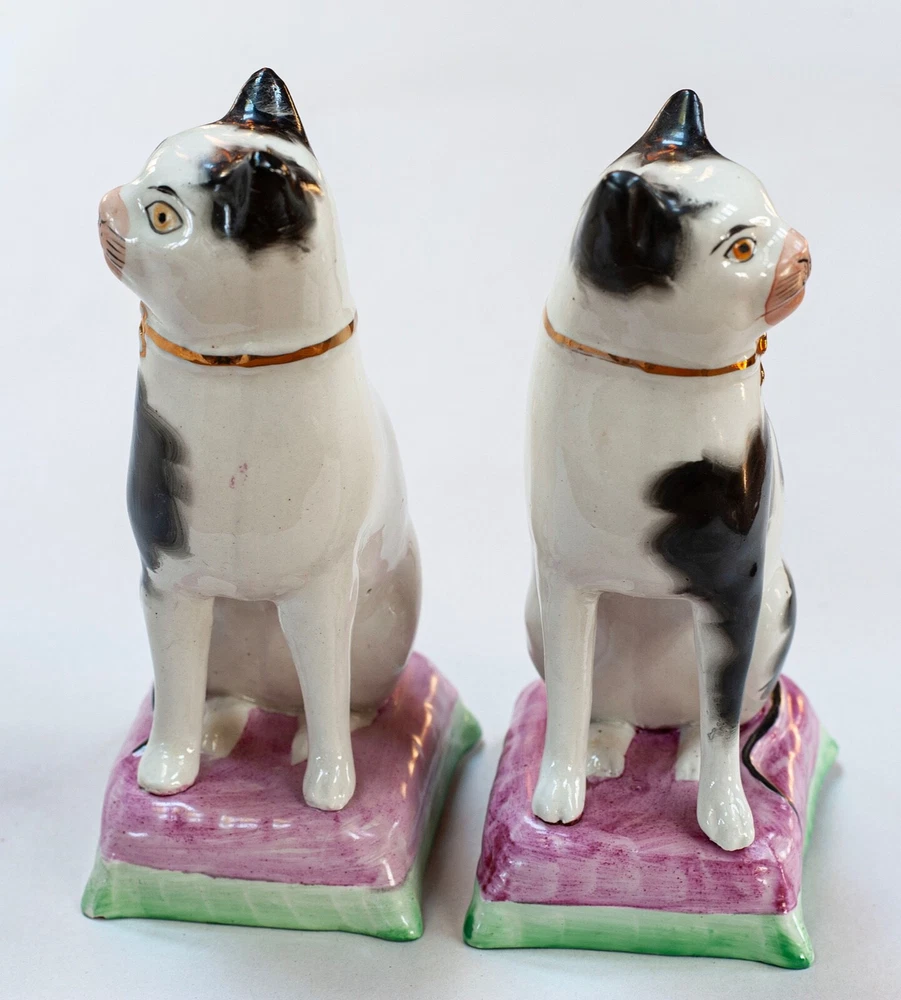 This is a stunning pair of antique Staffordshire porcelain mantle cats. Made in England, these cats bring a touch of elegance to any home decor. The intricate hand-painted details and unique colors of black, white, pink, green, and gold make these cats a true work of art. These mantle cats are a rare find and would make a valuable addition to any collection of other antiques. The cats are in excellent condition and have been well preserved over the years. Their style and design are perfect for adding a touch of old-world charm to any room in your home. Kept in curio cabinet. Each cat 7" tall 4" wide. No Crazing, cracks, or repairs. Shipped double boxed.