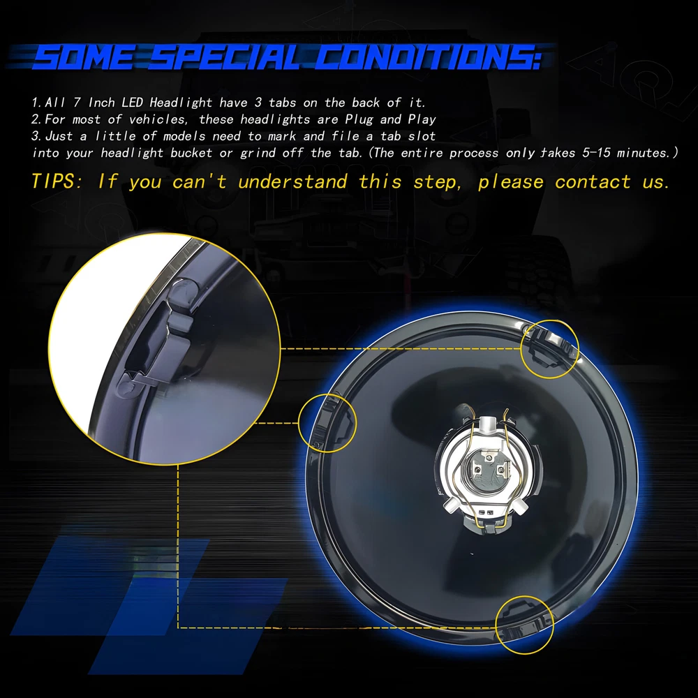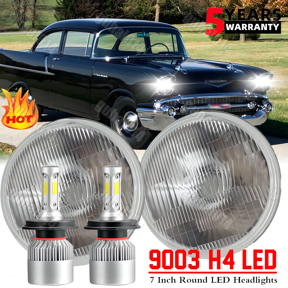 7" Inch Round Diamond Crystal Clear Glass Lens / Headlight Conversion Kit contains everything you need to upgrade your headlights to the newest LED headlight technology while keeping that classic look! -Made with High Quality Glass Lenses - NOT cheap plastic! -Housing has Removable bulb sockets for you to install the new LED bulbs! -Direct Plug & Play design (certain vehicles will require slight modification) -Professional Installation is highly recommended -Warranty 5 years Pair (2 Bulbs Right And Left) 7" Inch Diamond Crystal Clear Semi Sealed Beam Glass Lens Housing Headlights. This Pair Of Headlights Includes 70W Super White LED H4 Light Bulbs. These Headlights Have A Clean Custom Look But Fit Into The Stock Buckets And Plug Into The Stock Wiring Without Modification. These Light Up 500 Percent Brighter And Whiter Than The Standard Stock Sealed Beam Incandescent Headlight Bulbs. These Have The Original 3 Prong Plug Design On The Back So They Will Plug Directly Into The Original Wiring Harness. These Will Fit Any Car Or Truck That Has 2 Round Glass Headlights That Are 7" Inches. H4 LED Bulbs Specifications -Color: 6000K Cool White -Power Consumption: 80 Watt -Luminosity: 6,000 LM -360 Degree / P2 Series CSP Chip Perfect Beam Angle -H4 - Dual Beam Function (You will have HIGH AND LOW!) -500% Brighter than Stock Halogen -Built in IC Circuit (Current Regulator)-Prevents LED Damage From Voltage Variations & Spikes. -Lifespan: 50,000 Hours -Operating Voltage: DC 12V / 24V -Amperage: 1.9A - 2.9A -Maintenance free, Waterproof IP67, Shockproof -Warranty 5 years Contents: - 2x Headlight Housings - 2x H4 LED Bulbs (Hi/Lo Dual Beam)