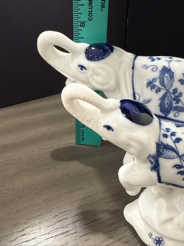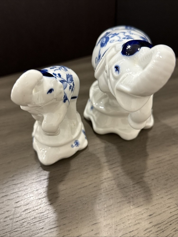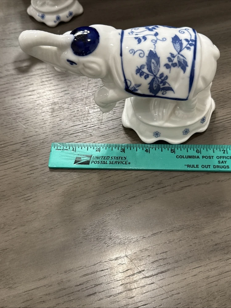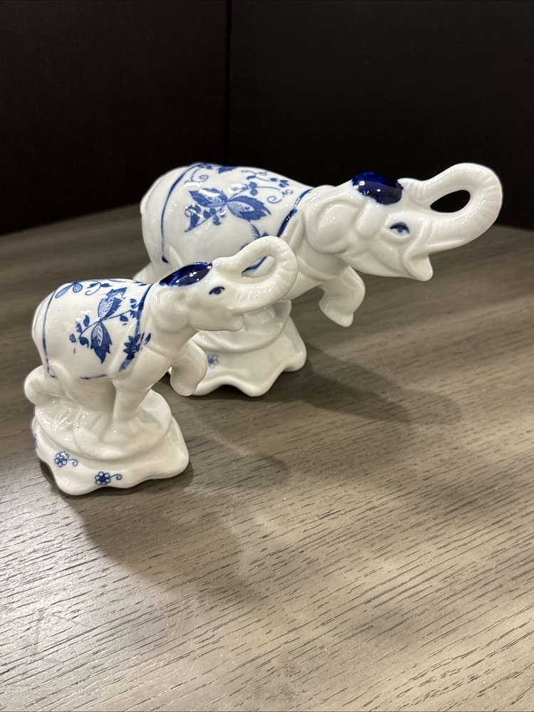Charming pair of vintage porcelain elephant figurines in classic blue and white. Each elephant features a floral patterned blanket and raised trunks—symbolizing good luck and prosperity. • Material: Porcelain • Design: Blue floral on white, chinoiserie-inspired • Markings: Unmarked • Condition: Excellent vintage condition with no chips, cracks, or repairs (please see photos) • Dimensions: see photos. Perfect accent for collectors of elephant décor, blue-and-white porcelain, or chinoiserie style.
