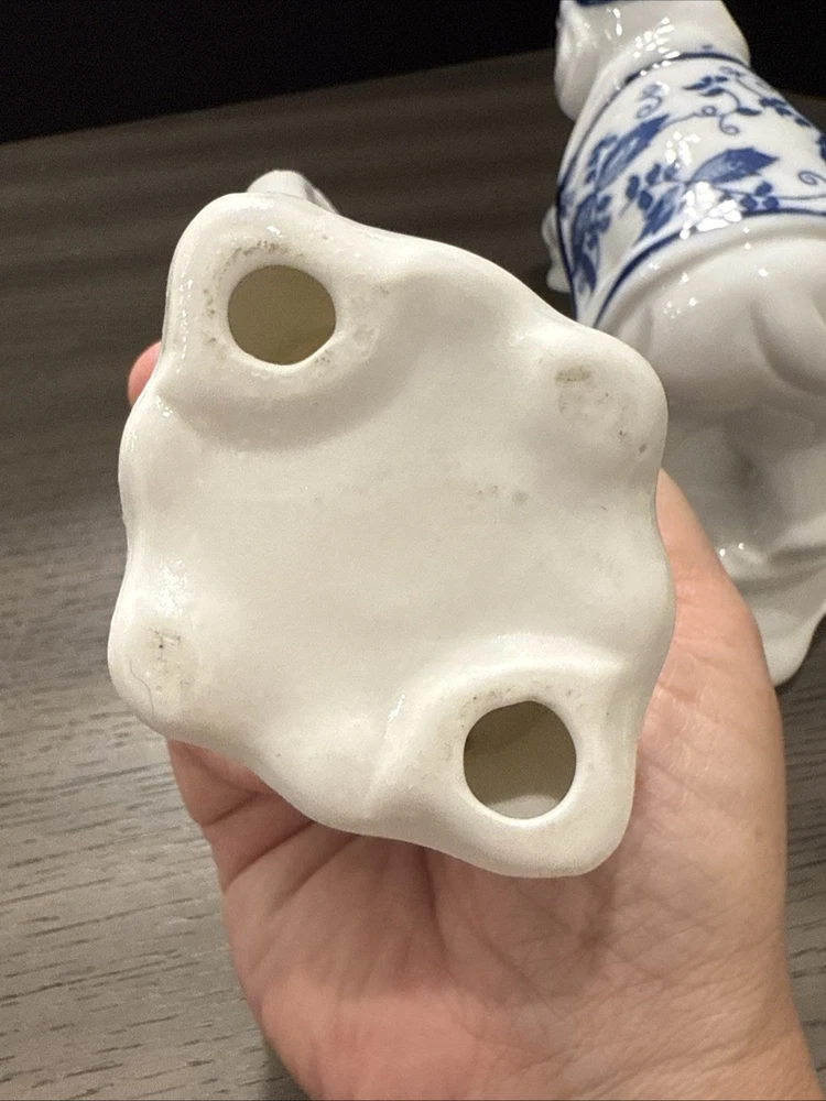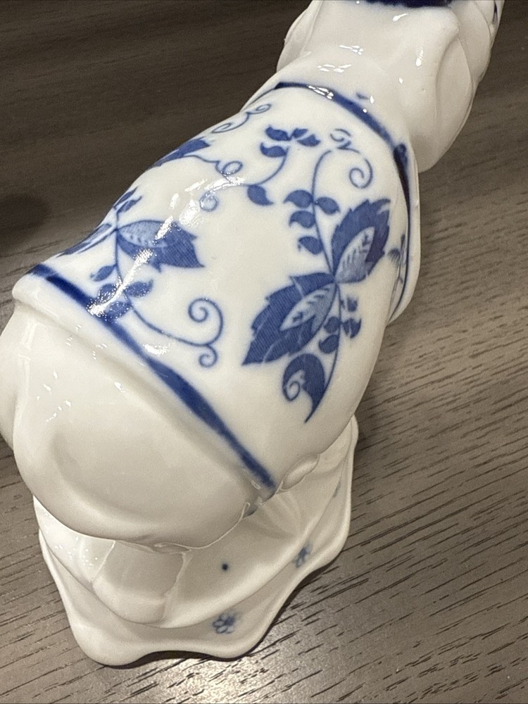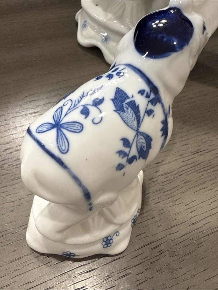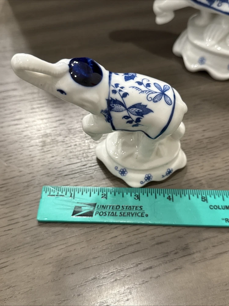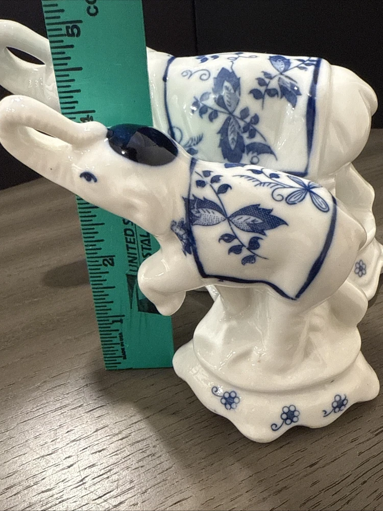 Charming pair of vintage porcelain elephant figurines in classic blue and white. Each elephant features a floral patterned blanket and raised trunks—symbolizing good luck and prosperity. • Material: Porcelain • Design: Blue floral on white, chinoiserie-inspired • Markings: Unmarked • Condition: Excellent vintage condition with no chips, cracks, or repairs (please see photos) • Dimensions: see photos. Perfect accent for collectors of elephant décor, blue-and-white porcelain, or chinoiserie style.