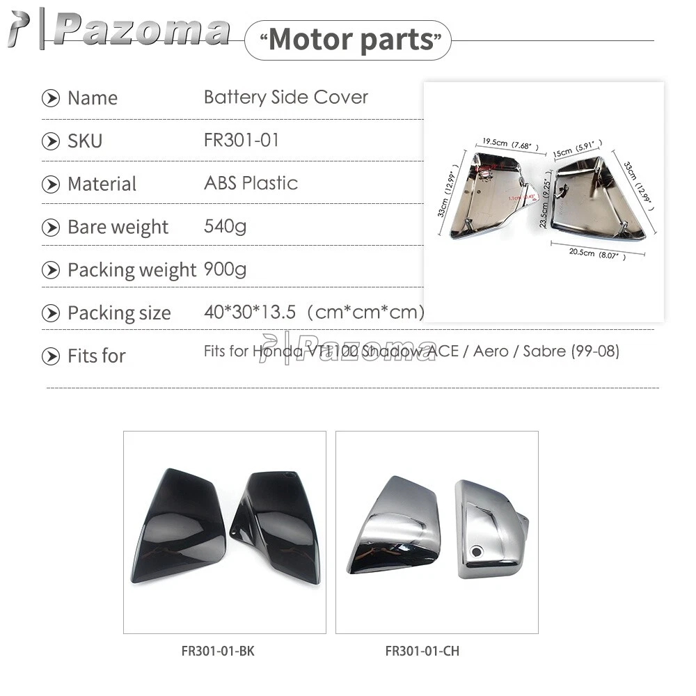 Features: Protect your motorcycle battery, extend battery life. Enhancing the design of your motorcycle. Aftermarket parts, for modify use. Easy to install. Specifics: Condition:100% Brand New Material: ABS Plastic Type: Side Battery Cover Placement on Vehicle: Left,Right Fitment: For Honda VT1100 Shadow ACE / Aero / Sabre (99-08) Note: 1. Please allow 1-3mm difference due to manual measurement. 2. Please confirm whether suitable for your motorcycle before buying. Package Included: 1 Pair Side Battery Cover(Left&Right) Notice: Import duties, taxes and charges are not included in the item price or shipping charges. These charges are the buyer's responsibility. Please check with your country's customs office to determine what these additional costs will be prior to bidding/buying. Features: Protect your motorcycle battery, extend battery life. Enhancing the design of your motorcycle. Aftermarket parts, for modify use. Easy to install. Specifics: Condition:100% Brand New Material: ABS Plastic Type: Side B attery C over Placement on Vehicle: Left,Right Fitment: For Honda VT1100 Shadow ACE / Aero / Sabre (99-08) Note: 1. Please allow 1-3mm difference due to manual measurement. 2. Please confirm whether suitable for your motorcycle before buying. Package Included: 1 Pair Side Battery Cover(Left&Right) Notice: Import duties, taxes and charges are not included in the item price or shipping charges. These charges are the buyer's responsibility. Please check with your country's customs office to determine what these additional costs will be prior to bidding/buying. Payment Delivery details Return About us Feedback Payment 1. Please pay within 3 days from close of auction. 2. We only accept Paypal payment. 3. Buyer needs to responsible for any import tax, duty, VAT, if your country required. Delivery details Shipping Time: Sometimes shipping time may has a little delay, such as Customs check packages strictly ,bad weather,holidays. USA, UK, Canada, Australia and Singapore need around 7-18 working days(Excluding weekend and Holidays).Other countries need around 2-4 weeks.We strive our best to provide you the most reliable way of shipping service. If you do not receive your item on time, please contact us immediately for further assistance.Thank you for your understanding. International Taxes And Duty Fees: Import duties, taxes and charges are not included in the item price or shipping charges.We will mark "Gifts" on custom form. The buyers are fully responsible for any international taxes & duty fees, which may be charged upon delivery.Please check with your country's customs office to determine what these additional costs will be prior to bidding/buying. Packaging: 1.All items are checked before dispatch and are carefully hand-packed by our in-house team. 2.We always taking great care packaging every item to ensure safe and perfect condition to you. 3.We will make every effort to prevent damage in transit. Please Note: Please note your Telephone when your payment.Telephone are must for international express shipping. Return Return Details: 1. If you are not 100% satisfied with the item, please let us know the detailed problem.We will help you resolve the problem as soon as possible. 2. If you received an incorrect, damaged, defective, or item not as described, please contact us.We will give you a best solution. 3. If you want to return the item,please contact us within 14 days after package received .Return products must also be in its original condition: including box, packaging and all other accessories. Returns that are a result of customer error will be subject to an actual shipping fee deduction from the refund. 4. Buyer should pay for the return shipping fee if All Non-Seller Mistake returns for refund (E.g. you brought wrong size or wrong item). 5. Please make sure the item have NO man-made sabotage. If you broken it , please NOTE that the shipping and handling fee will not be refunded, Buyers are responsible for the postal cost of returning the items Items returned must be in the same condition that they were received. How to return 1. Please contact us for Return Merchant Authorization Number (RMA) and return address . 2. Shipping back the package . The RMA must be clearly written on the return package,Otherwise the package will be refused. 3. Mail us the return tracking number. 4. All returns will be inspected prior to a credit being issued. About us Working Hours From Monday To Friday(Beijing Time 9:00-18:00) 1 . We try our best to reply to your emails as soon as possible, however, due to high volume of daily incoming emails and time zone difference, we may not be able to reply your emails immediately. Please allow 1 business days for us to response. If you do not receive any reply from us, please check your email ensuring your mailbox has not reached full size. 2. Due to some ISP SPAM filter settings, you may not be able to receive our replies; If you have problems receiving our emails, you may need to use a different email account to contact us. 3. Please give us the opportunity to resolve any problem. We understand the concerns and frustrations you might have, and will try our best to resolve the issues. Please email us before leaving any negative feedback or open any dispute on PayPal. 4. We care about our valued customers, and will always try to help you. So if you have any problems, please e-mail us immediately. Feedback 1. We hope to give you a positive eBay experience by working hard, and we expect to receive a positive feedback and Detailed Selling Rating (DSR) of 5 Rating in all of the feedback categories from the buyer upon receiving the item . 2. If you have any problem on our items or service, please don’t hesitate to contact us before you leave any Neutral/Negative feedback, we will try our best to help you resolve the problem. 3. Communication is the best way to solve problem.Thank you for your understanding.