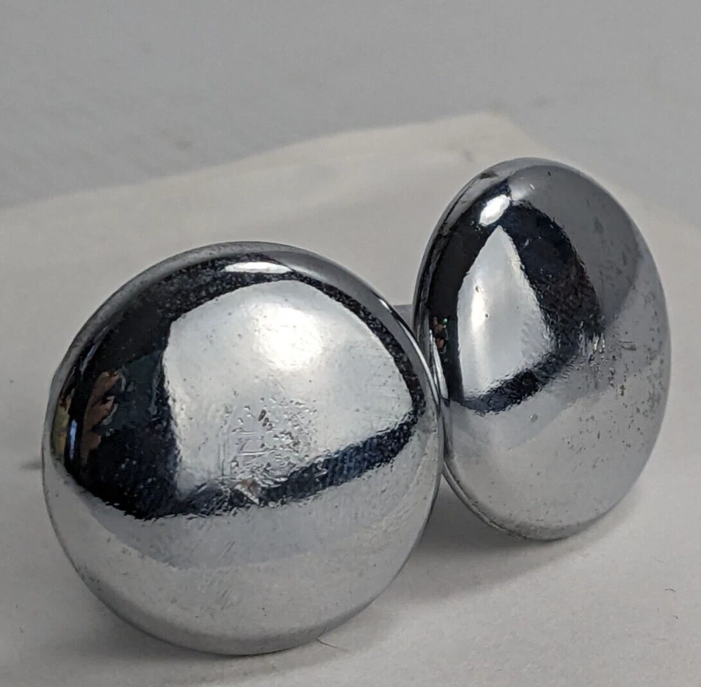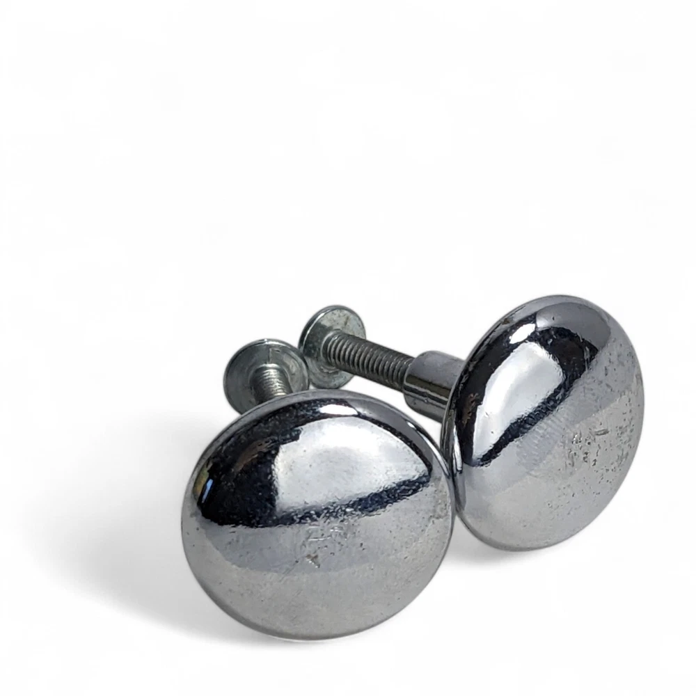2 furniture knobs, Chrome shiny finish, 1 in diameter, screws included Pre-owned item, used condition showing signs of wear and use, some scratches. All images provided accurately represent the item(s) you will receive and should be regarded as an integral part of the description. We encourage you to carefully review each image. If you have any questions or need further details about this listing, please feel free to reach out to us.