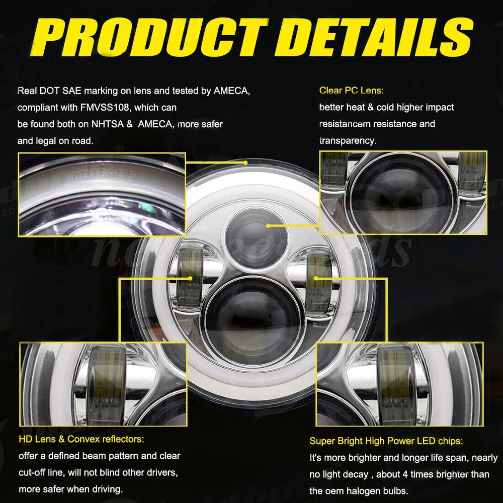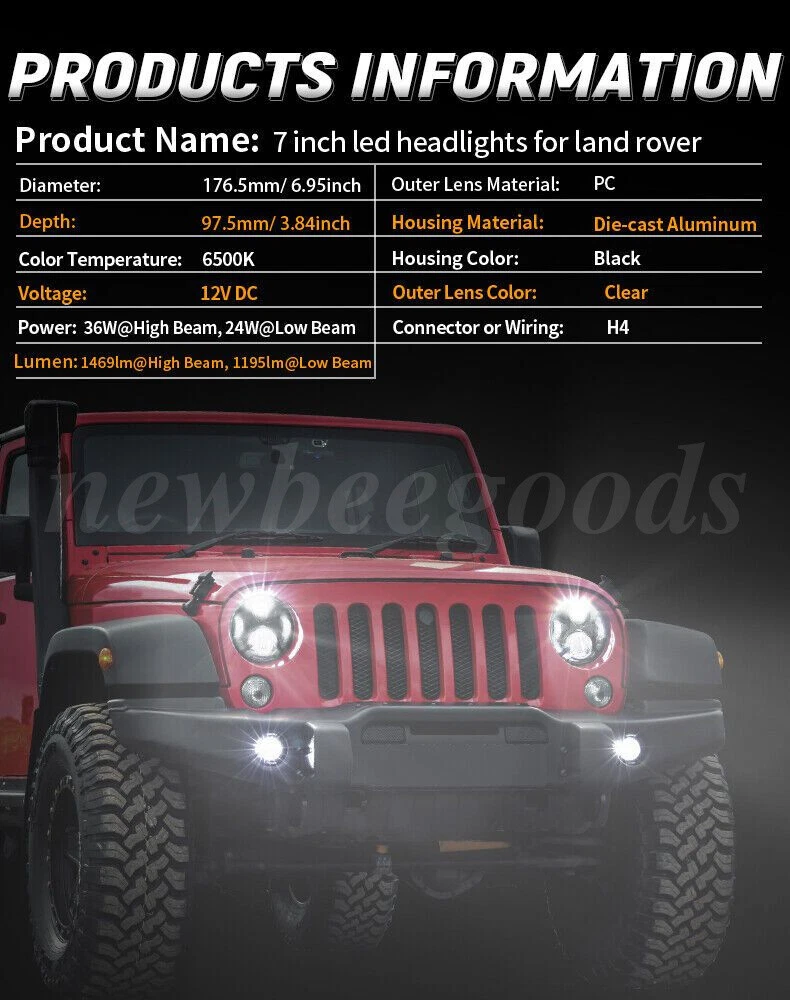 Welcome to NewBeeGoods feedback | contact us Location United States Hours Open 24/7 Support Feel free to Contact us Electronics Motors Supplies Home & Garden Pet Supplies Business & Industrial Newbeegoods USD 37.99 Pair For Toyota FJ Cruiser 2007-2014 7" Round LED Headlights Halo DRL Hi/Lo Beam Notes: 1. Please check whether it is fit your vehicle before purchase. 2.Important: This is a universal item, not adapted to a specific model. In many cases, individual adjustments are required for assembly. Please use the dimensions and pictures to check whether it is possible to fit the vehicle in question. Installation requires knowledge of vehicle electronics, if in doubt have it installed by a specialist workshop. 3. Installation instruction is NOT included,professional installation highly recommended. 4. Note: Without mounting bracket, some models may need mounting bracket! Description: This 7 inch LED headlight has a strong connection with your safe driving. One function is to provide lighting to illuminate the road ahead of the vehicle, accurately illuminate the road ahead, and provide a good vision in bad weather or at night. The other is to play a warning role, in order to remind vehicles and people ahead to improve the safety of driving at night. This headlight is more energy-efficient, has a long service life and a fast response speed. A real amzing item for your car! Features: 【 Multi-functional LED Headlight 】 The 7'' LED headlight has 4 luminous mode (High beam/Low Beam/DRL/Amber Turning Light), making it better remind the opposite passers-by or oncoming cars when you need to turn, so that the other party can make corresponding measures in time, improving the safety of driving at night. 【 Orignal Osram chips 】 The halo lights made with advanced LED chips to give out bright and white rays for clear visibility and broader illumination range, making your driving safe. Its structure adopts a spotlight + flood design, which makes the high beam center point have a wider illumination range and greatly improves driving safety. The item can still perform well and provide the best driving experience for you even in a foggy environment. 【 Excellent Heat Dissipation & Waterproof 】 The housing of the led headlight is made with Die-cast aluminum and has high heat dissipation performance. This product is weatherproof, IP67 waterproof, energy efficient, durable and long-lasting. It can be effective against rain, snow, and heavy fog weather. 【 High Brightness 】 This new LED headlight has 3 times the brightness of ordinary car halogen lights, which is the best choice for upgrading vehicles, ensuring that you drive home safely. 【 Easy To Install 】 Plug & Play, LED Ballast, LED Canbus & H4/H13 Adapter Included. Usually in 20 Minutes or Less for installation. 【 Certificationgs 】 DOT, E9, CE, RoHS, ISO9002, IP67 Specification: Type: LED Headlight Dimension: 7'' Lighting Technology: LED LED Chip: High Quality LED Chip Housing Color: Chrome Headlight Style: Halo Halo Angle Eyes Color: Amber & White Number of Bulbs: 2 Operating Voltage: DC 9-30V Voltage: DC 12V-24V Power: 200W/set; 100W/bulb Life span: Up to 50000 hours Waterproof Rating: IP67 Material: ABS and Aluminum Alloy + PC Breathing Vent: Anti-fogging Working Temperature: -40 + 85°C LED Light Mode: High Beam/Low Beam/DRL/Amber Turning Light Itment Type: Direct Replacement Placement on Vehicle: Front, Left, Right Package Contents: 2x 7 inch Round LED Headlights 2x H4 to H13 Adapter Application: For Any Vehicle models with 7 inch Round headlight,such as: For Jeep Models: For Jeep Wagoneer (1963-1978) For Jeep CJ-7 (1976-1986) For Jeep CJ-8 Scrambler (1981-1985) For Jeep Wrangler TJ 2 Door (1997~2006) For Jeep Wrangler LJ unlimited (4 Door) (2004~2006) For Jeep Wrangler JK 2 Door (2007~2018) ForJeep Wrangler JL 2018~2019 ( need add bracket ) For Jeep Wrangler Unlimited JK 4 Door (2007~2018) For Jeep Wrangler (1997-2015) For 1969-1980 Toyota Corolla For 1979-1987 Toyota Land Cruiser For 2007-2014 Toyota FJ Cruiser For 1979-1981 Toyota Pickup For Chevy Camaro (1969-1981) For Mazda Miata MX5 MX-5 (1990-1997) For Honda Civic (1976-1981) For Ford Custom 500 (1971/1976) For Ford F-100 Pikcup (1969-1974) For Ford F-150 (1975-1979) For Toyota Corolla (1969-1980) For Toyota LandCruiser (1979-1987) For Toyota Pickup (1979-1981) For Oldsmobile Omega (1974-1979) For Plymouth Barracuda (1964-1974) For Plymouth Valiant (1963-1976) For Land Rover Defender 90 (1997) For Land Rover Defender 90 (1995) For Land RoverRange Rover County Classic Sport Utility 4-Door 1995 For Land Rover Range Rover (1987-1995) For Land Rover 90/110 1983 to 1991 (including 2.5N/A, 2.5 Turbo, V8) For Land Rover 90/110 Defender 200 Tdi For Land Rover 90/110 Defender 300 Tdi For Land Rover 90/110 Defender Td5 For Land Rover 90/110 Tdci Hummer AM General 1992-2001 Hummer H2 2003-2009 Hummer H1 2002-2006 For Hummer H1 H2 (2003~2009) ( H2 needs 9007 male to H4 female adapter, package not included ) For Lada 4x4 urban Niva For UAZ Hunter For Suzuki Samurai For Kenworth T-2000 1998-2010(Buyer Note, Our Headlight plug is H4,H4-H13) For Puch G and Mercedes G models For 1990-1997 Mazda Miata For 1976-1977 Mazda Mizer For 1979-1985 Mazda RX-7 For 1976-1977 Mazda 808 Shipping Returns Payment We only support transactions through the eBay, not other channels. We support all payment methods recommended by ebay. We promise to protect all the private information of our customers. It will take about 1-5 working days to reach you within USA. If your item develops a fault due to a manufacturing defect please contact us and we guarantee a satisfactory solution. If you return your item for any other reason within 30 days from receipt we will refund you. 100% Feedback - we're proud of our 100% record and aim to keep it that way! Please contact us if you're not entirely happy with your order and we'll try to rectify it ASAP! Our aim is to ship within 24 hours. All of our products are shipped 