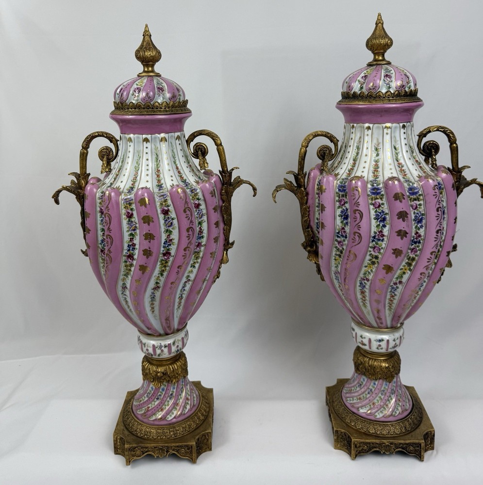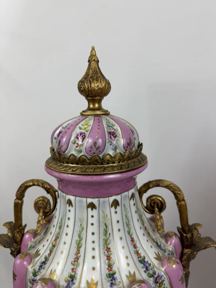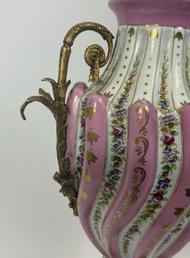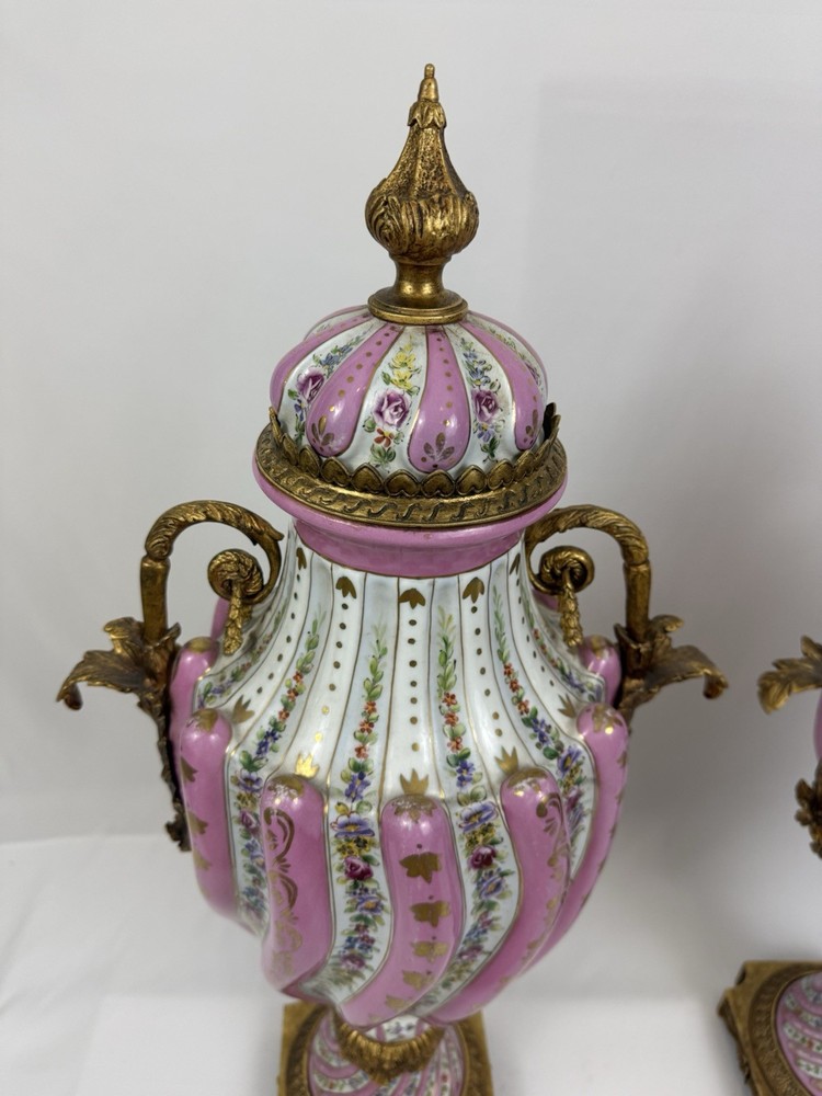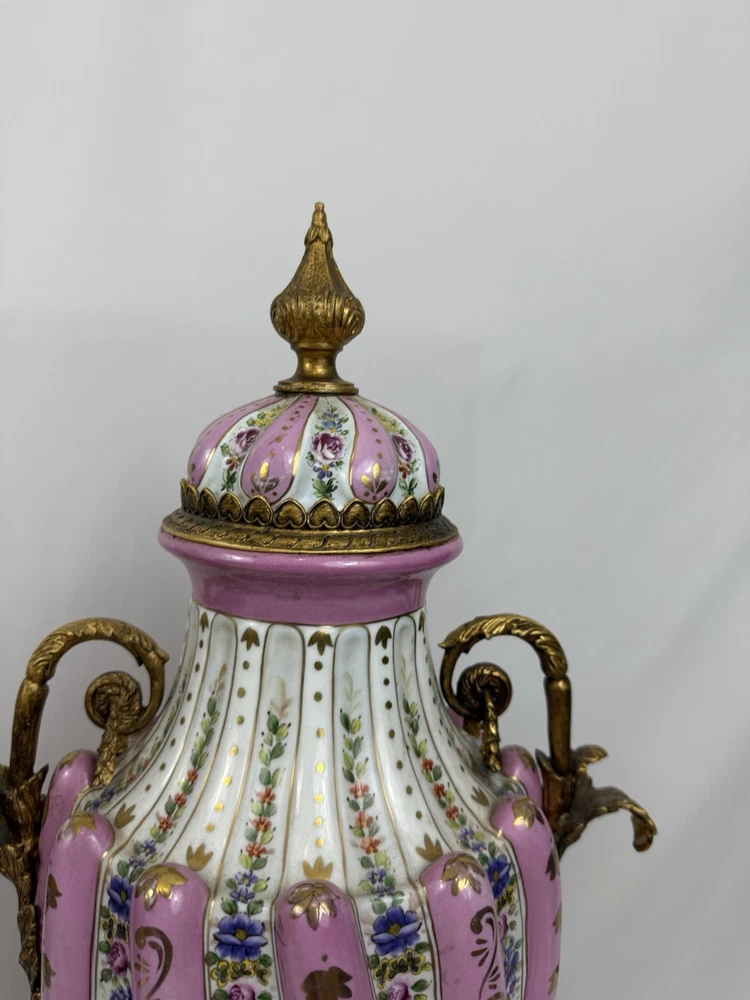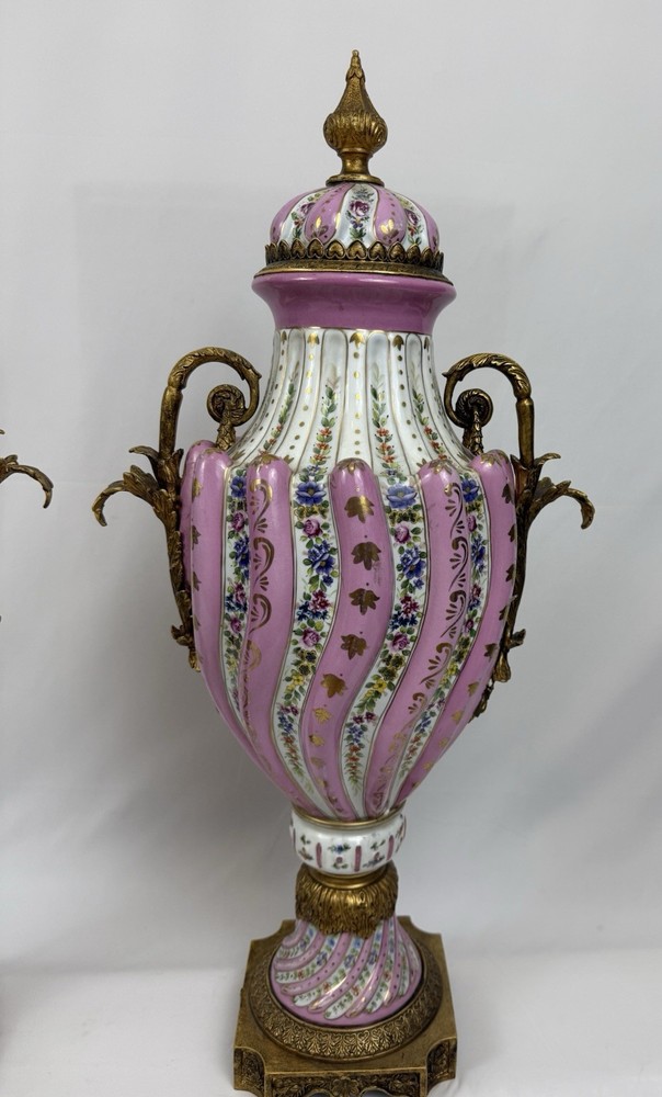 Pair of Large Antique French Sèvres-Style Porcelain & Bronze Lidded Vases – Late 19th / Early 20th Century This is a stunning pair of large French Sèvres-style porcelain vases, dating from the late 19th to early 20th century. Each vase features an elegant fluted form with alternating white and pink panels, richly decorated with delicate gilt scrollwork and floral motifs in the classic Sèvres tradition. The vases are beautifully mounted with gilt bronze (ormolu), including two ornate handles, base and lids topped with decorative finials. Dimensions: Height: 29 in. Width: 15 in. Depth: 10 in. Condition: Good vintage condition with wear consistent with their history. Please review all photos carefully, as they form an important part of the description. Ships exactly as shown in the photos. Please feel free to contact me with any questions or to request additional images.