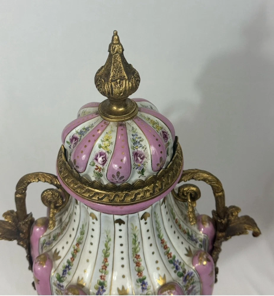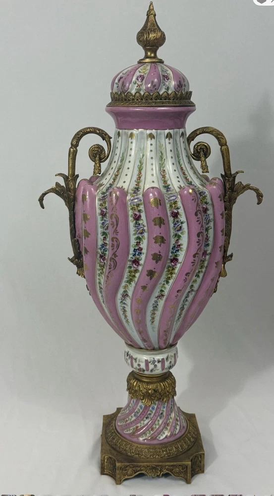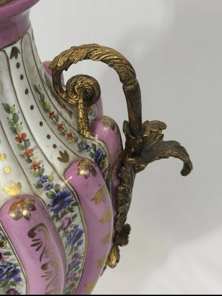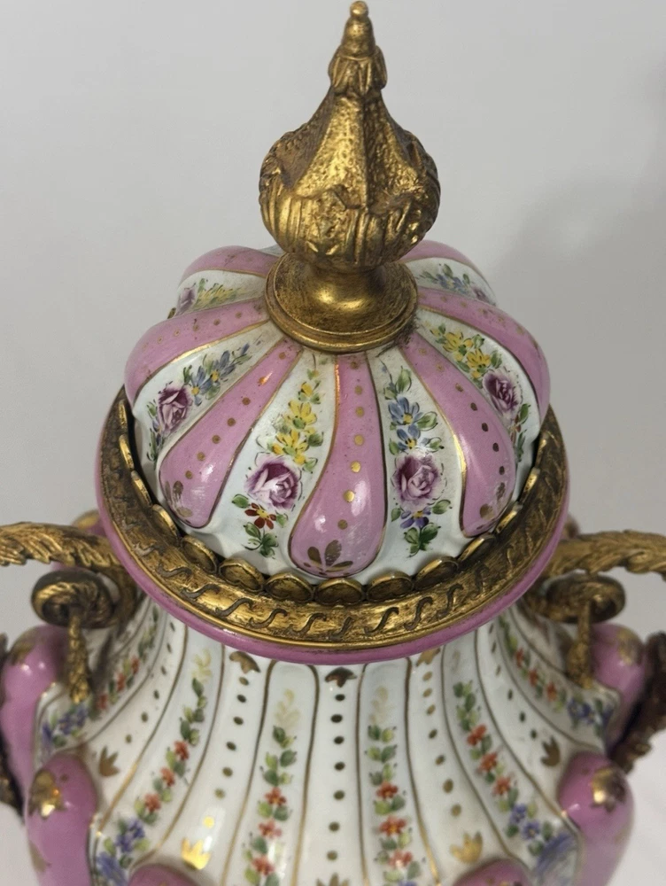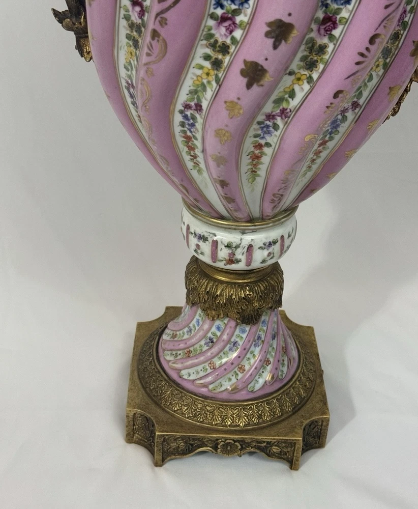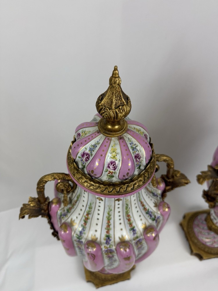 Pair of Large Antique French Sèvres-Style Porcelain & Bronze Lidded Vases – Late 19th / Early 20th Century This is a stunning pair of large French Sèvres-style porcelain vases, dating from the late 19th to early 20th century. Each vase features an elegant fluted form with alternating white and pink panels, richly decorated with delicate gilt scrollwork and floral motifs in the classic Sèvres tradition. The vases are beautifully mounted with gilt bronze (ormolu), including two ornate handles, base and lids topped with decorative finials. Dimensions: Height: 29 in. Width: 15 in. Depth: 10 in. Condition: Good vintage condition with wear consistent with their history. Please review all photos carefully, as they form an important part of the description. Ships exactly as shown in the photos. Please feel free to contact me with any questions or to request additional images.
