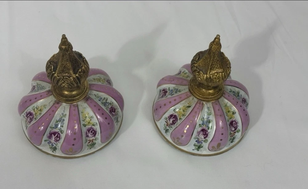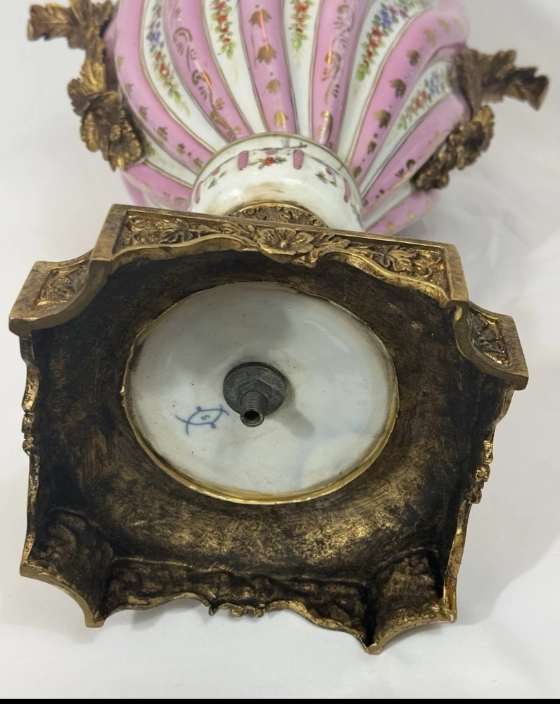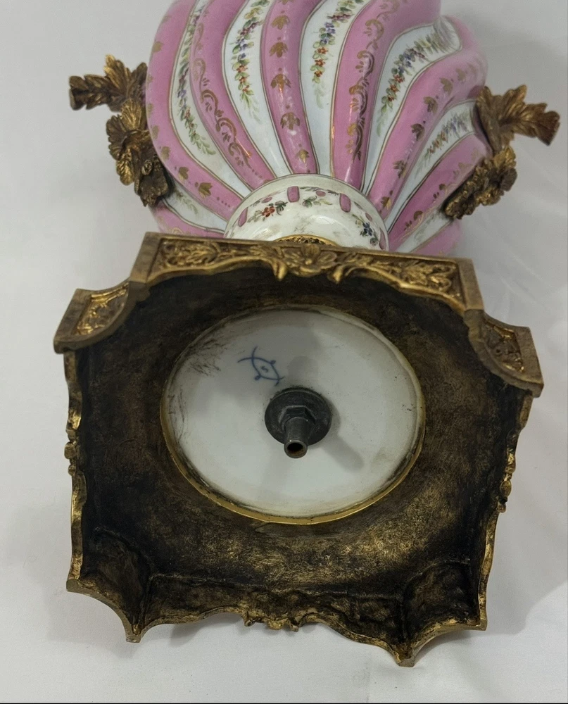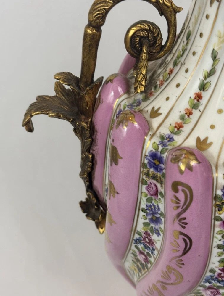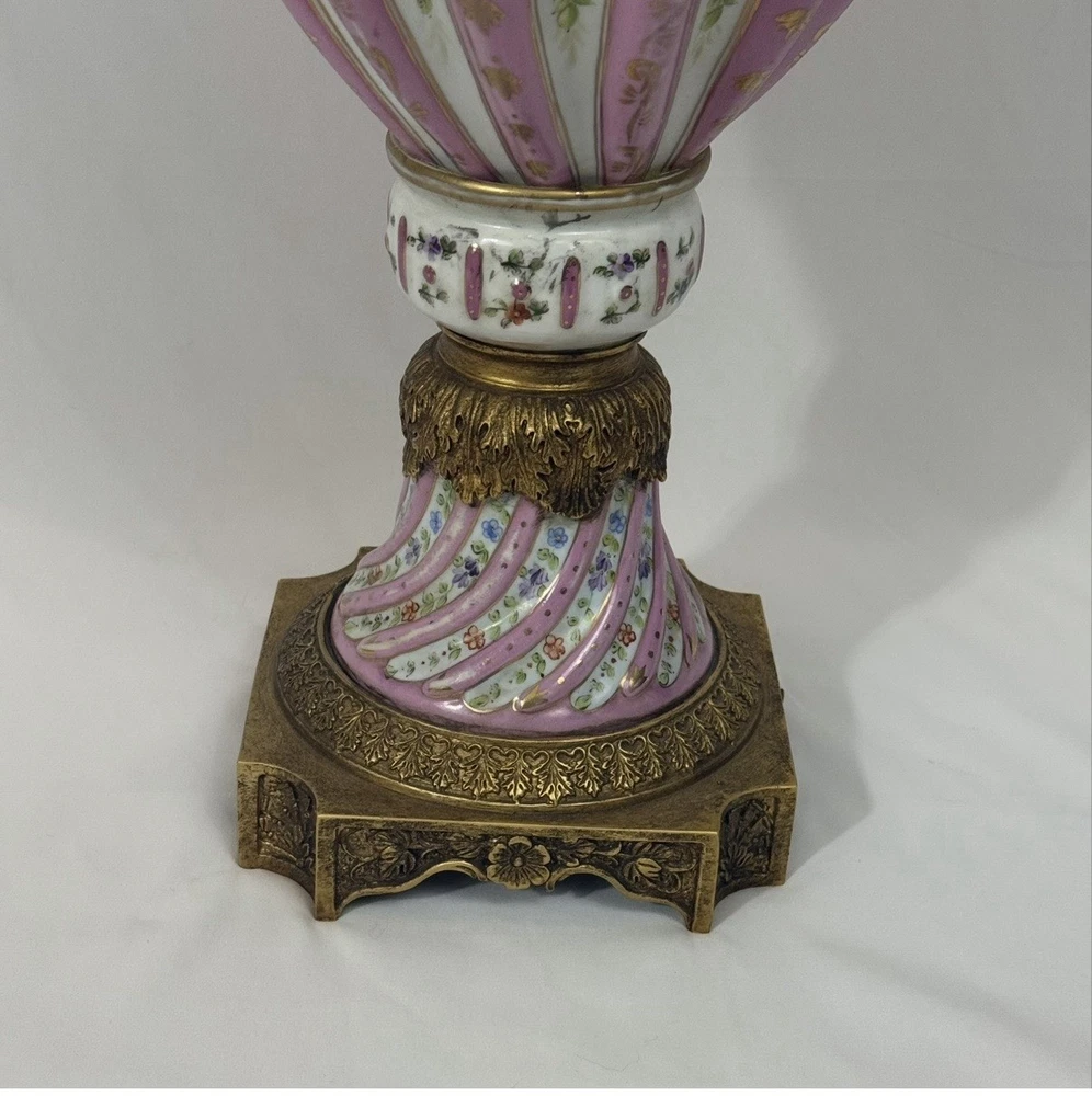 Pair of Large Antique French Sèvres-Style Porcelain & Bronze Lidded Vases – Late 19th / Early 20th Century This is a stunning pair of large French Sèvres-style porcelain vases, dating from the late 19th to early 20th century. Each vase features an elegant fluted form with alternating white and pink panels, richly decorated with delicate gilt scrollwork and floral motifs in the classic Sèvres tradition. The vases are beautifully mounted with gilt bronze (ormolu), including two ornate handles, base and lids topped with decorative finials. Dimensions: Height: 29 in. Width: 15 in. Depth: 10 in. Condition: Good vintage condition with wear consistent with their history. Please review all photos carefully, as they form an important part of the description. Ships exactly as shown in the photos. Please feel free to contact me with any questions or to request additional images.