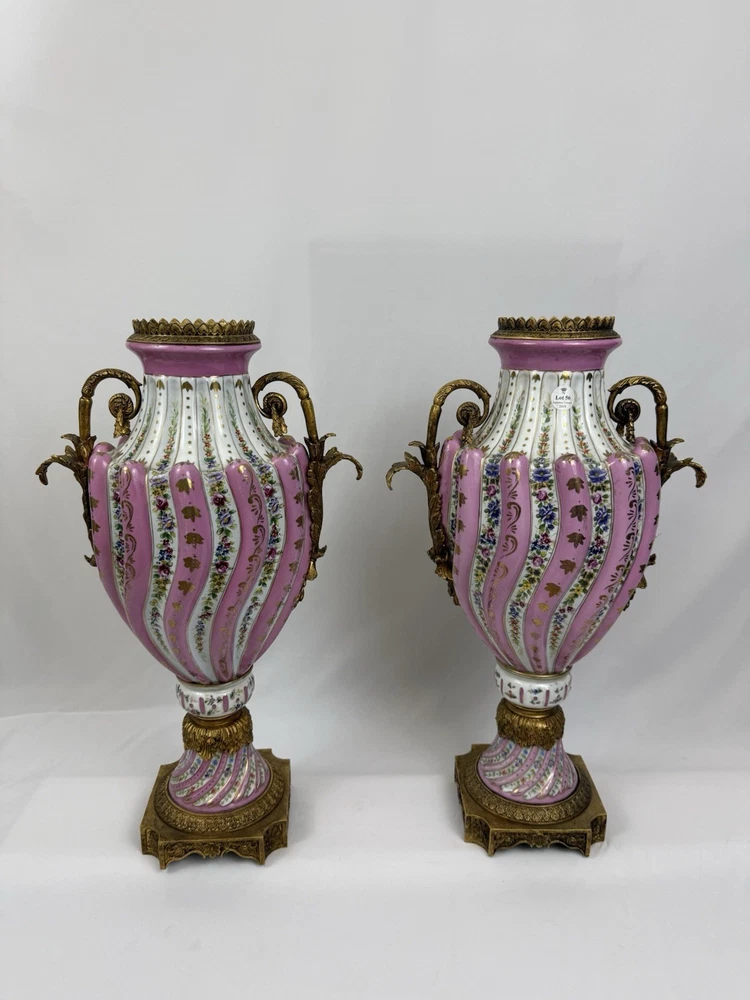 Item Weight: 38 Lbs (total) Item Height: 29 in Handmade: Yes Size: Large Subject: spiral lobed decoration picked out with flowers on a pink ground Original/Reproduction: Original Theme: Periods & Styles Color: Multicolor Features: Hand Painted Finish: Antique Pattern: Floral Brand: Sevres Style Material: Porcelain Signed: Yes Style: French Item Width: 14 in Country/Region of Manufacture: France Occasion: All Occasions Type: Urns Vases Number in Pack: 2 Antique: Yes
