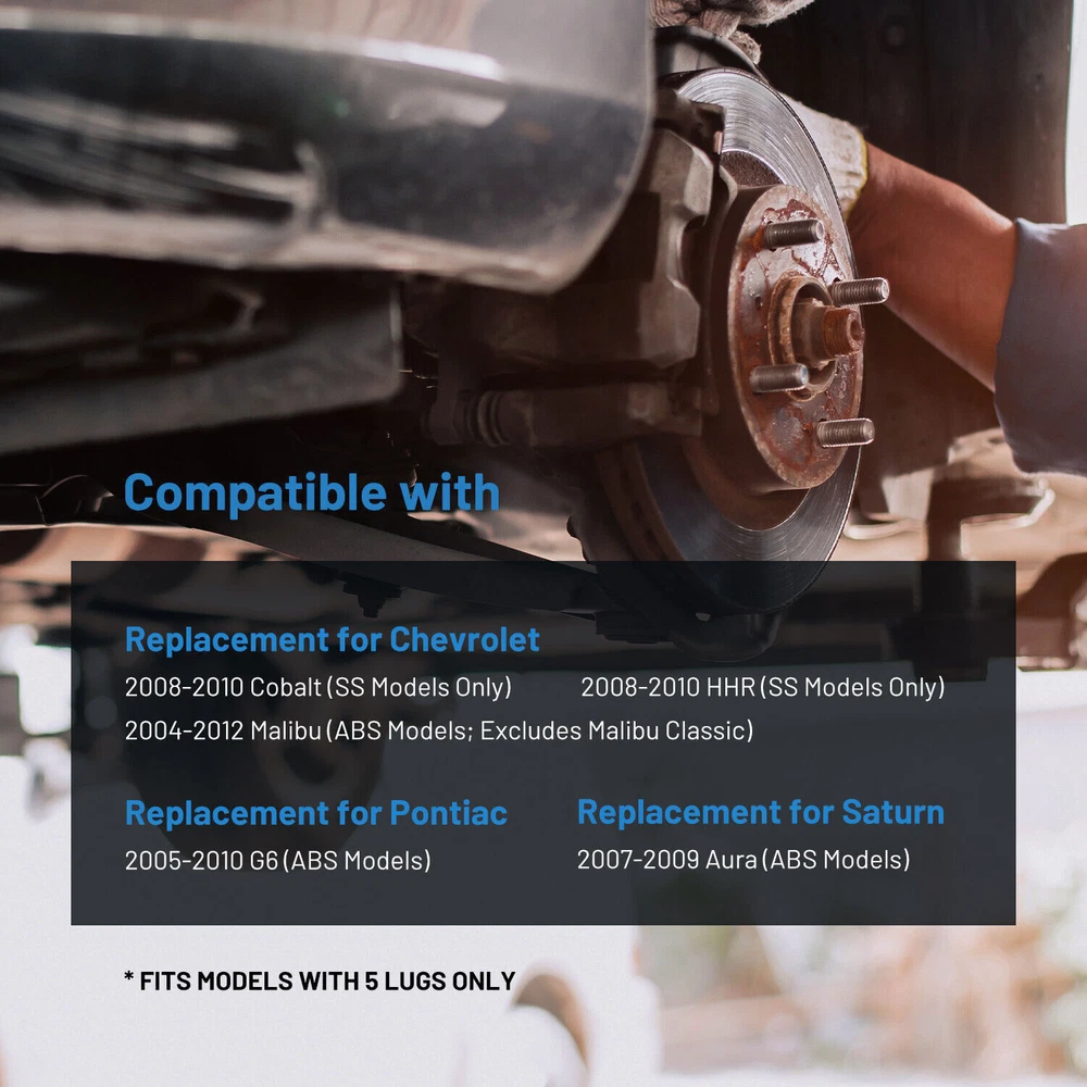 Fits Following Models: CHEVROLET COBALT 2008 - 2010 SS MODELS CHEVROLET HHR 2008 - 2010 SS MODELS CHEVROLET MALIBU 2004 - 2012 ABS MODELS EXCLUDES MALIBU CLASSIC PONTIAC G6 2005 - 2010 ABS MODELS SATURN AURA 2007-2009 ABS MODELS Part Number: 513214 BR930317 HA590070 Placement on Vehicle:Left, Right, Front Lugs: 5 Bolt ABS on Hub: Sensor Wire Package: 2x Front Wheel Bearing & Hub Assembly - 513214 Fits Following Models: CHEVROLET COBALT 2008 - 2010 SS MODELS CHEVROLET HHR 2008 - 2010 SS MODELS CHEVROLET MALIBU 2004 - 2012 ABS MODELS EXCLUDES MALIBU CLASSIC PONTIAC G6 2005 - 2010 ABS MODELS SATURN AURA 2007-2009 ABS MODELS Part Number: 513214 BR930317 HA590070 Placement on Vehicle:Left, Right, Front Lugs: 5 Bolt ABS on Hub: Sensor Wire Package: 2x Front Wheel Bearing & Hub Assembly - 513214