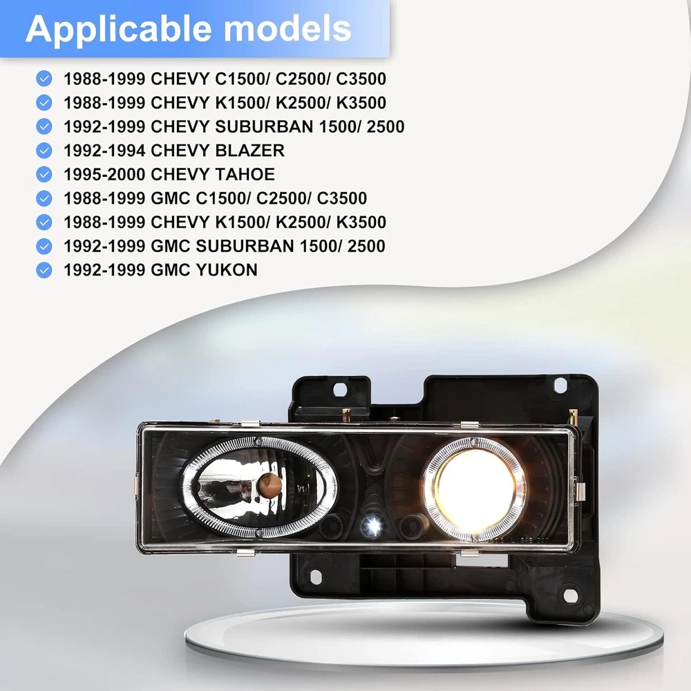 Home Payment Shipping Return Policy About Us Contact Us Feedback Store Categories Other Car Refrigerator Front Bumper Rear Bumper Fender Flares Inner Fenders Side Steps Running Board A-Pillar Light Mount Brackets Headlights Taillights Fog Lights LED Headlights LED Taillights LED Fog Lights Jeep Chevrolet Ford Toyota Dodge GMC Chrome Housing+Clear Lens: https://www.ebay.com/itm/402723119053 About this item ๐ ใPerfect FitmentใOur headlight assembly is compatible with for 1992-1994 Chevy Blazer /1988-1999 Chevy c1500 Pickup /1992-1999 Chevy c1500 Suburban /1988-2000 Chevy c2500 Pickup /1992-1999 Chevy c2500 Suburban /1988-2000 Chevy c3500 Pickup /1988-1999 Chevy k1500 Pickup /1992-1999 Chevy k1500 Suburban /1988-2000 Chevy k2500 Pickup /1992-1999 Chevy k2500 Suburban /1988-2000 Chevy k3500 Pickup /1995-2000 Chevy Tahoe /1988-1999 Gmc c1500 Pickup /1992-1999 Gmc c1500 Suburban /1988-2000 Gmc c2500 Pickup /1992-1999 Gmc c2500 Suburban /1988-2000 Gmc c3500 Pickup /1988-1999 Gmc k1500 Pickup /1992-1999 Gmc k1500 Suburban /1988-2000 Gmc k2500 Pickup /1992-1999 Gmc k2500 Suburban /1988-2000 Gmc k3500 /1998 Gmc k3500 Pickup /1992-1999 Gmc Yukon . And all of headlights that are SAE and DOT approved, meet with standard safety and OEM requirement. ๐ ใPerfect Beam PatternใHeadlights has well performance of accurate projection beam mode that enhance visibility during night time,heavy rain,snow. This headlights assembly offers higher power efficiency, longer life, and better space-saving than the conventional incandescent-type lamps. ๐ ใPlug and PlayใHeadlight assembly for 1988-1999 Chevy C1500 C2500 C3500 which perfectly replace factory parts and are designed for quick and easy installation without drilling or modifications. Headlight assemblies are designed to work without any special wiring. ๐ ใIP67 WeatherproofใThe headlights assembly for 1992-1994 Chevy Blazer made from superior OEM grade ABS plastic housing and full sealed beam, that can reach up to IP67 weatherproof to ensure pretty durability in heavy rain or terrible weather. Moreover, the well-designed breather has a good heat dissipation to make the lights breathable and extend the light's life. ๐ ใPremium QualityใThis headlights are made of Special Materials which are Resistant to Water, The Dustproof and Shockproof Clear PC Lens are not easy to yellow and crack. Otherwise, the back shell is with strong impact strength and good thermostability. 100% Advanced chips add visibility crucial in Navigation Poor Weather Conditions, Including Rain And Snow, as Well as Dense Fog. Last more than 50,000 Hours. ๐ ใ7/24 Customer ServiceใAll of our headlights are sent from US. Please feel free to contact us via message center if any quality issues. We always stand behind these products and are committed to providing responsive customer service. (Reply within 24 hours). Notes: Package comes in a pair (driver's side and passenger's side headlights). Vehicle Fitment ๐ 1992-1994 Chevy Blazer ๐ 1988-1999 Chevy c1500 Pickup ๐ 1992-1999 Chevy c1500 Suburban ๐ 1988-2000 Chevy c2500 Pickup ๐ 1992-1999 Chevy c2500 Suburban ๐ 1988-2000 Chevy c3500 Pickup ๐ 1988-1999 Chevy k1500 Pickup ๐ 1992-1999 Chevy k1500 Suburban ๐ 1988-2000 Chevy k2500 Pickup ๐ 1992-1999 Chevy k2500 Suburban ๐ 1988-2000 Chevy k3500 Pickup ๐ 1995-2000 Chevy Tahoe ๐ 1988-1999 Gmc c1500 Pickup ๐ 1992-1999 Gmc c1500 Suburban ๐ 1988-2000 Gmc c2500 Pickup ๐ 1992-1999 Gmc c2500 Suburban ๐ 1988-2000 Gmc c3500 Pickup ๐ 1988-1999 Gmc k1500 Pickup ๐ 1992-1999 Gmc k1500 Suburban ๐ 1988-2000 Gmc k2500 Pickup ๐ 1992-1999 Gmc k2500 Suburban ๐ 1988-2000 Gmc k3500 ๐ 1998 Gmc k3500 Pickup ๐ 1992-1999 Gmc Yukon Specification ๐ Quantity: 1 Set (Left & Right Side Headlights included) ๐ Certification: DOT/SAE Compliance ๐ Wiring Harness: Not Included ๐ Replaces Original (OE) Part #: L: 15034929; R: 15034930 ; ๐ Partslink๏ผL: GM2502101; R: GM2503101 ; ๐ Bulb type: LED , Halogen ๐ Low Beam Bulb: H1 12V55W [Included]; ๐ High Beam Bulb: 9005 12V60W [Not Included]; ๐ Halo Ring: LED Included ๐ Color Finish: Black Housing / Clear Lens/ Projector Halo Ring ๐ Housing/ Lens Material: PC ๐ Beam Type: High Beam: Projector+ Reflector; Low Beam: Reflector Package ๐ 1 Pair of Headlights(Driver and Passenger Side) ๐ Low Beam Bulbs Payment Delivery details Terms of sales About us Contact us Payment We accept PayPal, credit card , Apple Pay & Google Pay etc. Delivery details All items will be shipped within 1-3 business days after payment received, we will try our best to ship out as soon as we can, hope for your understanding. Please double confirm your address and contact information, which will help the delivery faster and more accurately. Note ๏ผbuyers who purchase international products need to pay import tariffs!!! Terms of sales Professional installation is highly recommended. Any problem of the item please feel free to contact us first , please D o Not leave negative feedback before that, or simply return it within 60 Days in original condition. We will resolve it for you ASAP. About us Any questions please do not hesitate to contact us directly by eBay message . We will reply you within 24 hours asap, thanks for your understanding. Contact us Should you have any problem or require any further information please feel free to contact us . If you are satisfied with our product and service, please kindly leave us a positive feedback. On Nov 29, 2024 at 00:15:54 PST, seller added the following information: