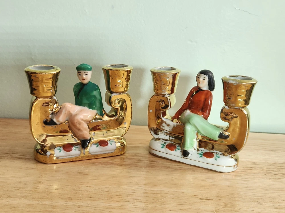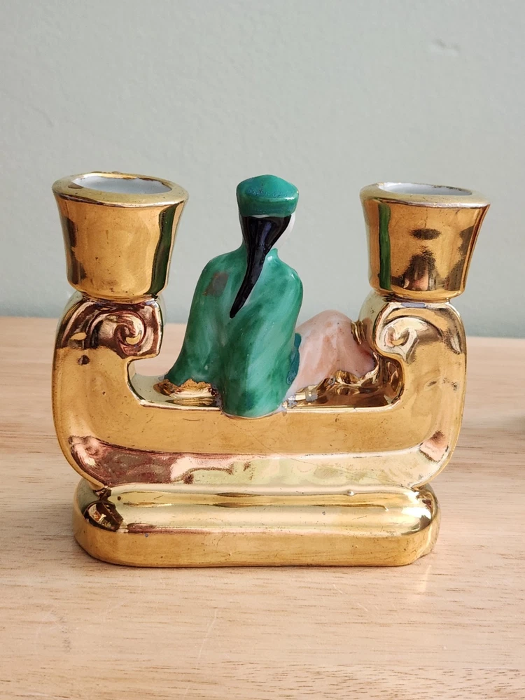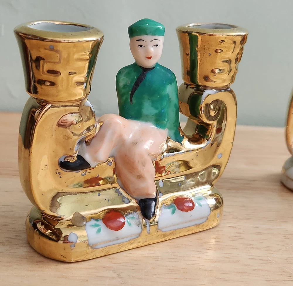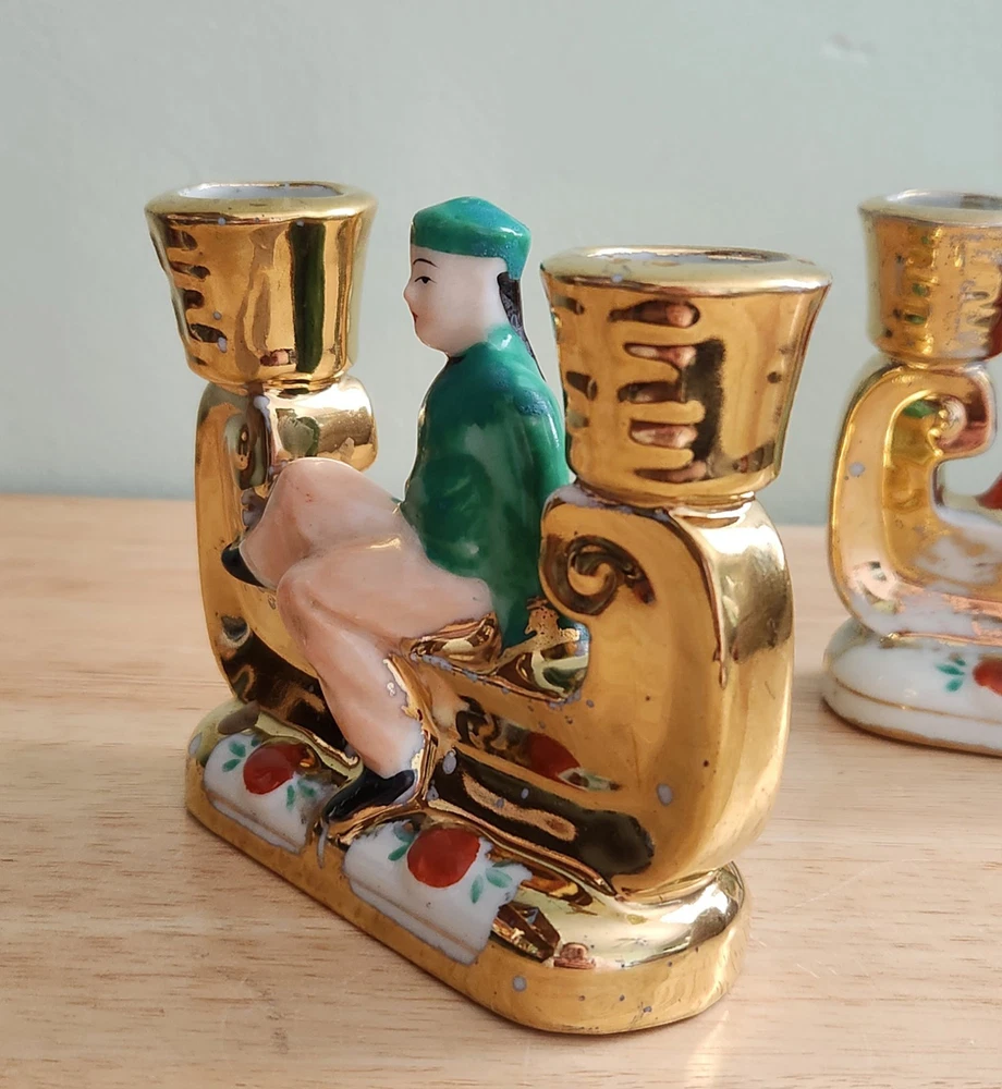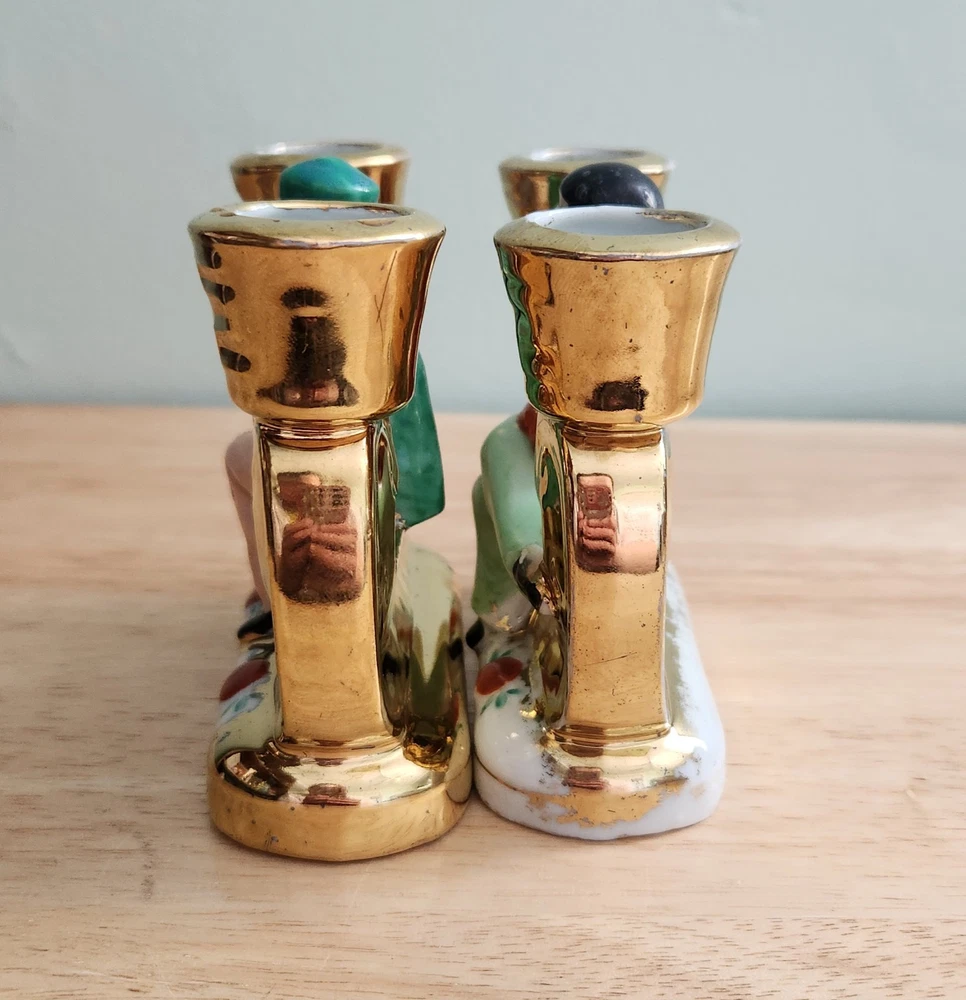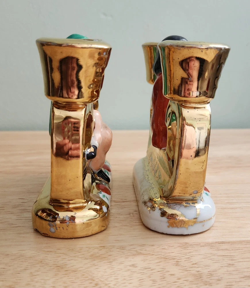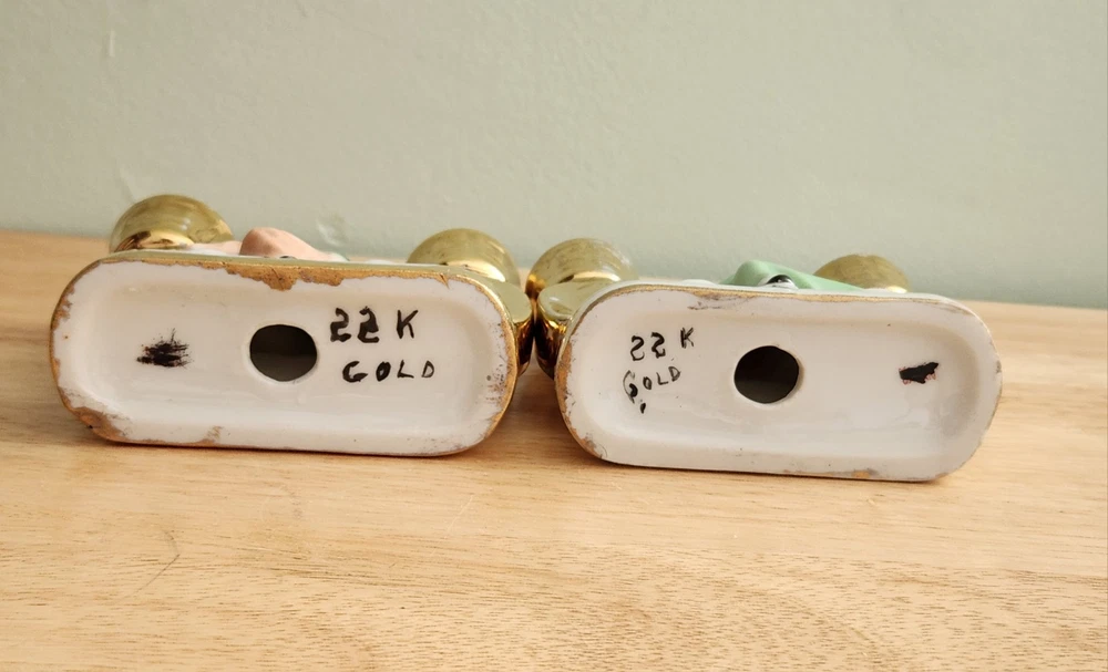 Both measure 4 in wide and a little under 4 in tall. The part that the candle goes in measures about 1 in across and a little under 1 in deep. There is a lot of paint loss as shown in photos. The bottoms are marked "22 k gold' and appears to have "made in japan", but someone has crossed this out.