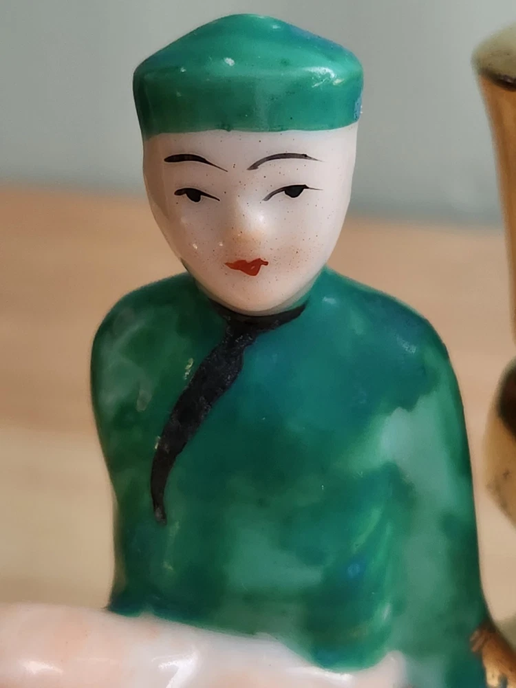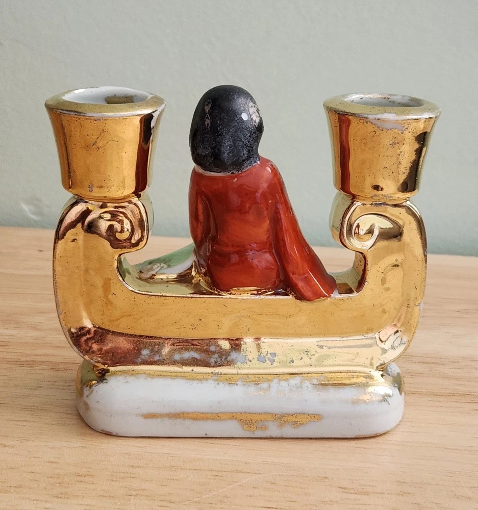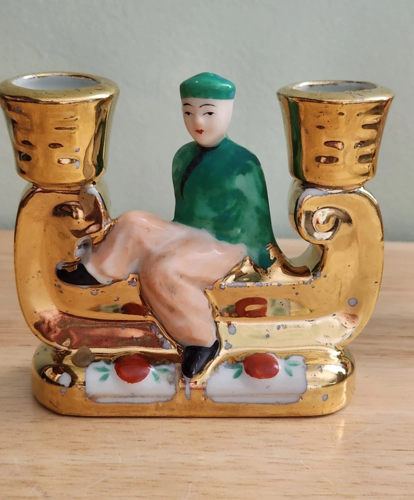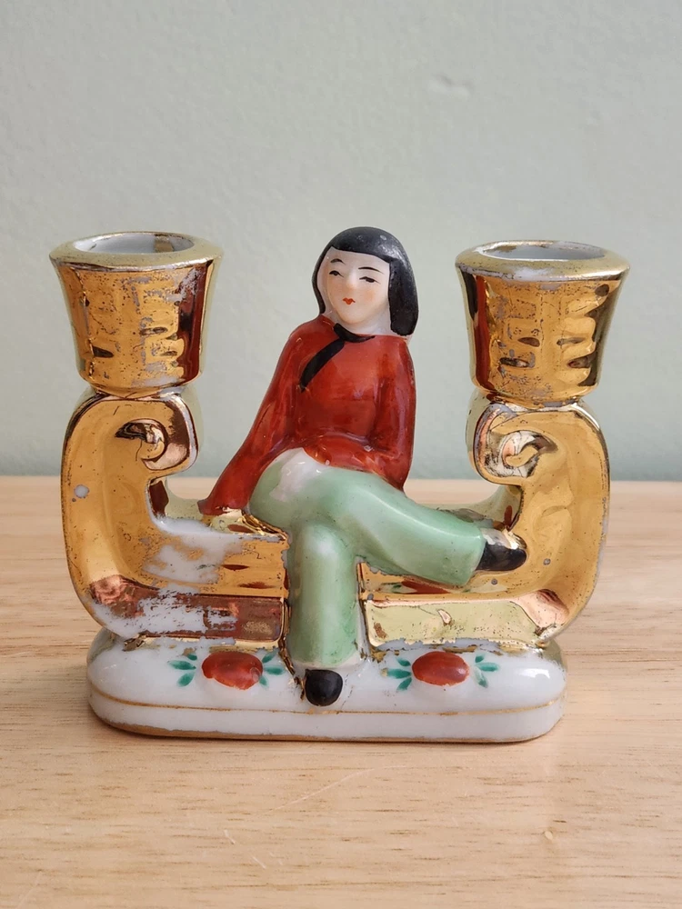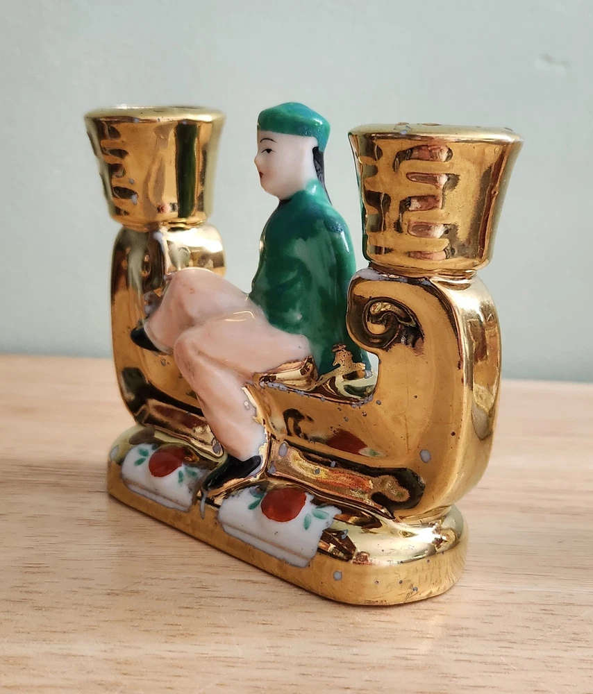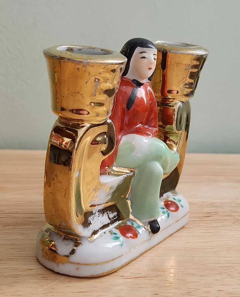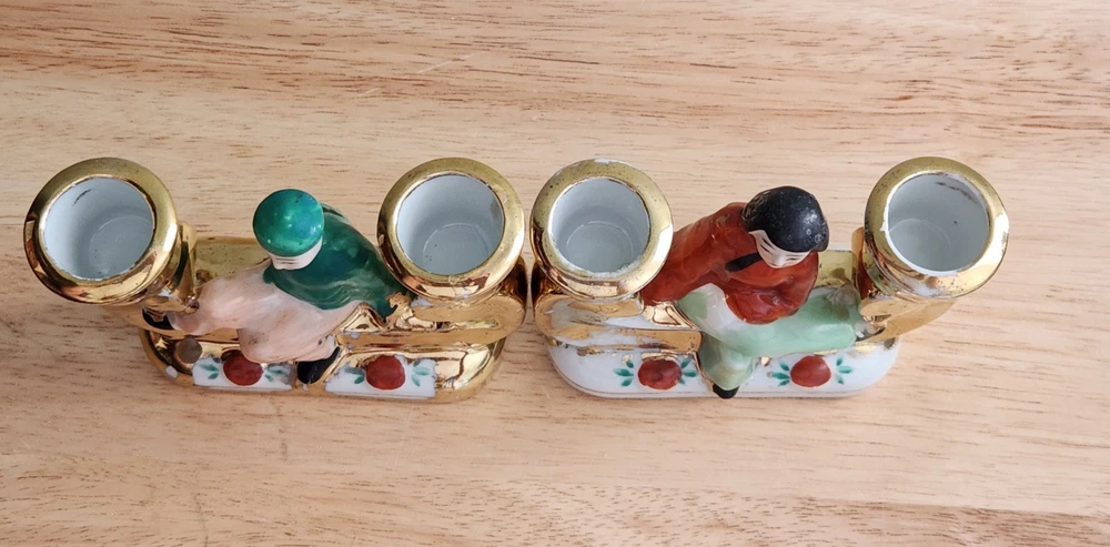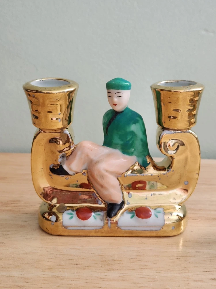 Both measure 4 in wide and a little under 4 in tall. The part that the candle goes in measures about 1 in across and a little under 1 in deep. There is a lot of paint loss as shown in photos. The bottoms are marked "22 k gold' and appears to have "made in japan", but someone has crossed this out.