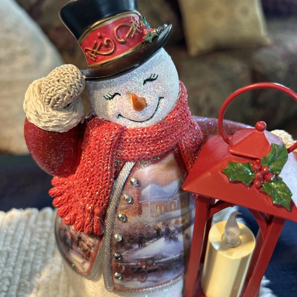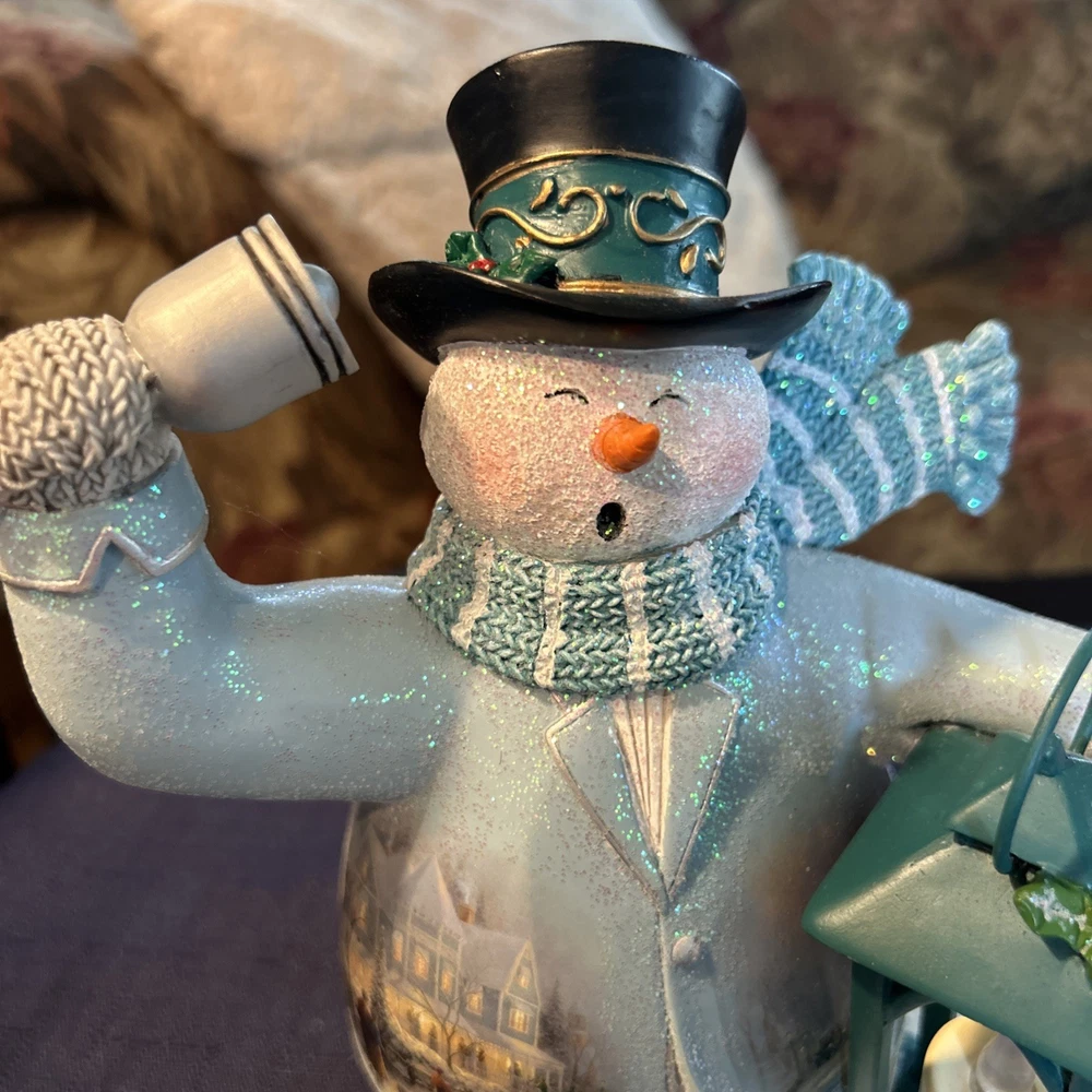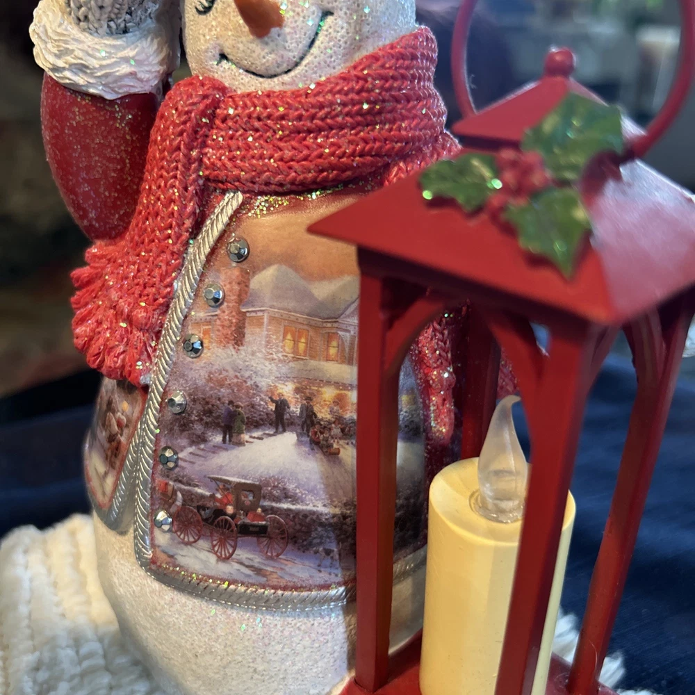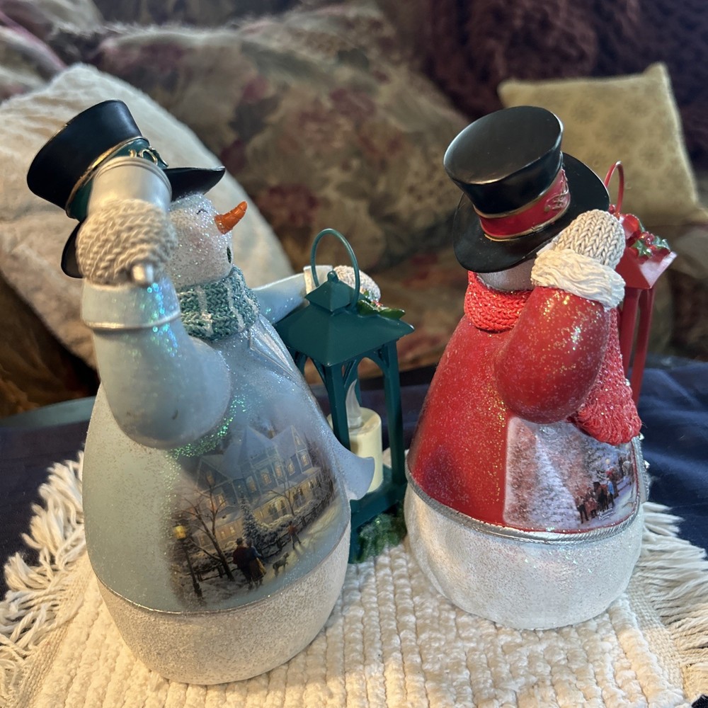 Beautifully charming pair of flameless snowmen. Both hand crafted and painted Thomas Kinkade (The Bradford Exchange) Limited Edition numbered 1- ringing bell in ice blue coat with a green lantern. “Ringing in the Holidays” “Warm Wishes” snowman 0403, 2- tipping hat in bright red coat holding a red lantern “Winter Welcome” “Warm Wishes” 1185. Both are illuminating with black top hats and coordinating knit scarves and mittens that look very realistic. New but no box. Each approx 7 1/2” H x 5” L x 3 1/4” W. Questions welcome.