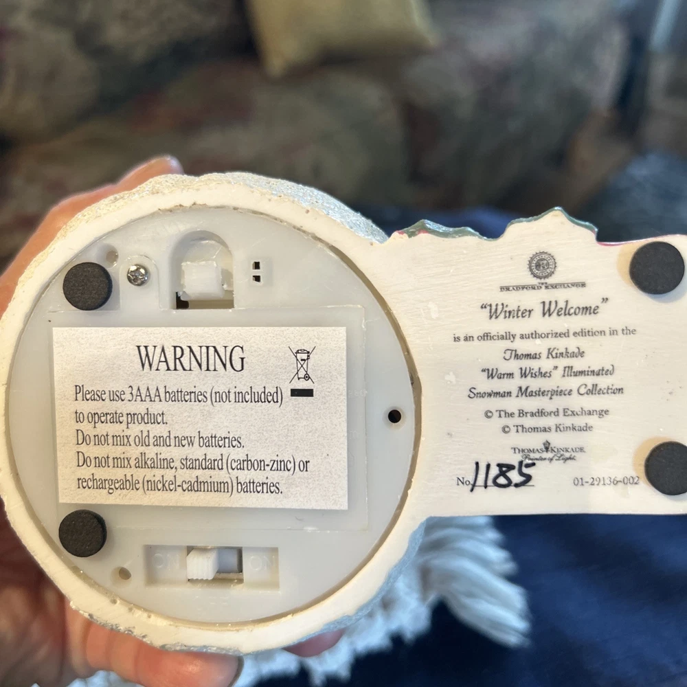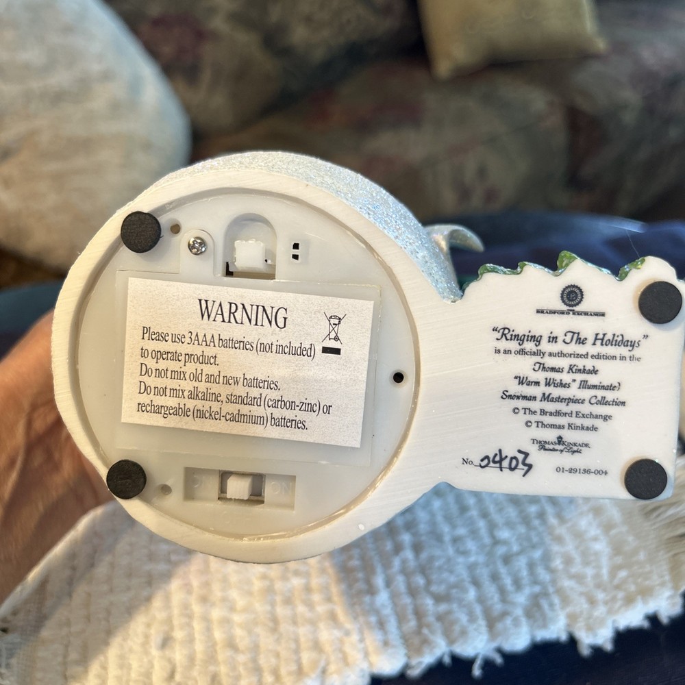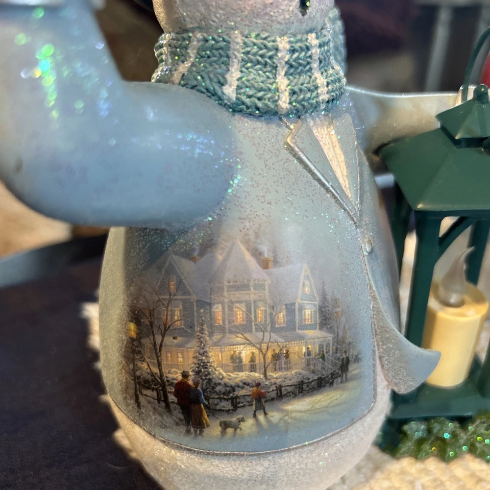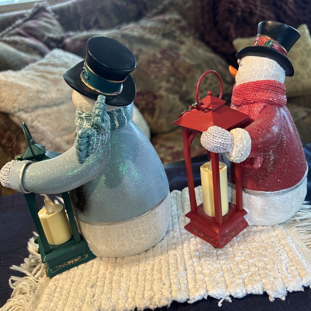 Beautifully charming pair of flameless snowmen. Both hand crafted and painted Thomas Kinkade (The Bradford Exchange) Limited Edition numbered 1- ringing bell in ice blue coat with a green lantern. “Ringing in the Holidays” “Warm Wishes” snowman 0403, 2- tipping hat in bright red coat holding a red lantern “Winter Welcome” “Warm Wishes” 1185. Both are illuminating with black top hats and coordinating knit scarves and mittens that look very realistic. New but no box. Each approx 7 1/2” H x 5” L x 3 1/4” W. Questions welcome.