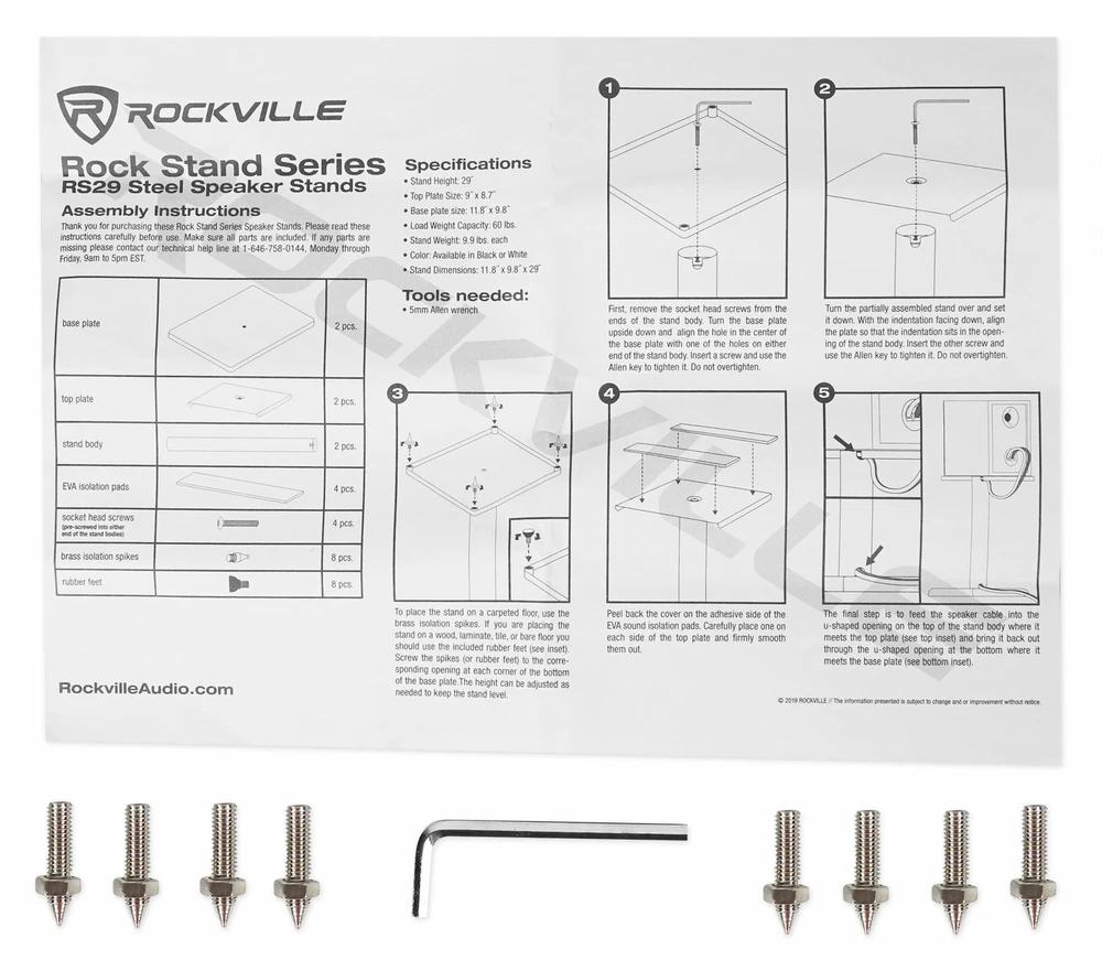 Car Audio & Video Pro Audio Marine Audio Lighting Karaoke Home/Portable Audio Pair Rockville 29" Black Steel Speaker Stands For JBL 308P MKII Monitors Click Thumbnails to Enlarge Condition and Warranty Condition: BRAND NEW IN ORIGINAL PACKAGING Warranty: 1 YEAR AUDIOSAVINGS Product Description Video of RS Series of Stands: Description: The Rockville RS29B Rockstand Speaker stands are designed with appearance, performance, and quality in mind. What makes our stands the best in their class? Robust poles Our poles use thick metal giving you a 60 LB load capacity. This is the best in its class. (Other ones on the market only support 20Lbs). Anti-vibration foam We include EVE foam to eliminate speaker vibrations and stop the speaker from sliding. Supports for hard floor, carpet, and uneven floors included with our stands are fully adjustable rubber feet and brass pegs. The rubber feet are used for hard floors and can be adjusted at different heights If your floor is not completely level. The brass pegs are used in rooms with carpet and can also be adjusted at different heights ensuring your speaker and stand are 100% level. Powder coated long lasting finish Our stands are finished with premium powder coated paint making them beautiful and durable. In addition, this type of finish helps protect the stand from cracks, scratches and chips. Clean installation with cable management Another great feature worth mentioning is the stands cable management. Our stands have discreet holes in the top and bottom of the pole making it easy to hide wires for a nice clean look. Height The height of these stands is 29”. This is the perfect height to have them next to your TV or in your studio. We also offer 21” and 37” models to accommodate any application. 90 Day money back guarantee These stands are built well, sturdy, look great, and out-perform the competition so buy with confidence! We also offer a 90-day money back guarantee. If you don’t love these stands we will send you a pre-paid shipping label and take them back for a full refund. Includes: (2) Stands (2) top plates (2) Bottom plates (4) Screws (4) EVA isolation pads (8) Brass spikes (8) Rubber feet Features: Pair Rockville 29" Black Steel Speaker Stands For JBL 308P MKII Monitors High performance steel speaker stands Robust metal poles support 60 LBS speakers Finished with premium furniture-grade powder coated paint that will not crack, chip, or peel Fully adjustable Brass spikes for carpet installation (even if floor is not even) Fully adjustable Rubber feet for hard floor installation (even if floor is not even) EVA Isolation pads create a non-slip surface as well as improve acoustical performance by eliminating resonance Cable management for wire free clean installation (Hole on top and bottom of pole so you can hide the wires inside the stand) 60 lbs. load capacity allows you to use a heavier speaker without compromising stability. Specifications: Stands Height: 29" Base plate size: 11.8" 9.8" Top Platform size: 9" x 9" Item Load weight capacity: 60 lbs. Item weight per pair 19 lbs. Shipping weight 24 lbs. Color: Black Shipping dimensions 28.3” x 10.6” x 9” Return Policy AudioSavings Return Policy: At Audiosavings, we strongly believe in customer satisfaction and therefore offer free return shipping within 30 days of purchase on all items returned to us within the continental USA. Prior to returning merchandise, contact us and we will give you a return authorization # and a return label. You may return this item for a refund within 30 DAYS of purchase. Warranty Repair/Exchange Period: 1 YEAR If your item is defective or you want to return it for any reason within the first 30 days of when it was delivered to you; you have the following options: We will send you a pre-paid shipping label to replace the item for a brand new one. We will send you a pre-paid shipping label to exchange the item for another item of your choice. If the item you chose is more or less money we will work out the price difference with you. If you are returning a working item in used condition for a refund there will be a 20% used item fee deducted from your refund. All replacements and exchanges are free. Replacement/Processing Time: Your replacement or refund will process within 3-5 business days of when we receive the item. Please note items with physical damage un-related to shipping are not covered under warranty. Registered software cannot be returned. You MUST notify us within 48 hours if you receive an item that was damaged during shipping. Process for returning items Please email us with your eBay user ID, Item code / model #, Condition of the item, and the reason for your return. Please also indicate whether you would like a replacement, an exchange, or a refund. We will supply you with a reference number (RMA #) to put on the package which will ensure quick processing of your return. All returns require a RMA# to be returned back to our facility. Item Code: RS29B Spec 63 Home / About Us / Contact Us / Returns / FAQ's Copyright © 2016 Audio Savings , All rights reserved. | eBay Template Design