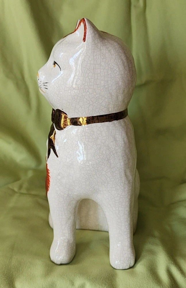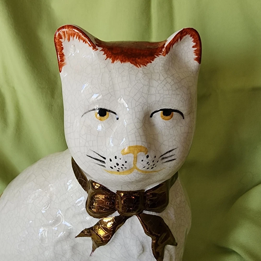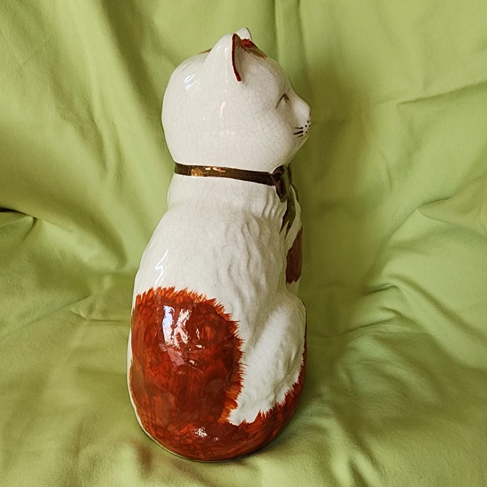 Pair of antique Staffordshire Ware Kent Ceramic Cat Figurines formantle or bookcase. Made/hand painted in Staffordshire England - unmarked. White with ginger/red coloring; shiny copper-color bows. In excellent used condition. All over fine crazing lines asusual for these figurines. All paint intact; one spot on tail of left-facingcat is a factory paint skip (as shown in photo). Please view all pictures as part of the description. Height: 8” Width: 6” Depth: 4” These are lovely and a charming addition to any décor –traditional, Victorian, Arts & Crafts, mid-Century – even whimsical for modern/contemporary. Enjoyed and displayed in a smoke-free home for many years.