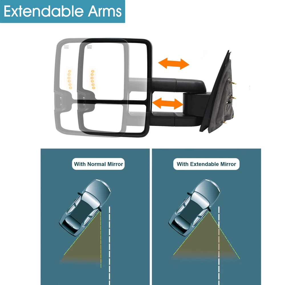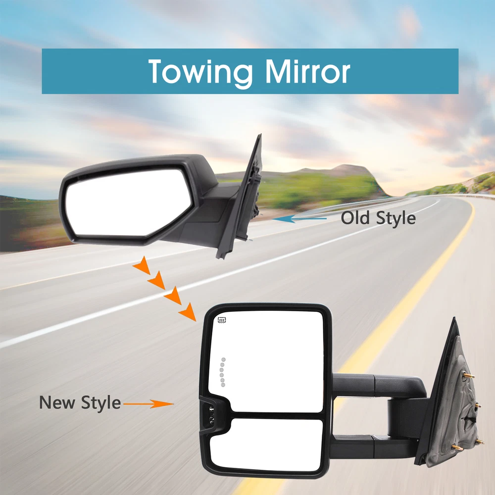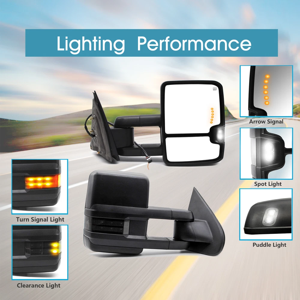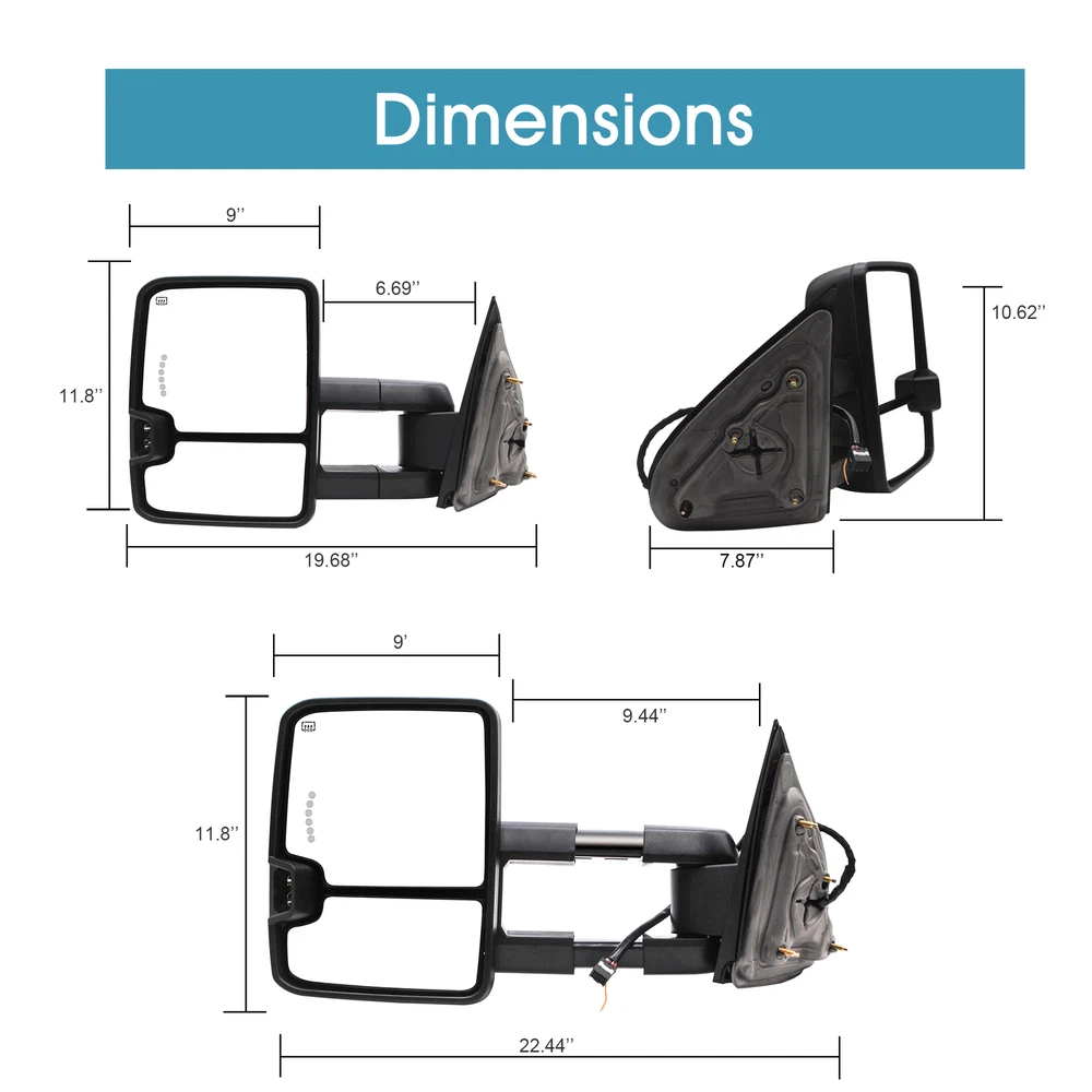 Product Description Detailed description of the product Specifications : Condition New Number Of Pieces 2 Fold Away Manual Fold Warranty 1 Year Color Black Location Passenger Right + Driver Left Side Features: LED Turn Signal Light Arrow Light On Glass Power Adjustment Mirrors Heating Element to Defrost Mirrors Auxiliary Lamp Puddle Light (reserved,need to wire realize) Extend the length of the towing mirror 22.44" Fits: 2014 2015 2016 2017 2018 Chevrolet Silverado 1500 2015 2016 2017 2018 Chevrolet Silverado 2500 2015 2016 2017 2018 Chevrolet Silverado 3500 2014 2015 2016 2017 2018 GMC Sierra 1500 2015 2016 2017 2018 GMC Sierra 2500 2015 2016 2017 2018 GMC Sierra 3500 Note : These mirrors will only work properly on vehicles with these exact options. If your vehicle does not have the options listed, these mirrors may not function properly. No installation guide. Professional installation is highly recommended. In the event the item should fail due to manufacturing defects during intended use, we will replace the part by free.(1 Year Warranty) The puddle lights buyer needs to do own wiring. If you encounter any problems, please contact us and we will provide you with solutions. Thank you! Payment Shipping Returns Contact Us PayPal is our preferred method of payment for all of our eBay sales. For customer service please contact us via eBay MessagesImmediate payment via PayPal is required for all Buy It Now items. If you need special arrangements, please contact us through eBay messages. Generally, all goods will be shipped within 24 hours after the payment on the working day (except for goods sent from China). If you want to cancel the order or change the address, please contact us within 6 hours after payment, otherwise we will not be responsible. It takes 3-5 working days for logistics and transportation to be delivered. If you are not satisfied with your purchase, you may return it, for a refund or replacement - subject to the following: Contact us through eBay messages or the returns link to receive a Returned Merchandise Authorization (RMA) number to ensure proper handling of the return and/or replacement. In order to be eligible for a full refund, less shipping expenses, your returned merchandise must be in its original new condition, as shipped, with all packaging, manuals, and paperwork intact and unaltered. Items which have been opened are returnable, however they will carry a restocking fee. If that product is returned for a refund, the shipping expenses incurred, will be deducted from the refund. If an item is refused, the carrier bills us for shipping both ways, and these expenses incurred on your behalf need to be deducted from your refund If you have a question about a part you should contact us before buying.And If you have any questions after purchase, please contact us and we will provide a satisfactory solution. Payment PayPal is our preferred method of payment for all of our eBay sales. For customer service please contact us via eBay MessagesImmediate payment via PayPal is required for all Buy It Now items. If you need special arrangements, please contact us through eBay messages. Shipping Generally, all goods will be shipped within 24 hours after the payment on the working day (except for goods sent from China). If you want to cancel the order or change the address, please contact us within 6 hours after payment, otherwise we will not be responsible. It takes 3-5 working days for logistics and transportation to be delivered. Returns If you are not satisfied with your purchase, you may return it, for a refund or replacement - subject to the following: Contact us through eBay messages or the returns link to receive a Returned Merchandise Authorization (RMA) number to ensure proper handling of the return and/or replacement. In order to be eligible for a full refund, less shipping expenses, your returned merchandise must be in its original new condition, as shipped, with all packaging, manuals, and paperwork intact and unaltered. Items which have been opened are returnable, however they will carry a restocking fee. If that product is returned for a refund, the shipping expenses incurred, will be deducted from the refund. If an item is refused, the carrier bills us for shipping both ways, and these expenses incurred on your behalf need to be deducted from your refund Contact Us If you have a question about a part you should contact us before buying.And If you have any questions after purchase, please contact us and we will provide a satisfactory solution. Related Products Tow Mirrors Power Heated Fits 2014-2018 Chevy Silverado GMC Sierra LH RH Chrome Tow Mirrors Power Arrow Signal Fits 2007-2013 GMC Yukon XL 2500 Left+Right Side Towing Mirrors Manual Fold For 2009-2012 Chevy Silverado 2500 3500 LH+RH Black Pair Tow Mirrors Power Heated Fits 99-02 Chevy Silverado GMC Sierra 1500 Black Pair Tow Mirrors Power Heated LED Signal Fits 2004-2006 Chevy Tahoe Suburban Pair Tow Mirrors Manual Folding Fits 2002-2006 Chevy Suburban 1500 2500 Black Heated √ √ NO √ √ NO Power √ √ NO √ √ NO Turn Signal Light √ √ NO √ √ √ temperature sensor NO NO NO NO NO NO Puddle Light √ √ NO √ √ NO Arrow Signal Light √ √ NO √ √ NO housing color Chrome Black Black Black Black Black folding Manual Manual Manual Manual Manual Manual fit for 14-18 Chevy Silverado 1500 15-18 Chevy Silverado 2500 3500 14-18 GMC Sierra 1500 15-18 GMC Sierra 2500 3500 07-13 Chevy Avalanche 07-14 Chevy Silverado / GMC Sierra 07-14 Chevy Suburban 07-14 Chevy Tahoe / GMC Yukon 07-13 Chevy Avalanche 07-14 Chevy Silverado / GMC Sierra 07-14 Chevy Suburban 07-14 Chevy Tahoe / GMC Yukon 99-02 Chevy Silverado/GMC Sierra 00-02 Chevy Suburban/GMC Yukon XL 00-02 Chevy Tahoe 02 Chevy Avalanche 03-06 Chevy Silverado/ GMC Sierra 07 Chevy Silverado/ GMC Sierra Classic 03-06 Chevy Avalanche/ Suburban/ Tahoe 03-06 GMC Yukon XL 99-06 Chevy Silverado/GMC Sierra 2007 Chevy Silverado/GMC Sierra 1500 2500 350