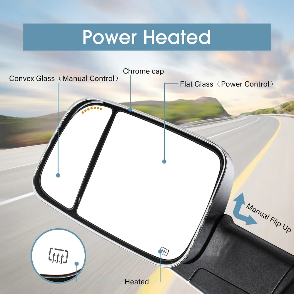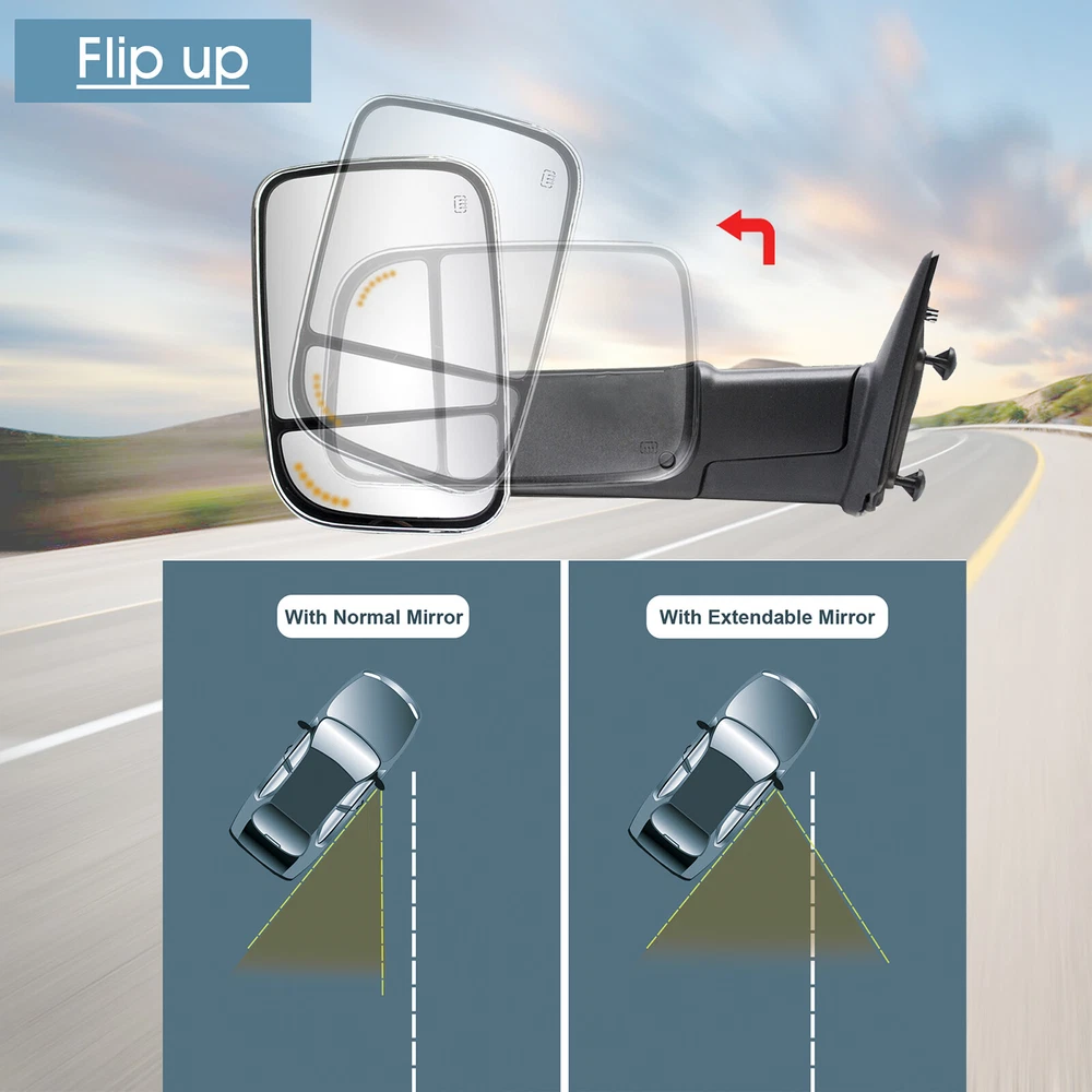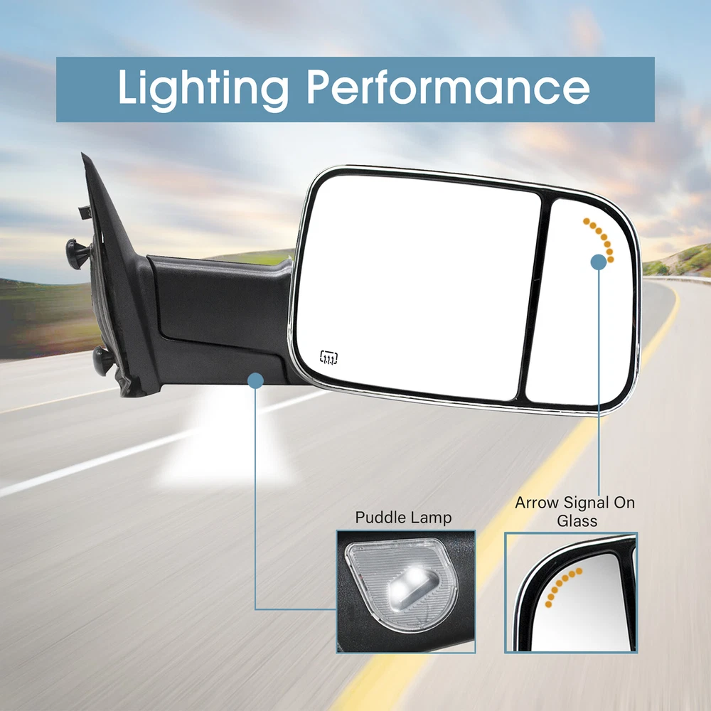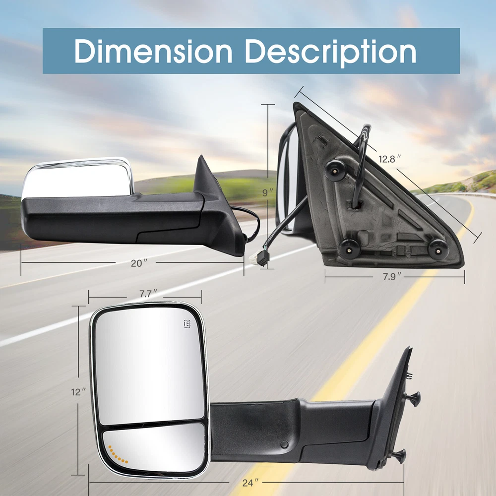 Product Description Detailed description of the product Specifications : Condition New Number Of Pieces 2 Fold Away Manual Fold Warranty 1 Year Color Chrome Location Passenger Right + Driver Left Side Features: Arrow Light On Glass Power Adjustment Mirrors Heating Element to Defrost Mirrors Ambient Air Temperature Sensor Puddle Lights Extend the length of the towing mirror 24" Fits: 2019 2020 2021 2022 2023 Dodge Ram 1500 Classic Towing Mirrors 2009 2010 2011 2012 2013 2014 2015 2016 2017 2018 Dodge Ram 1500 2500 3500 4000 4500 5500 Note : These mirrors will only work properly on vehicles with these exact options. If your vehicle does not have the options listed, these mirrors may not function properly. No installation guide. Professional installation is highly recommended. In the event the item should fail due to manufacturing defects during intended use, we will replace the part by free.(1 Year Warranty) If you encounter any problems, please contact us and we will provide you with solutions. Thank you! Payment Shipping Returns Contact Us PayPal is our preferred method of payment for all of our eBay sales. For customer service please contact us via eBay MessagesImmediate payment via PayPal is required for all Buy It Now items. If you need special arrangements, please contact us through eBay messages. Generally, all goods will be shipped within 24 hours after the payment on the working day (except for goods sent from China). If you want to cancel the order or change the address, please contact us within 6 hours after payment, otherwise we will not be responsible. It takes 3-5 working days for logistics and transportation to be delivered. If you are not satisfied with your purchase, you may return it, for a refund or replacement - subject to the following: Contact us through eBay messages or the returns link to receive a Returned Merchandise Authorization (RMA) number to ensure proper handling of the return and/or replacement. In order to be eligible for a full refund, less shipping expenses, your returned merchandise must be in its original new condition, as shipped, with all packaging, manuals, and paperwork intact and unaltered. Items which have been opened are returnable, however they will carry a restocking fee. If that product is returned for a refund, the shipping expenses incurred, will be deducted from the refund. If an item is refused, the carrier bills us for shipping both ways, and these expenses incurred on your behalf need to be deducted from your refund If you have a question about a part you should contact us before buying.And If you have any questions after purchase, please contact us and we will provide a satisfactory solution. Payment PayPal is our preferred method of payment for all of our eBay sales. For customer service please contact us via eBay MessagesImmediate payment via PayPal is required for all Buy It Now items. If you need special arrangements, please contact us through eBay messages. Shipping Generally, all goods will be shipped within 24 hours after the payment on the working day (except for goods sent from China). If you want to cancel the order or change the address, please contact us within 6 hours after payment, otherwise we will not be responsible. It takes 3-5 working days for logistics and transportation to be delivered. Returns If you are not satisfied with your purchase, you may return it, for a refund or replacement - subject to the following: Contact us through eBay messages or the returns link to receive a Returned Merchandise Authorization (RMA) number to ensure proper handling of the return and/or replacement. In order to be eligible for a full refund, less shipping expenses, your returned merchandise must be in its original new condition, as shipped, with all packaging, manuals, and paperwork intact and unaltered. Items which have been opened are returnable, however they will carry a restocking fee. If that product is returned for a refund, the shipping expenses incurred, will be deducted from the refund. If an item is refused, the carrier bills us for shipping both ways, and these expenses incurred on your behalf need to be deducted from your refund Contact Us If you have a question about a part you should contact us before buying.And If you have any questions after purchase, please contact us and we will provide a satisfactory solution. Related Products Tow Mirrors Power For 2015 2016 2017 2018 Dodge Ram 1500 2500 LH+RH Side Chrome Pair Towing Mirrors Power Heated For 2009-2018 Dodge Ram 1500 2500 3500 Black Pair Tow Mirrors Power Heated Turn Signal Fits 2009-2023 Ram 1500 Classic Chrome Pair Tow Mirrors Power Heated Fits 2009-2023 Dodge Ram 1500 Classic LH+RH Chrome Piar Towing Mirrors Manual For 2006 Ram 1500/2500/3500 Left+Right Side Chrome Power Turn Signal Fits 02-08 Dodge Ram 1500 Towing Mirrors Left+Right Chrome Cap Heated √ √ √ √ √ √ Power √ √ √ √ √ √ Turn Signal Light √ NO √ NO NO √ temperature sensor √ √ √ √ NO NO Puddle Light √ √ √ √ √ √ Arrow Signal Light NO √ NO √ √ NO housing color Chrome Black Chrome Chrome Chrome Chrome folding Manual Manual Manual Manual Manual Manual fit for 09-18 Ram 1500 2500 3500 4500 5500 09-18 Ram 1500 2500 3500 4500 5500 2019-2023 Ram 1500 Classic 2019-2023 Ram 1500 Classic 02-08 Ram 1500 03-09 Ram 2500 3500 02-08 Ram 1500 03-09 Ram 2500 3500 [22 Pin Plug] On Nov 29, 2024 at 11:16:25 PST, seller added the following information: