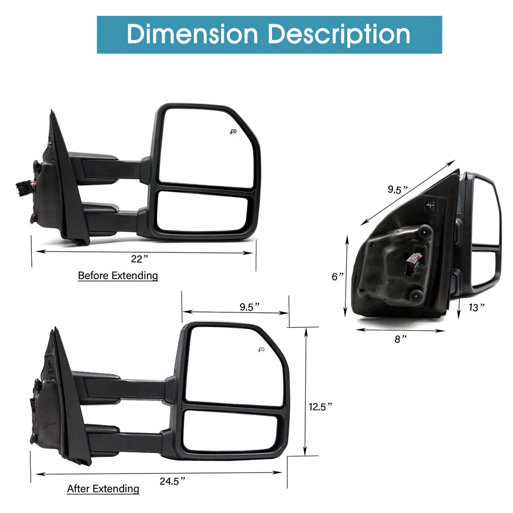 Product Description Detailed description of the product Specifications : Condition New Number Of Pieces 2 Fold Away Manual Fold Warranty 1 Year Color Black Location Passenger Right + Driver Left Side Features: Connector 8 Pin Plug LED Turn Signal Light Power Adjustment Mirrors Heating Element to Defrost Mirrors Black Housing Manual Extendable Arms Ambient Air Temperature Sensor Fits: 2015 2016 2017 2018 2019 Ford F-150 Towing Mirrors Pickup Truck Note : These mirrors will only work properly on vehicles with these exact options. If your vehicle does not have the options listed, these mirrors may not function properly. No installation guide. Professional installation is highly recommended. In the event the item should fail due to manufacturing defects during intended use, we will replace the part by free.(1 Year Warranty) If you encounter any problems, please contact us and we will provide you with solutions. Thank you! Payment Shipping Returns Contact Us PayPal is our preferred method of payment for all of our eBay sales. For customer service please contact us via eBay MessagesImmediate payment via PayPal is required for all Buy It Now items. If you need special arrangements, please contact us through eBay messages. Generally, all goods will be shipped within 24 hours after the payment on the working day (except for goods sent from China). If you want to cancel the order or change the address, please contact us within 6 hours after payment, otherwise we will not be responsible. It takes 3-5 working days for logistics and transportation to be delivered. If you are not satisfied with your purchase, you may return it, for a refund or replacement - subject to the following: Contact us through eBay messages or the returns link to receive a Returned Merchandise Authorization (RMA) number to ensure proper handling of the return and/or replacement. In order to be eligible for a full refund, less shipping expenses, your returned merchandise must be in its original new condition, as shipped, with all packaging, manuals, and paperwork intact and unaltered. Items which have been opened are returnable, however they will carry a restocking fee. If that product is returned for a refund, the shipping expenses incurred, will be deducted from the refund. If an item is refused, the carrier bills us for shipping both ways, and these expenses incurred on your behalf need to be deducted from your refund If you have a question about a part you should contact us before buying.And If you have any questions after purchase, please contact us and we will provide a satisfactory solution. Payment PayPal is our preferred method of payment for all of our eBay sales. For customer service please contact us via eBay MessagesImmediate payment via PayPal is required for all Buy It Now items. If you need special arrangements, please contact us through eBay messages. Shipping Generally, all goods will be shipped within 24 hours after the payment on the working day (except for goods sent from China). If you want to cancel the order or change the address, please contact us within 6 hours after payment, otherwise we will not be responsible. It takes 3-5 working days for logistics and transportation to be delivered. Returns If you are not satisfied with your purchase, you may return it, for a refund or replacement - subject to the following: Contact us through eBay messages or the returns link to receive a Returned Merchandise Authorization (RMA) number to ensure proper handling of the return and/or replacement. In order to be eligible for a full refund, less shipping expenses, your returned merchandise must be in its original new condition, as shipped, with all packaging, manuals, and paperwork intact and unaltered. Items which have been opened are returnable, however they will carry a restocking fee. If that product is returned for a refund, the shipping expenses incurred, will be deducted from the refund. If an item is refused, the carrier bills us for shipping both ways, and these expenses incurred on your behalf need to be deducted from your refund Contact Us If you have a question about a part you should contact us before buying.And If you have any questions after purchase, please contact us and we will provide a satisfactory solution. Related Products Towing Mirror Power Heated For 2015-2020 Ford F150 Pickup Driver LH Side Black Towing Mirror Power Heated Turn Signal Fits 2016-2020 Ford F-150 Driver LH Side Power Turn Signal Towing Mirror Fits 2016-2019 Ford F150 Pickup Truck Right Side Pair Towing Mirrors Power Heated Temp Sensor Fits 2018-2020 Ford F-150 Black Tow Mirrors Power Heated Turn Signal Fits 2004-2014 Ford F-150 Pickup Left Right Heated √ √ √ √ √ Power √ √ √ √ √ Turn Signal Light √ √ √ √ √ temperature sensor √ NO √ √ NO Puddle Light √ √ √ √ √ Clearance Light √ √ √ √ √ housing color Chrome Black Black Black Black folding Manual Manual Manual Manual Manual fit for 2015-2020 Ford F-150 [8 Pin Plug] 2015-2020 Ford F-150 [8 Pin Plug] 2015-2020 Ford F-150 [8 Pin Plug] 2015-2020 Ford F-150 [8-22 Pin Plug] 2004-2014 Ford F-150 [22 Pin Plug] On Dec 3, 2024 at 10:57:15 PST, seller added the following information: