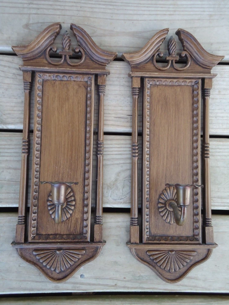 Pair VTG Wall Sconce Candle Holder Hanging Decoration Faux Wood 70s Library Hall Approximately 18.5 tall x 6.5 inches wide