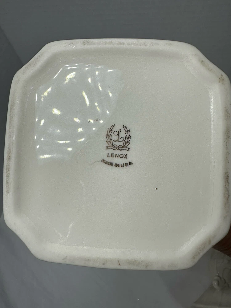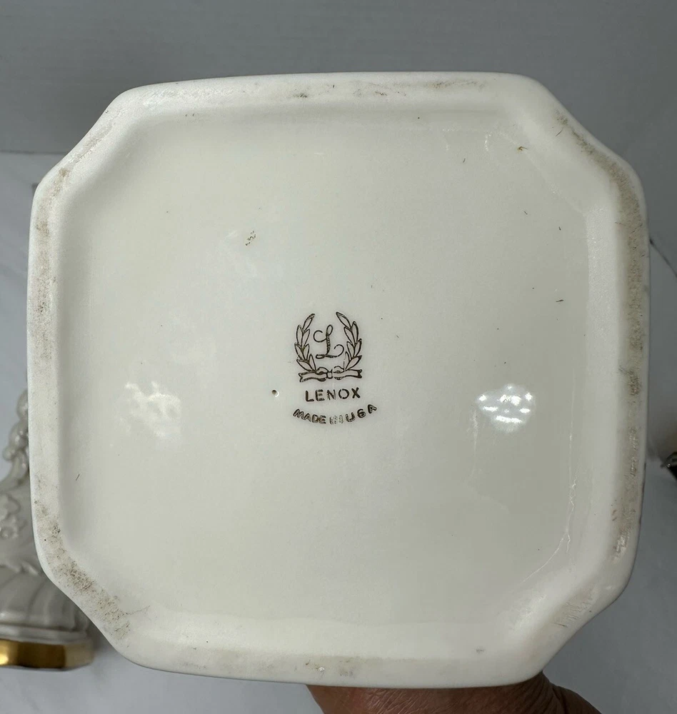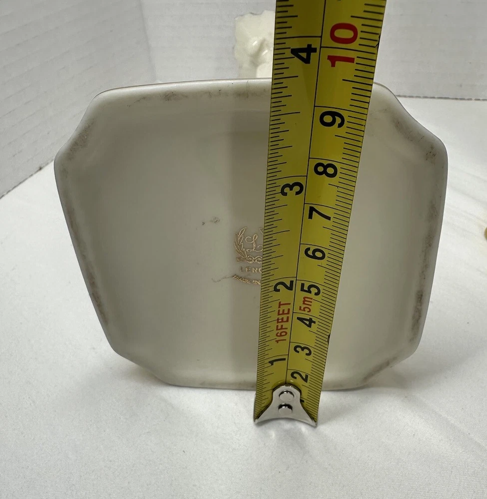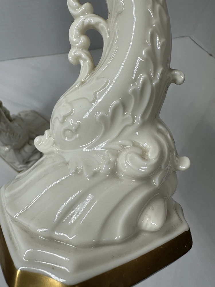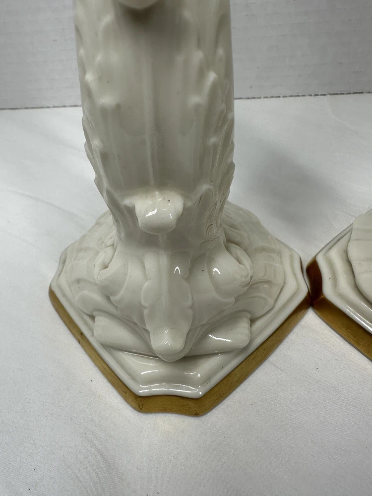 This is a pair of vintage Lenox candle holders featuring a dolphin design adorned with 24K gold trim. The candle holders stand at a tall 10 inches in height and width, with a glossy cream finish adding an elegant touch to the overall look. Perfect for collectors or those seeking decorative pieces with a touch of sophistication, these candle holders embody the classic Lenox quality and charm in their design.