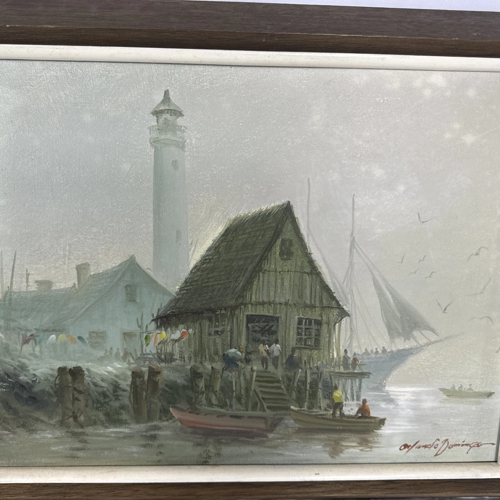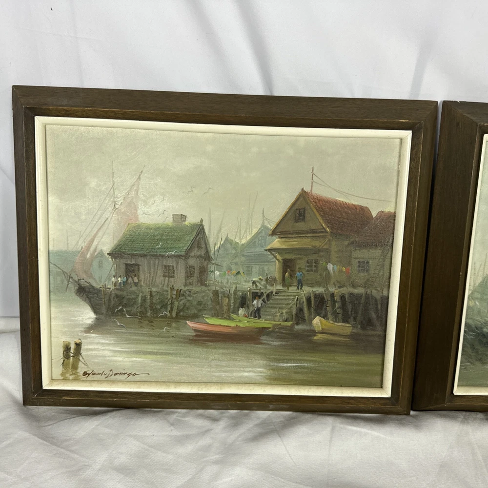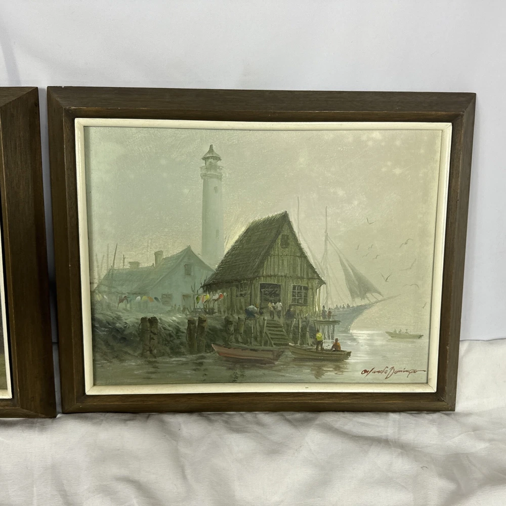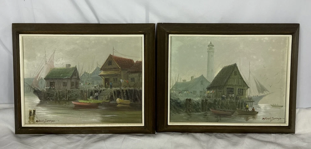 Pair Vintage Original Acrylic Canvas Framed Harbor Boat Village Orlando Domingo Nice original frames. Measures 19.25" x 15.25". Beautiful harbor / marina scene skillfully done by Orlando Domingo. Not a print of reproduction, a one of a kind, real painting made by an artist’s hand. Do you live by the water? Sail? An appreciator of nautical themes or style? This ones another great piece for any of the above or just someone who loves being near the water. Condition is great preowned. No defects to the picture, usual wear on sides, edges and back consistent with age.