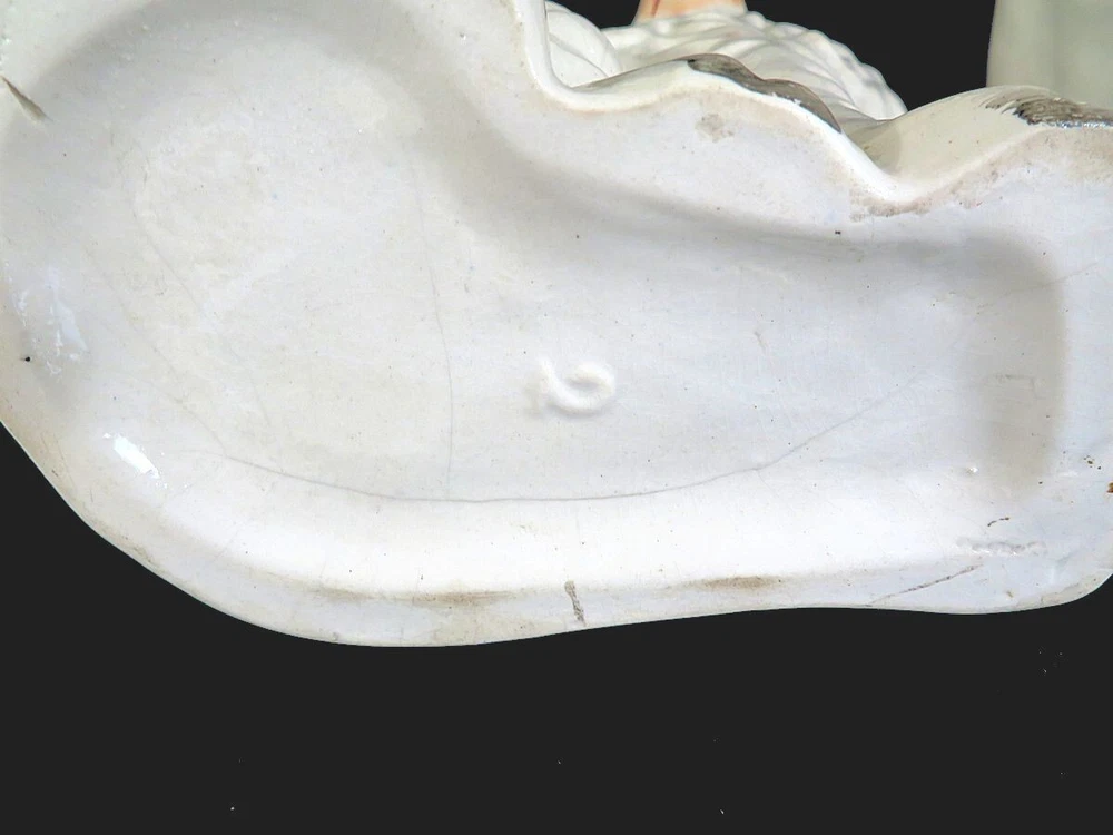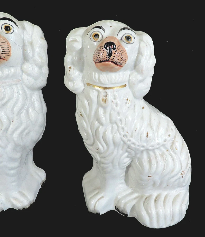 A pair of 19th century white Staffordshire hearth/wally dogs. 10" tall. There is loss of gold paint on both. One is undamaged. The other has crazing and some apparent faint hairlines and a firing crack along the mold line on the head. They still display well. SEE PHOTOS. SOLD AS IS. Priced accordingly.