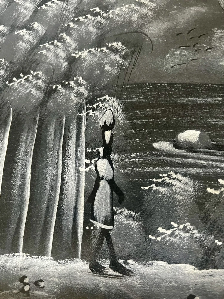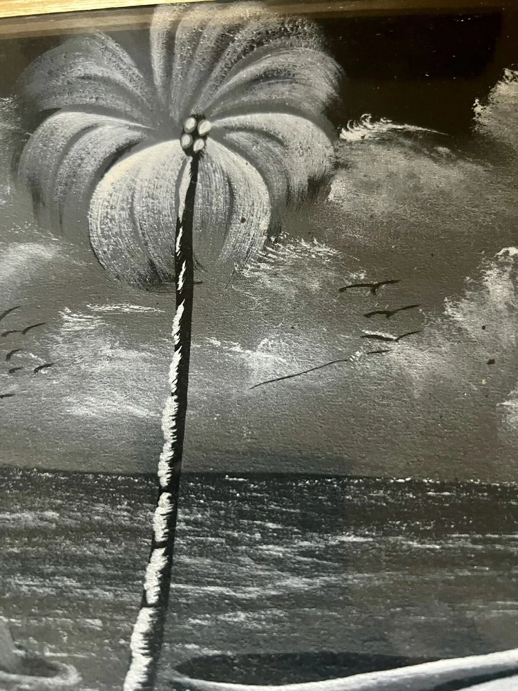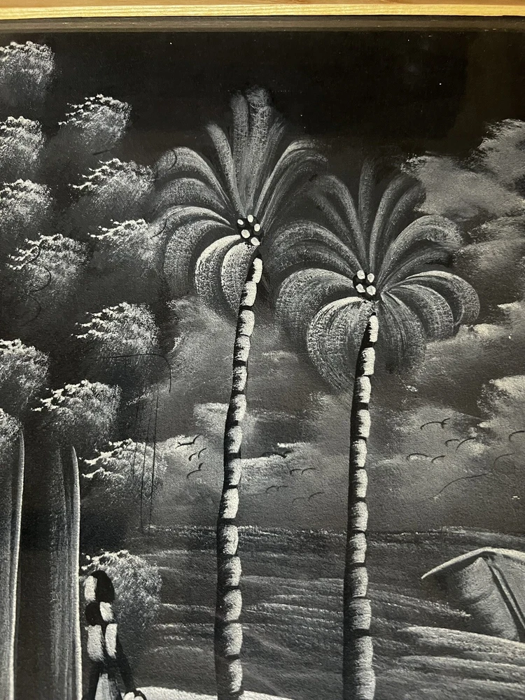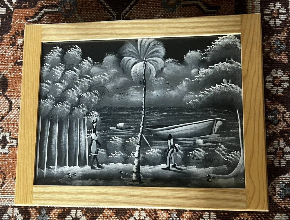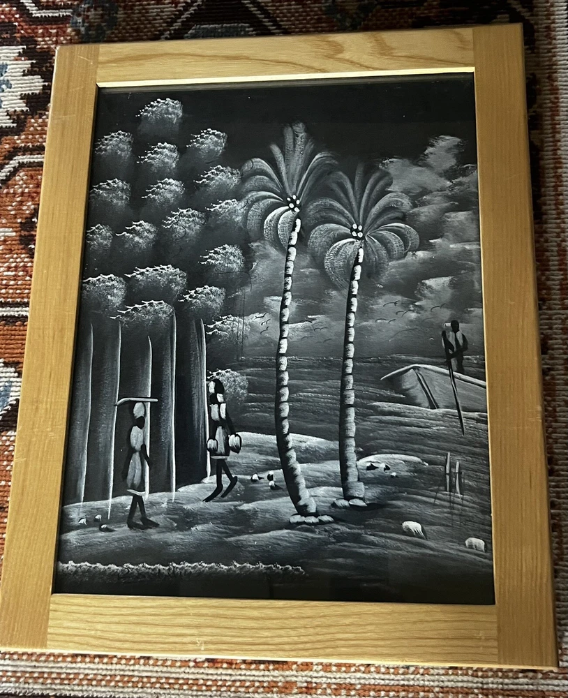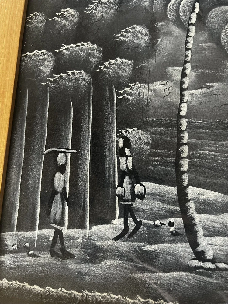 Pair of framed Haitian Folk Art Paintings. One is signed. 18” x 14”. I believe these are oil paints on cloth. Beautiful details! Choose ground shipping to save on shipping costs