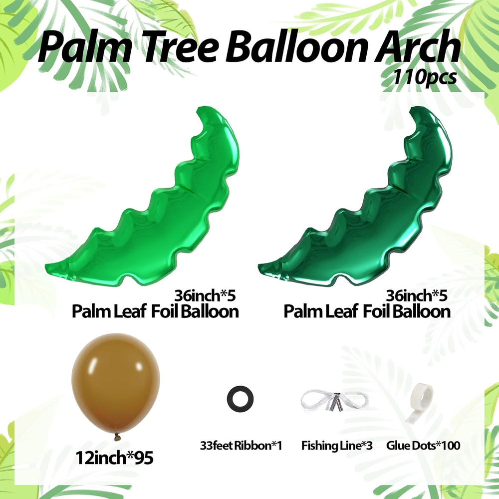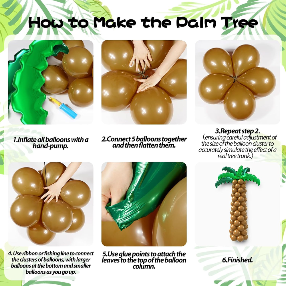 Store New Arrivals Add to Favorite View Feedback Contact Fast deliveries to the customer's home Quality customer service John Make the customers happy! Palm Tree Balloons Set, Hawaiian Party Decorations with Green Tree Leaves Foil Brown Balloons for Hawaii Luau Pool Tropical Baby Shower Birthday Party Decorations Description What You Receive: The palm tree balloon kit includes 36inch green palm leavesx5, 36inch light green palm leavesx5, 12inch brown balloonsx95, glue dotsx100, ribbonx1, cordx3 Great Quality: The plam tree balloons are crafted from great quality latex, which is thick and not easy to pop. The tropical balloons can be filled with air or helium, which can last for a long time Simple to Assemble: Use the included ribbon, glue dots, and decorative strip to easily build your palm tree balloon kit. Inflate balloons with a hand pump, tie five together with fishing line, and press flat to form clusters. Connect clusters to shape the tree. Inflate a slightly smaller balloon for the top, then flatten four more for the tree top. Attach leaves using glue dots. Your tropical decoration is ready Wide Application: The balloons are great for luau party decorations, hawaiian party decorations, tropical party decorations, tropical baby shower decorations, pool party decorations Warm Tips: If there are any problems with the balloon kit, we will try to solve them for you, so that you can enjoy the party with peace of mind Product Description CPSIA Cautionary Statement Choking Hazard - Balloon Unit Count 110.0 Count Item dimensions L x W x H 9.06 x 3.74 x 2.36 inches Color Green, Light Green, Brown Product Dimensions 9.06 x 3.74 x 2.36 inches Material Rubber Country of Origin China Theme Tropical Item Weight 14.9 ounces Shape Round Manufacturer recommended age 12 months and up Occasion Summer Party, Baby Shower, Anniversary, Father's Day, Birthday Included Components glue dots, ribbon, fishing line ABOUT US We offer the best prices around on high quality products. Our E-store includes media such as books, movies, music and games while offering electronics, toys, sporting apparel, clothing, tools, general home, garden items and more. SHIPPING We are always working hard to ensure your package arrives as soon as possible. Please understand that some factors like weather, high postal traffic, and the performance of shipping companies are outside of our control. We offer free shipping to the lower 48 states and ship within 2 business days of payment, usually sooner. We do not accept P.O. Boxes. Please provide a physical address. For shipping outside of the continental USA, we only use eBay's Global Shipping Program. The item is shipped to KY and then sent to the rest of the world. International customers are responsible for all duties and taxes. Continue to 'check out' to calculate costs for shipping the item to your country. Messages regarding eBay's Global Shipping Program MUST be directed at eBay EXCLUSIVELY. RETURNS We offer a 30-Day Return Policy on items in which you are not completely satisfied with. You have the option of a full-refund or an exchange of the item. No returns are available on items shipped outside of the USA PAYMENT We accept PayPal. CONTACT US This page content is yet to come Please ad us to your favorite seller and visit again later Thank You CUSTOMER SATISFACTION We try our very best to make sure every customer is completely satisfied. If there's a problem, message us! We're happy to help. WE ACCEPT