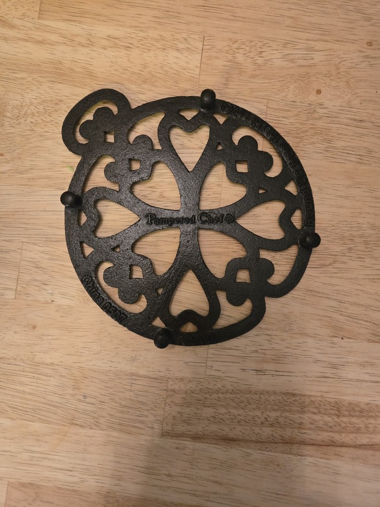 The Pampered Chef Round-Up from the Heart 2007 Trivet is a medium-sized kitchen accessory made of cast iron with a copper finish. The brand, Pampered Chef, is known for producing high-quality kitchen tools, and this trivet is no exception. Originating from China, this trivet adds both style and functionality to any kitchen or dining area.