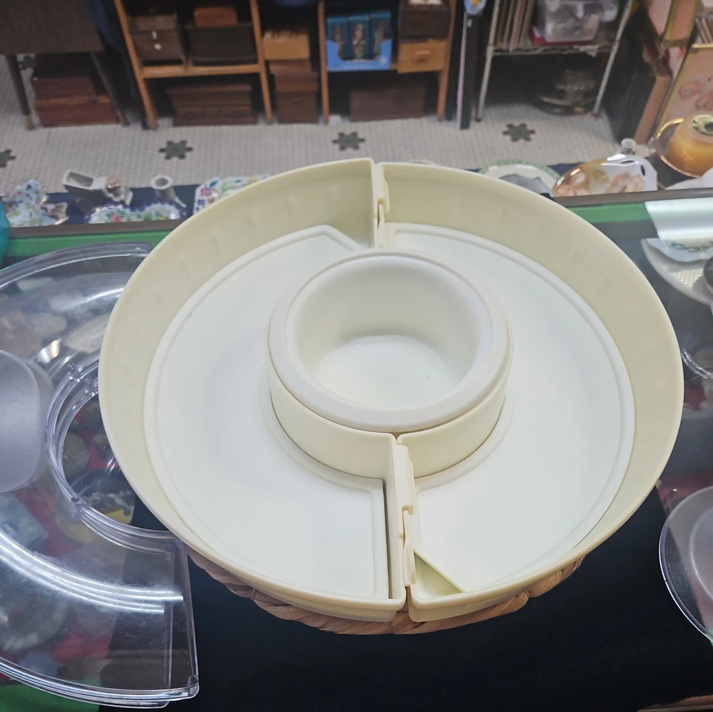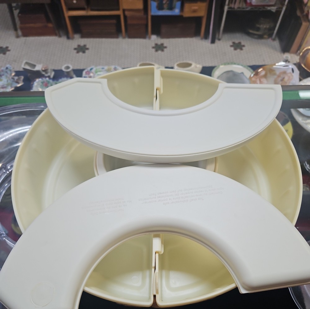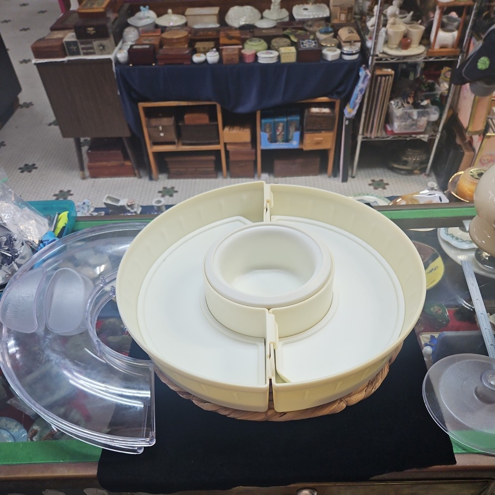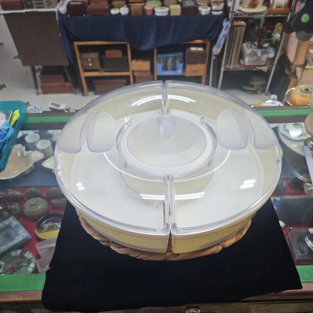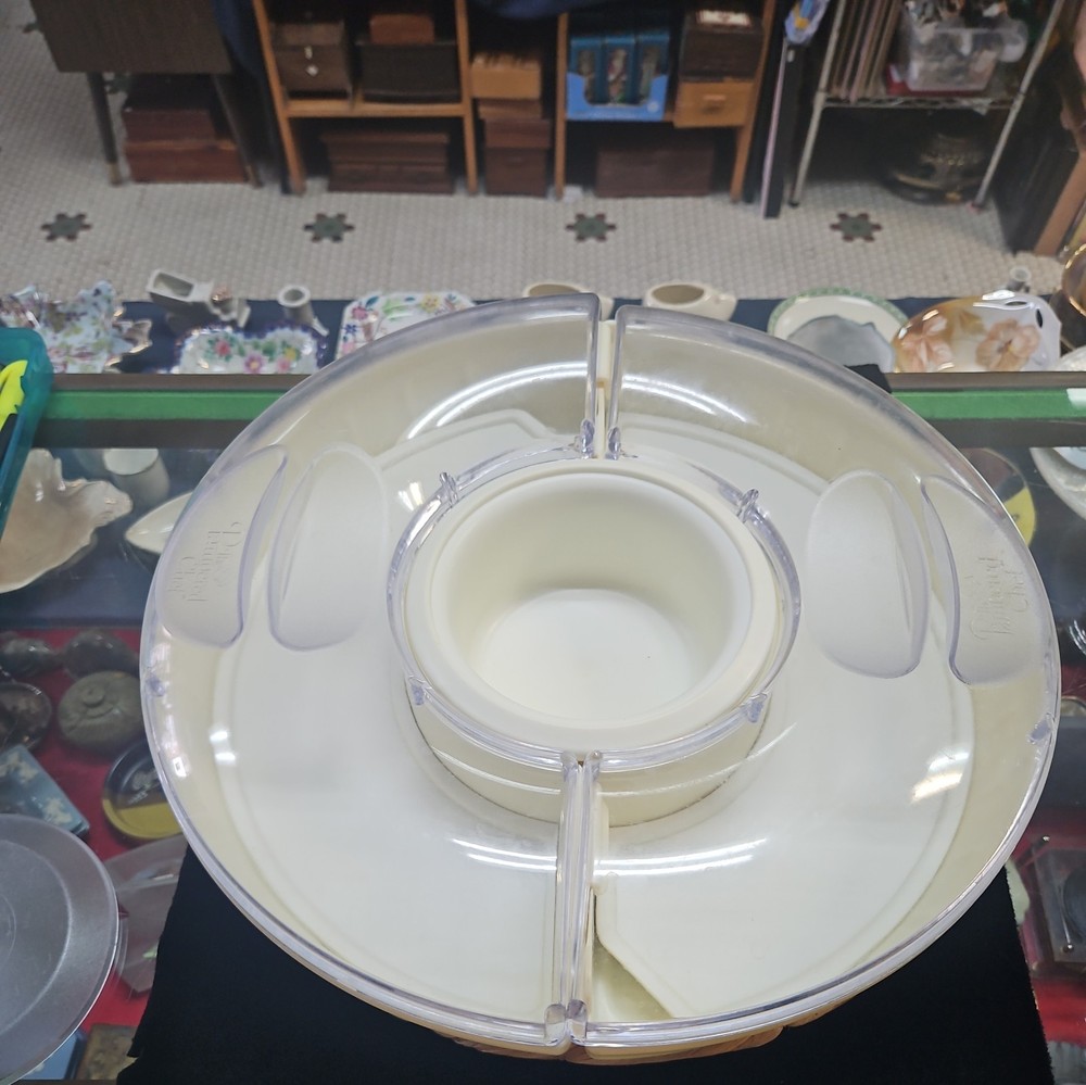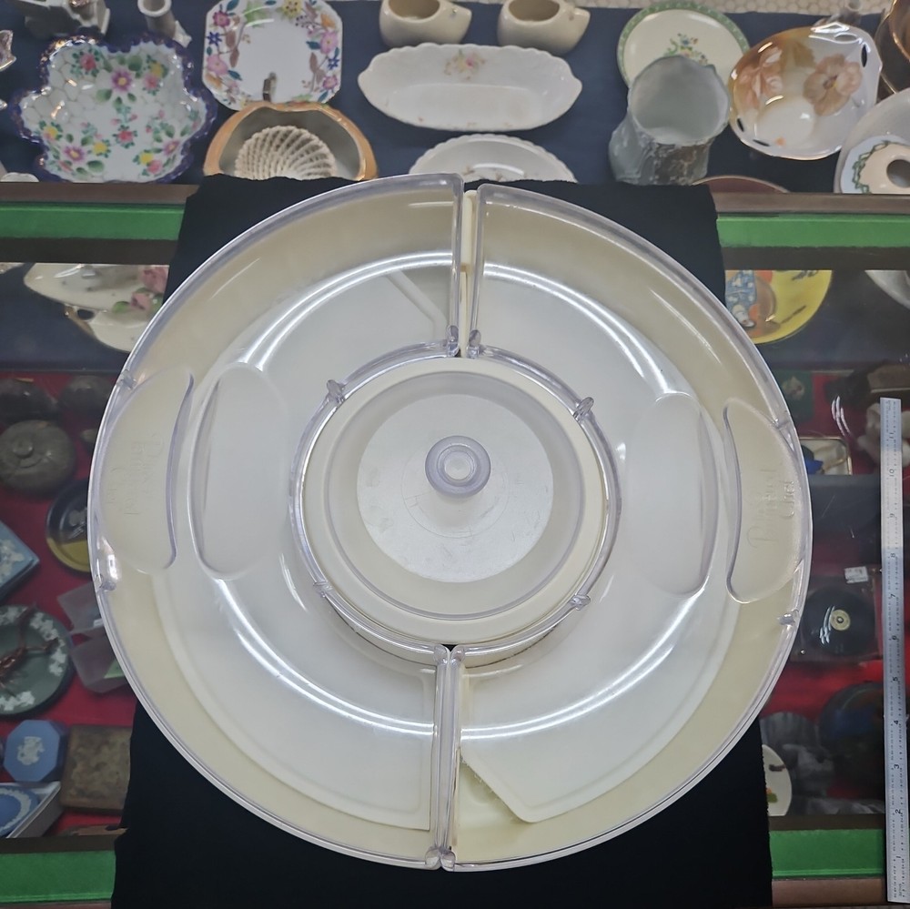 The Pampered Chef Chillzanne Cool Sectional Server Round Appetizer Tray is a versatile and stylish serving tray made of acrylic material. This medium-sized tray features a round shape with three compartments, making it perfect for serving various appetizers or snacks during all occasions. The solid white color and matte finish add a touch of elegance to any table setting. With a diameter of 14 inches and a weight of 5 pounds, this tray is easy to transport and store while keeping your food fresh and organized. Made in the United States by the trusted brand Pampered Chef.