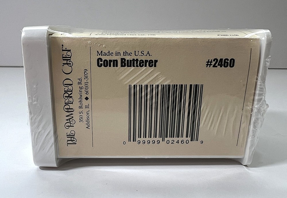 The Pampered Chef Corn Butterer model #2460 is a wonderful little kitchen tool made in the USA that makes eating corn-on-the-cob so much more fun (if it can get any more fun.) This white plastic gadget stands at 3 inches tall by 2 inches wide and is designed specifically for spreading butter on corn cobs with ease. The open end is curved to fit around an ear of corn for even coverage. Just add a half stick of butter and press the the plunger mechanism to push butter forward between uses. The corn butterer also has a storage cover that keeps your butter fresh in the fridge and ready to use. It can also be used to baste bread or rolls, or for roasting chickens or turkeys. It is dishwasher safe. The model 2460 is another well thought-out design from The Pampered Chef line of kitchen tools. This little tool will help keep your corn fresh, hot and flavorful with every slather of butter. Yum...can't wait!