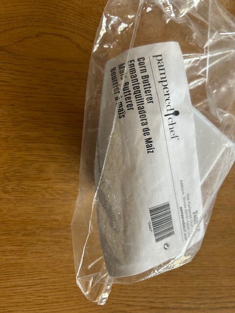 This is a Pampered Chef Corn Butterer model 2460 in white plastic, standing 3 inches tall and weighing 1.5 oz.