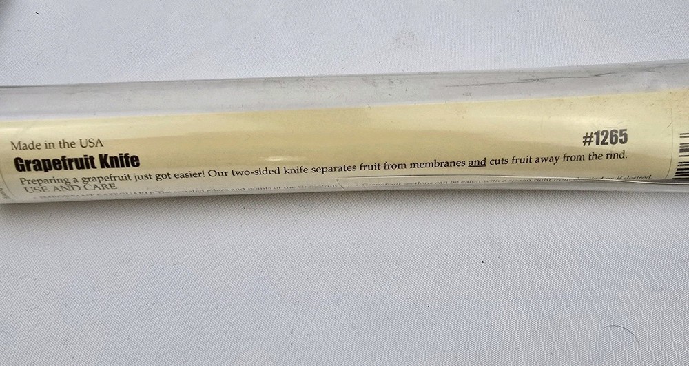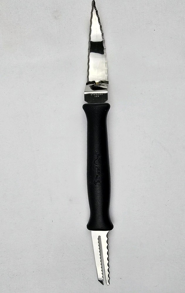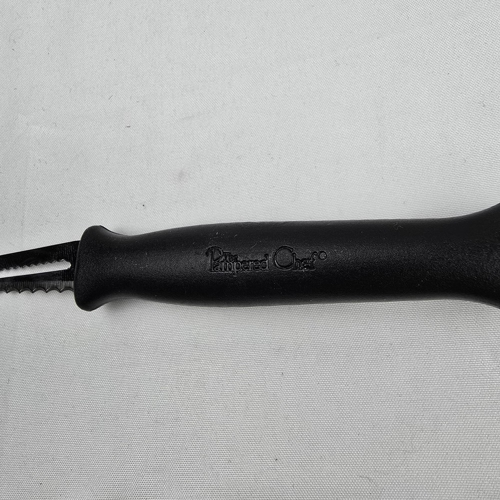 The Pampered Chef Grapefruit Knife 1265 is a two-sided tool designed specifically for cutting grapefruit. Made of stainless steel and plastic, this black knife features a unique compressor making method for easy and convenient use. With a compact length of less than 10 inches, this retired model comes in a tube with instructions, making it a practical and stylish addition to any kitchen. Proudly made in the United States by the trusted brand Pampered Chef, this grapefruit knife is a must-have for those who enjoy fresh citrus fruits.