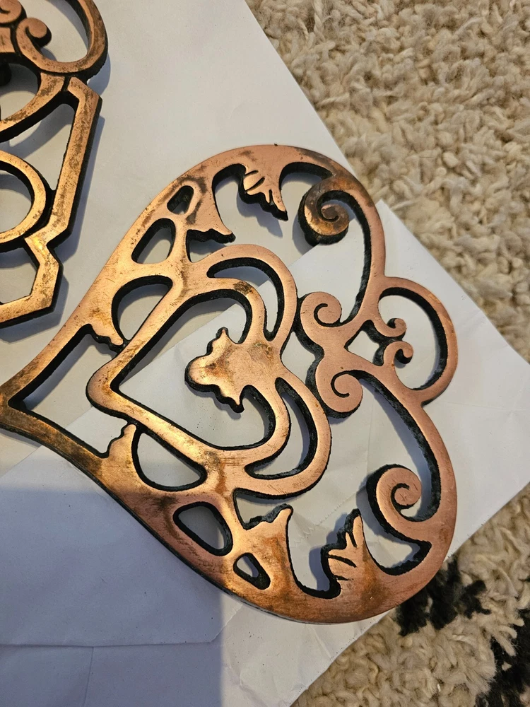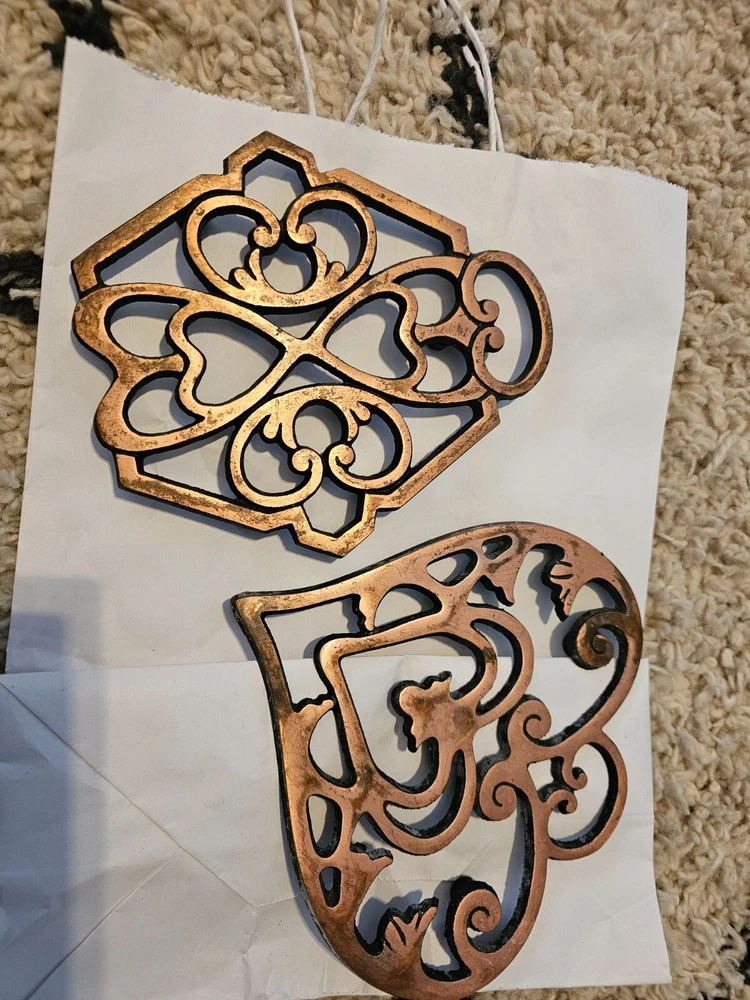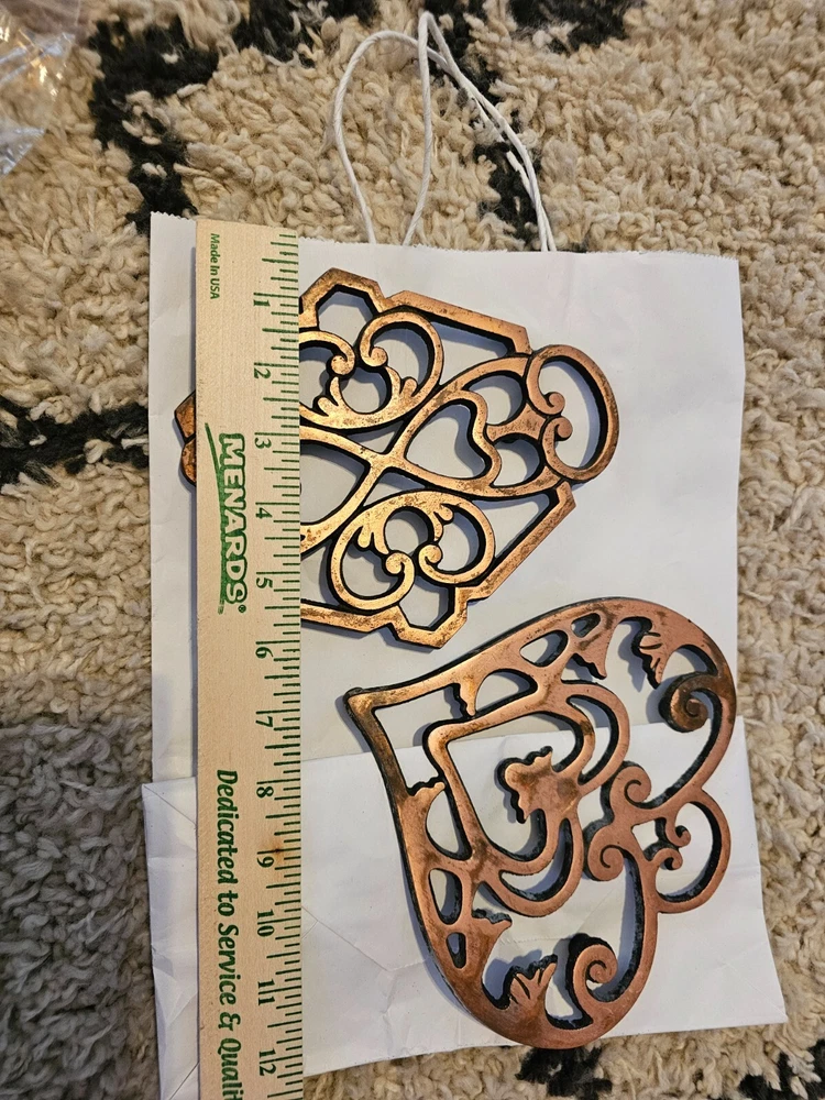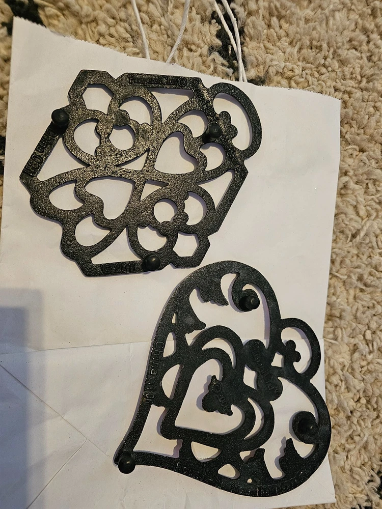 This is a set of two Pampered Chef Round-Up from the Heart 2006 and 2011 trivets. They are medium-sized trivets made of copper-colored cast iron. The trivets have a decorative design and a copper finish, perfect for protecting surfaces from hot dishes in the kitchen or dining room. Made in China, these trivets are both functional and stylish additions to your home decor. Cute and functional. See pictures for condition While I'm just getting started listing on Ebay and learning how things work now, I am not completely new to the Ebay. 18 years ago I was a single Mom of 2 that made our living selling on Ebay. Fast forward and a few more kids and wonderful husband I have decided to try to earn a few extra bucks and give it a whirl. I'm anxious to build a positive feedback score with lots of happy customers. I do my very very best to research and list my items accordingly. I am not a professional antiquer or even close to it. Please take the time to ask questions about an item or let me know if you feel I have not represnted something accuratley. You may also notice that some of my pictures and listings appear to be in hospitals. I spend 6 hours a week getting infusions and have learned it is a great time to stick some listings up