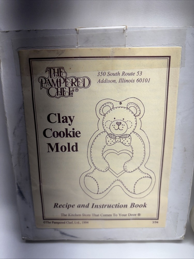 The Pampered Chef Teddy Bear Heart Stoneware Cookie Mold Press is a vintage baking tool from 1991 that allows you to easily make heart-shaped bear cookies. Made of durable stoneware in a beige color, this cookie mold press is a charming addition to any kitchen. With its small size and adorable bear design, it is perfect for crafting cookies for all occasions, especially those with a bear theme. Made in the United States by the trusted brand Pampered Chef, this cookie mold is sure to bring joy to your baking experience. Looks to not be used open box