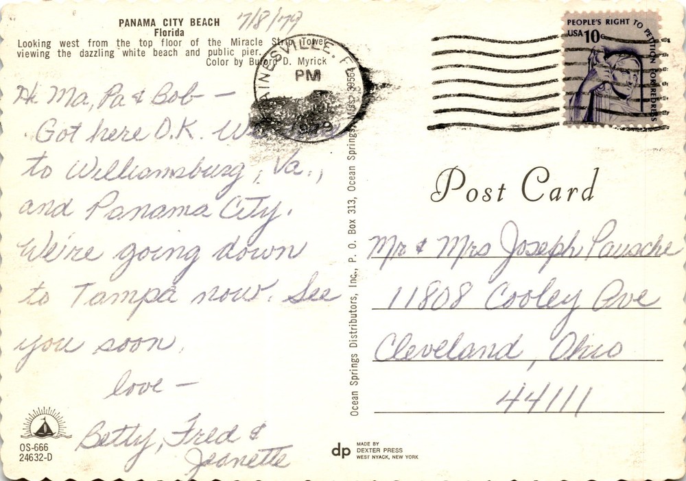 MAKE AN OFFER. THE MORE YOU BUY THE BETTER DEAL I WILL ACCEPT The postcard is a colorful image of Panama City Beach, Florida, taken from the top floor of the Miracle Strip Tower. The view captures the stunning white beach and a public pier. The postcard is addressed to Mr. & Mrs. Joseph Pausche in Cleveland, Ohio, from Betty, Fred, and Jeanette.