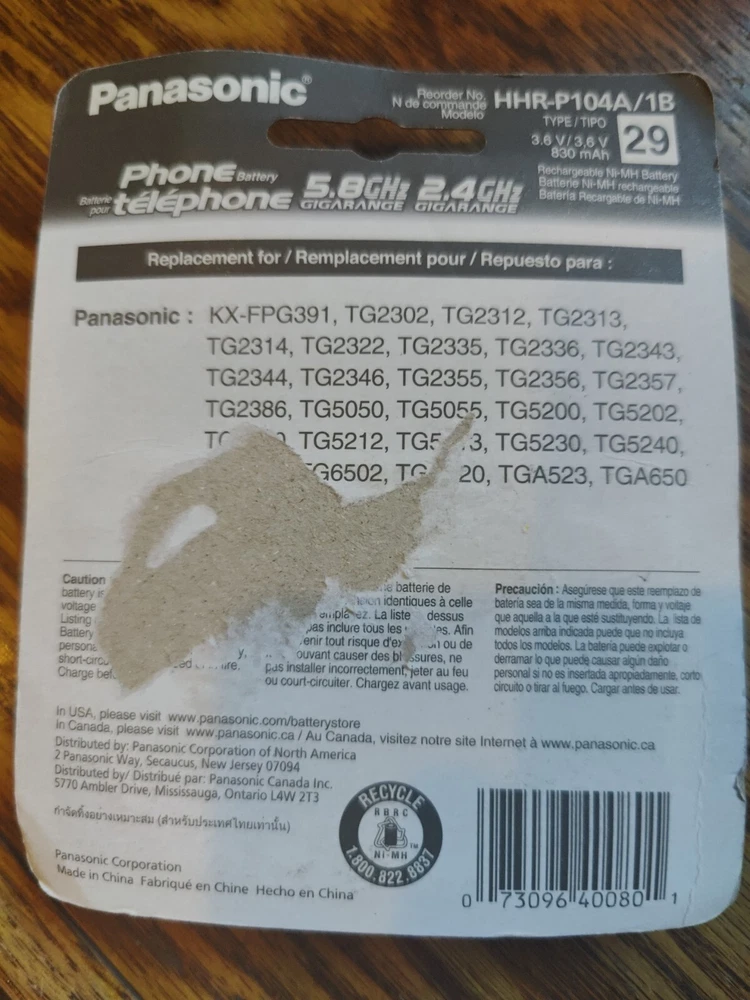 This Panasonic cordless telephone battery is a high-quality option for those in need of a reliable and long-lasting power source. Ni-MH 5.8GHz HHR-P104A/1B The packaging shows wear.
