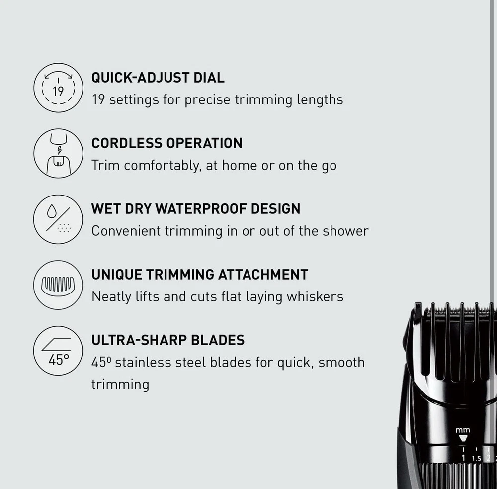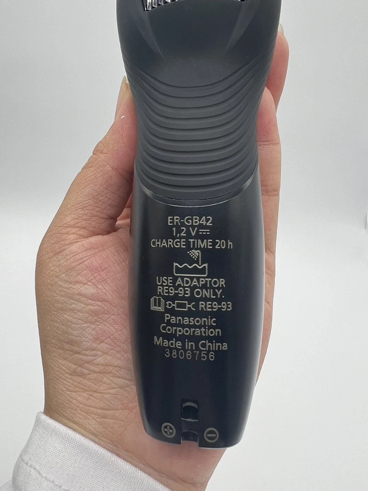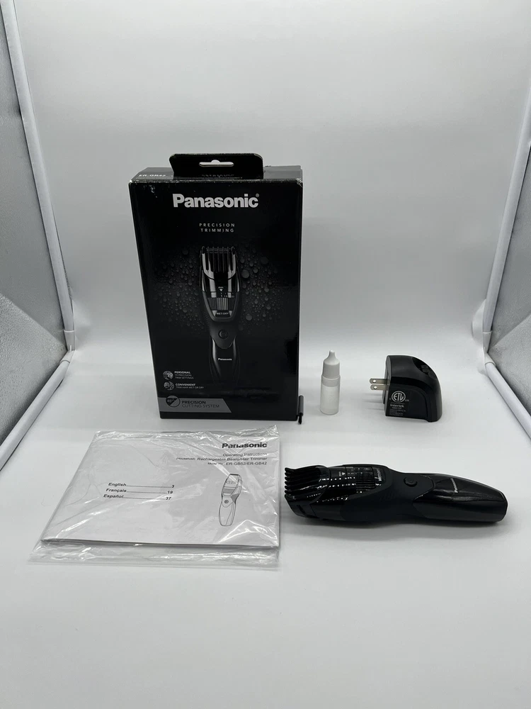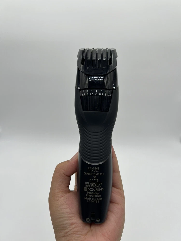 Panasonic ERGB42K Cordless Men's Beard Trimmer - Black (R3(18) Used, Tested it works. Personalized Cutting and Sculpting: An adjustable dial with 19 settings to get the exact look you want; included comb attachment raises flattened hairs for clean cutting. Cutting Length Steps: 19, Cutting Length Adjustment: 1.0-10 mm, Cutting Length w/o Attachment: 0.5 mm Precision 45-Degree Blade Cutting System: Ultra-sharp, hypoallergenic blades make this an ideal beard trimmer for men for quick, efficient hair, beard, and mustache grooming Rubberized, Ergonomic Grip for Maximum Comfort: Sleek design is easy to hold and gives total control for clean, detailed cutting and trimming Wet/Dry Mens Trimmer: Waterproof, 100 % washable cordless mustache trimmer lets you comfortably trim in or out of the shower Charges Fast & Travels Easily: The ER-GB42 beard trimmer charges quickly in AC wall adaptor for up to 50 minutes of use and packs easy. Order WER9606P replacement blade to maintain optimal trimming
