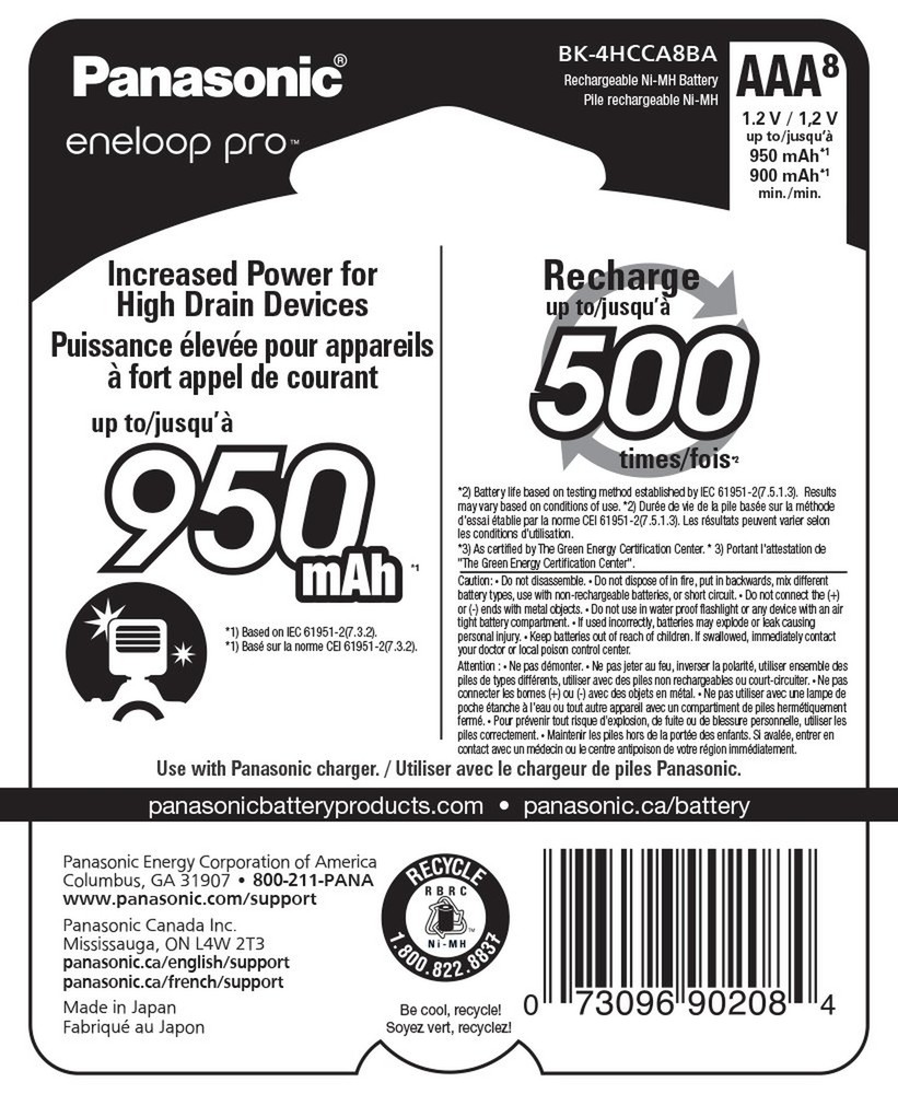 Eneloop Panasonic pro AAA Batteries (8-Pack) and Advanced pro 4 Hour Quick Charger Product Details Brand: Eneloop Battery Cell Composition: NiMH Unit Count: 1 Count Voltage: 1.2 Volts Reusability: Rechargeable Package Dimensions: 3 x 2.5 x 0.5 inches Item Weight: 3.2 ounces Date First Available: April 10, 2020 Contains 8 Panasonic eneloop pro AAA rechargeable batteries with up to 950mAh capacity. Can be recharged up to 500 times. Panasonic advanced eneloop pro charger can charge any combination of up to 4 AA/AAA batteries in 3 hours. eneloop pro batteries maintain up to 85% charge for up to 1 year and can be used in extreme temperatures down to -4F. LED indicators show charging status for each battery. Charging stops automatically when battery is fully charged. Includes retractable AC plug for easy storage and portability. Panasonic BK-4HCCA8BA eneloop pro AAA High Capacity Ni-MH Pre-Charged Rechargeable Batteries, 8 Pack Panasonic BK-4HCCA8BA eneloop pro High Capacity Ni-MH “Low Self Discharge” batteries utilize Panasonic's advanced rechargeable battery technology providing up to 2550mAh (AA batteries) / 950mAh (AAA) of power and the ability to be recharged up to 500 times. eneloop pro battery cells deliver consistent power performance, maintain 85% of their charge for up to one year, come pre-charged by solar power (at the factory) and are ready to use out of the package. These eneloop cells also have increased power, added storage life and extreme temperature performance down to -4 degrees Fahrenheit. Panasonic BQ-CC55KSBHA Advanced eneloop pro Rechargeable Battery 4 Hour Quick Charger with 4 LED Charge Indicator Lights, Black The Panasonic CC55 4-position Ni-MH battery charger can quickly and individually charge any combination of up to four AA or AAA eneloop pro rechargeable batteries in just 4 hours (one to two AA or AAA rechargeable batteries can be fully charged in up to just 2 hours) Four eneloop AA or AAA rechargeable batteries can be charged in up to 3 hours Individual charging means you can easily and efficiently charge from 1 to 4 batteries with differing levels of remaining charge A huge time saver! The CC55 charger also features 4 individual LED charge indicator lights Once rechargeable batteries are installed the charger measures each cell and the corresponding light indicates the remaining charge Green 80-100% Orange 20%-80% and Red 0%-20% After each battery reaches the next level of charging the LED light changes to indicate the cells charge level Once the rechargeable battery is completely charged the LED light turns off for that cell Ideal for use at home in the office or on the road this Panasonic CC55 charger is a quick and convenient way to recharge any combination of up to four AA or AAA Ni-MH eneloop pro eneloop or conventional Panasonic Ni-MH rechargeable batteries