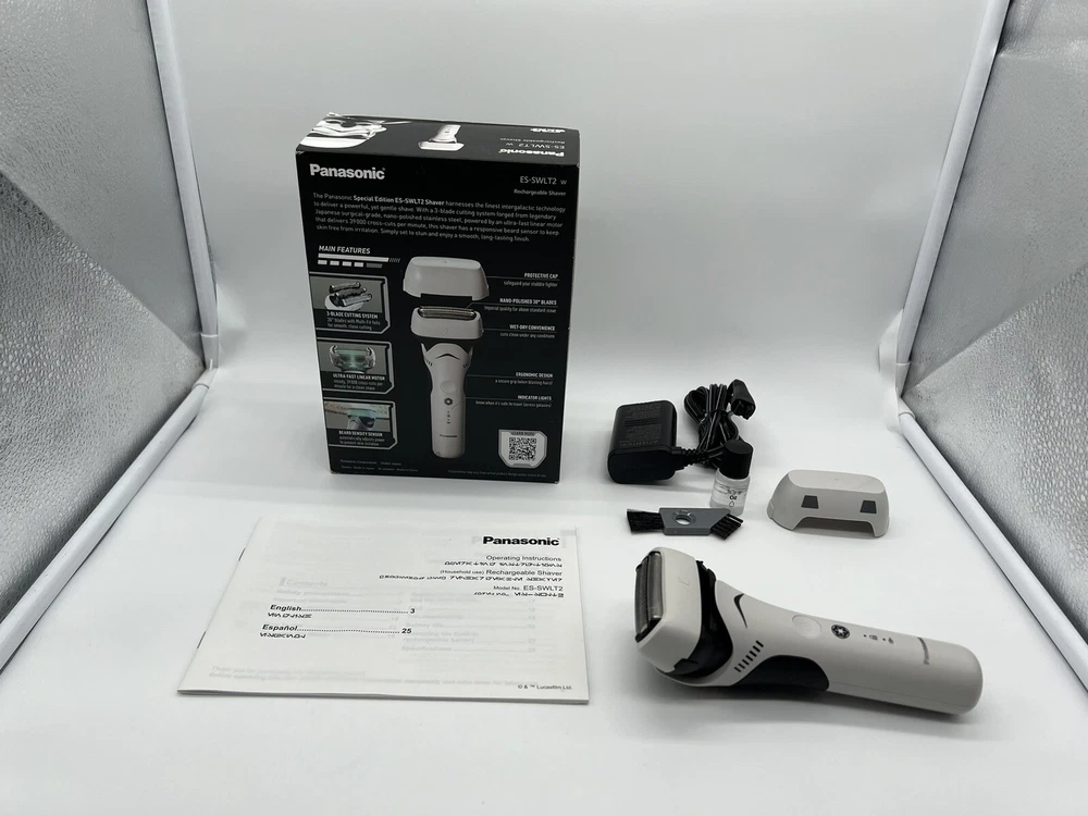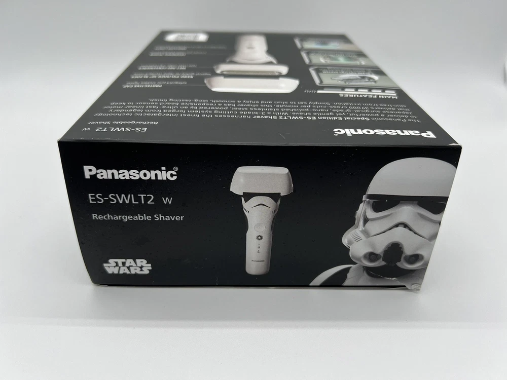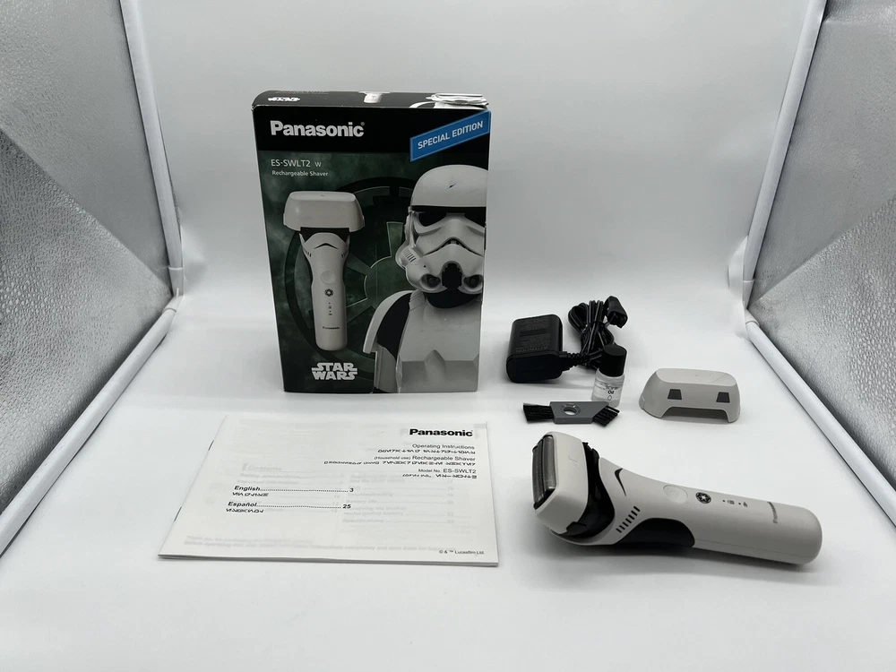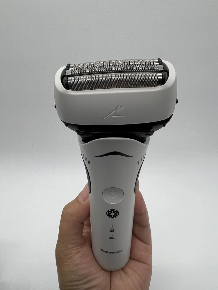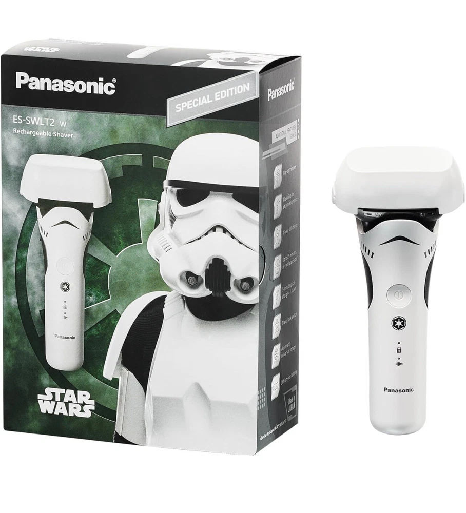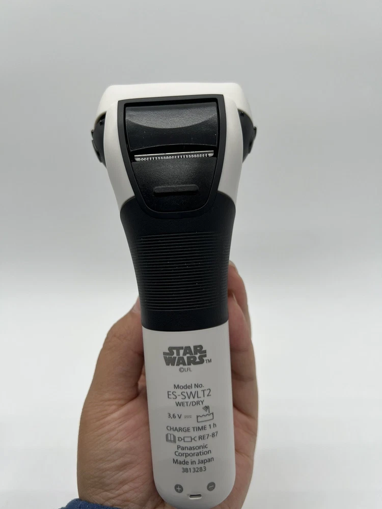 Panasonic Star Wars Stormtrooper Wet/Dry Electric Shaver with 3-Blade Cutting. Used, tested it works. Item: Q4(14) Special Edition Star Wars Shaver, Perfect for Fans: The new Panasonic ARC3 is designed in white and black to mimic the original stormtrooper armor; equipped with unique custom packaging designed to look great on any fan’s display shelf Harnessing the Finest Shave Technology in the Galaxy: The ARC3 shaver knows how to blast away stubble, with a 3-blade cutting system, powerful motor, and responsive shave sensor technology Premium, Nano-polished Blades and Foils: Hypoallergenic 30-degree blades are forged from the finest stainless steel in the galaxy; a pop-up trimmer lets you trim and sculpt your mustache and beard with precision Designed to Operate Under Any Wet or Dry Conditions: Waterproof design lets you shave wet or dry; mens shaver head washes clean easily by running under cool water Charges Up Quickly: Power up for your best shave with utmost efficiency; 1-hour charge for 45 minutes of use; 3-minute quick-charge for 1 shave