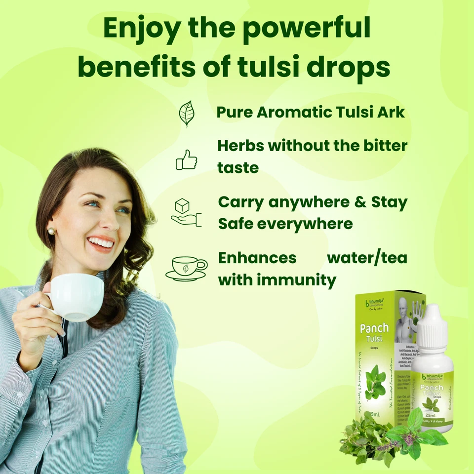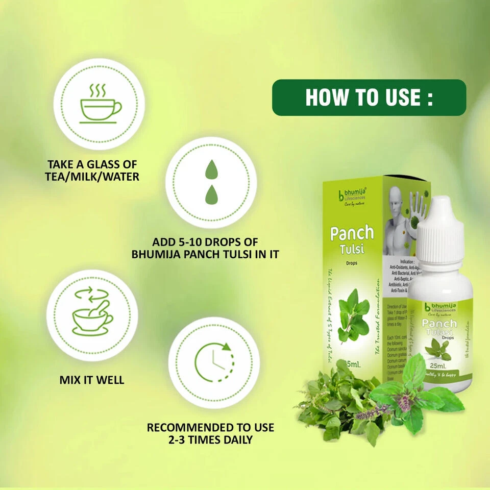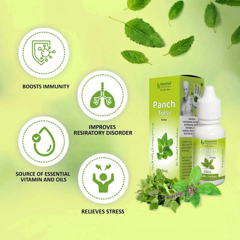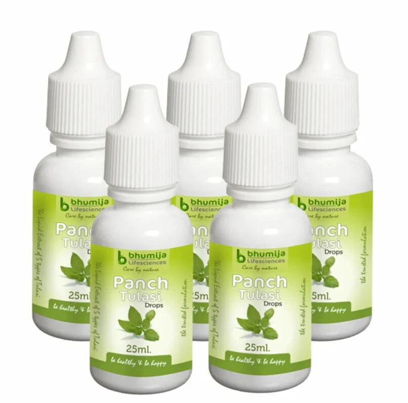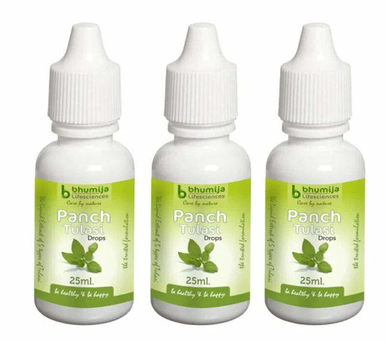 Bhumija Tulsi Drops Bhumija Lifesciences Panch Tulsi 25ml, The Unique Composition, Preparation of 5 types of Tulsi Ark- Nimbu Tulsi, Shyama Tulsi, Van Tulsi, Shwet Tulsi & Rama Tulsi. It is a Natural Imuniuty Booster. Panch Tulsi Ark has all the anti-inflammatory properties which may help lower inflammation, lowers the risk of heart disease, rheumatoid arthritis and inflammatory bowel conditions. Panch Tulsi Ark has super natural health benefit qualities and may helpful in all types of Allergies. According to Ayurveda, Tulsi can be useful in cough, cold, dyspnoea and hiccups. May also be helpful in sore throat, bronchitis, bronchial asthma and malaria. In Panch Tulsi Ark, Rama Tulsi helps to get rid of cold, fever, cough, etc where Shyama Tulsi helpful in immunity booster. So, a combination is perfect for an overall healthy life. FSSAI, GMP AND ISO APPROVED: Manufacturing of Our Bhumija Lifesciences Tulsi Ark, followed all the guideline created by government such as GMP (Good Manufacturing Practice) Under food and safety standards authority of India (FSSAI) License and ISO 9001-2015 certification. Dosages: 1-2 drops 3-4 times a day with Water, Tea or any Liquid or as directed by healthcare professional. Naturally derived ingredients with no side effects. Panch Tulsi Benefits: Tulsi has a lot of benefits. It has super natural health benefit qualities and helpful in all types of Allergies. It has beneficial effect on mind and body. It supports relaxation to mind and body. Scientists have also acknowledged the medicinal properties of tulsi. Tulsi keep away the deadly fevers like Dengue, Malaria, Swine Flu etc. The intake of tulsi is the best way of intestine cleaning. It is may very effective in any kind of gynaecological problem. So, our Bhumija Lifesciences Panch Tulsi Drops is may very effective in cough, cold, acidity, constipation, stomach pain, abdominal pain, and Viral or Seasonal fever, swelling in Lungs, hypertension, chest congestion, fatigue, vomiting, obesity, arthritis, asthma, anaemia and ulcers. It promotes the purifying the blood and increases the immunity of human body. It may also work in controlling diabetes. It supports Anti- Bacterial and Anti- Viral Action. Panch Tulsi is disease resistant. It is said that it has world's best anti-oxidant, anti-aging, anti-bacterial, anti – septic, anti-viral, anti-flu, anti-biotic, anti – inflammatory, and anti-disease properties. Panch Tulsi Drop is made by using extract of 5 types of Tulsi like Shyam Tulsi, Rama Tulsi, Shwet Sursa, Van Tulsi and Nimbu Tulsi. Tulsi is useful in more than 200 diseases like flu, swine flu, dengue, joint pain, stone, blood pressure excess weight, sugar, allergy, hepatitis, burning, urine related problem, gout, piles, pariah, haemorrhage, swollen lungs, ulcer, stress, lack of semen, tiredness, loss of appetite, vomiting, hiccups, stomach ache, stomach bug etc. Mix 2 drops of T5 Tulsi Drop with honey to get relief from cold, cough, sneezes and headache. It's may very effective in winters in unconscious condition put drops of Panch Tulsi Drop with salt in nose. It’s very effective. May beneficial for cancer patients. Mix 2-3 drops of Panch Tulsi Drop with curd take it. Take maximum curd & milk as food. May beneficial for a child suffering from cold, cough or loose motions, mix one or two drops of Panch Tulsi Drop with honey & give to the child. After lunch have one drop of Panch Tulsi Drop, it may help to cure stomach related diseases. Panch Tulsi Drop support relieves in itching, eczema etc and all other skin related diseases & wounds. Panch Tulsi Drop support purifies blood, and may helpful to increase haemoglobin. Daily intake of 4-5 drops of Panch Tulsi Drop may controls nausea & vomiting in pregnancy. A friend of women in all problems. Especially support in fire burns or any poisonous insect attack. To control hair fall & premature greying of hair & dandruff, you may use 8 -10 drops of Panch Tulsi Drop with aloe herbal hair oil and apply on the head & forehead. For best results apply this at night & wash it in the morning. In ear pain and ear flow, pour one drop of Panch Tulsi Drop in each ear may helpful. In Tooth pain, cavity, bleeding gums, have gargles with warm water mixed with 4-5 drops of Panch Tulsi Drop may helpful. To get rid of bad breath have 1-2 drops of Panch Tulsi Drop daily after meals may helpful. Throat pain, ulcers may be relieved by Panch Tulsi Drop. In asthma and cough have Panch Tulsi Drop with ginger ras and honey in the morning and evening, may be effective. At night mix 8-10 drops of Panch Tulsi Drop in body oil, it may relieve you from mosquito bite and you will have a sound sleep. Mix 8-10 drops of Panch Tulsi Drop in water cooler. It may help to keep your house free from mosquitoes and makes the environment bacteria free, clean and pure. Lice: Equal quantity of Panch Tulsi Drop & lime juice to be applied to the hair & kept for three hours. Wash hair, the lice may be dead. Panch Tulsi Drop may very useful for heart. It supports in cholesterol level, decreases and reduces blood clots, heart attack and stroke. At the time of bath, mix 8-10 drops of Panch Tulsi Drop in water and have bath. It may help you to keep disease free skin. It is very supportive in skin problems & eliminates stress. Use 1 drop Panch Tulsi Drop in one glass of water or tea or 2 drops in 1 litre water. It may provide you a bacteria-free, healthy and hygienic water. IMPORTANT: As with any supplement, if you are pregnant, nursing or taking medication, consult your Healthcare Professional before use, Discontinue use two weeks prior to surgery. All product statements on this website provides general information. Directions For Use: 1. Mix 2-3 drops in glass of water, tea, juice and more. 2. Mix well 3. Consume daily twice a day after a meal Note: It is recommended to suggest it to a healthcare professional before starting to use the Bhumija Shilajit Resin. Remember, shilajit can lower blood pressure, so